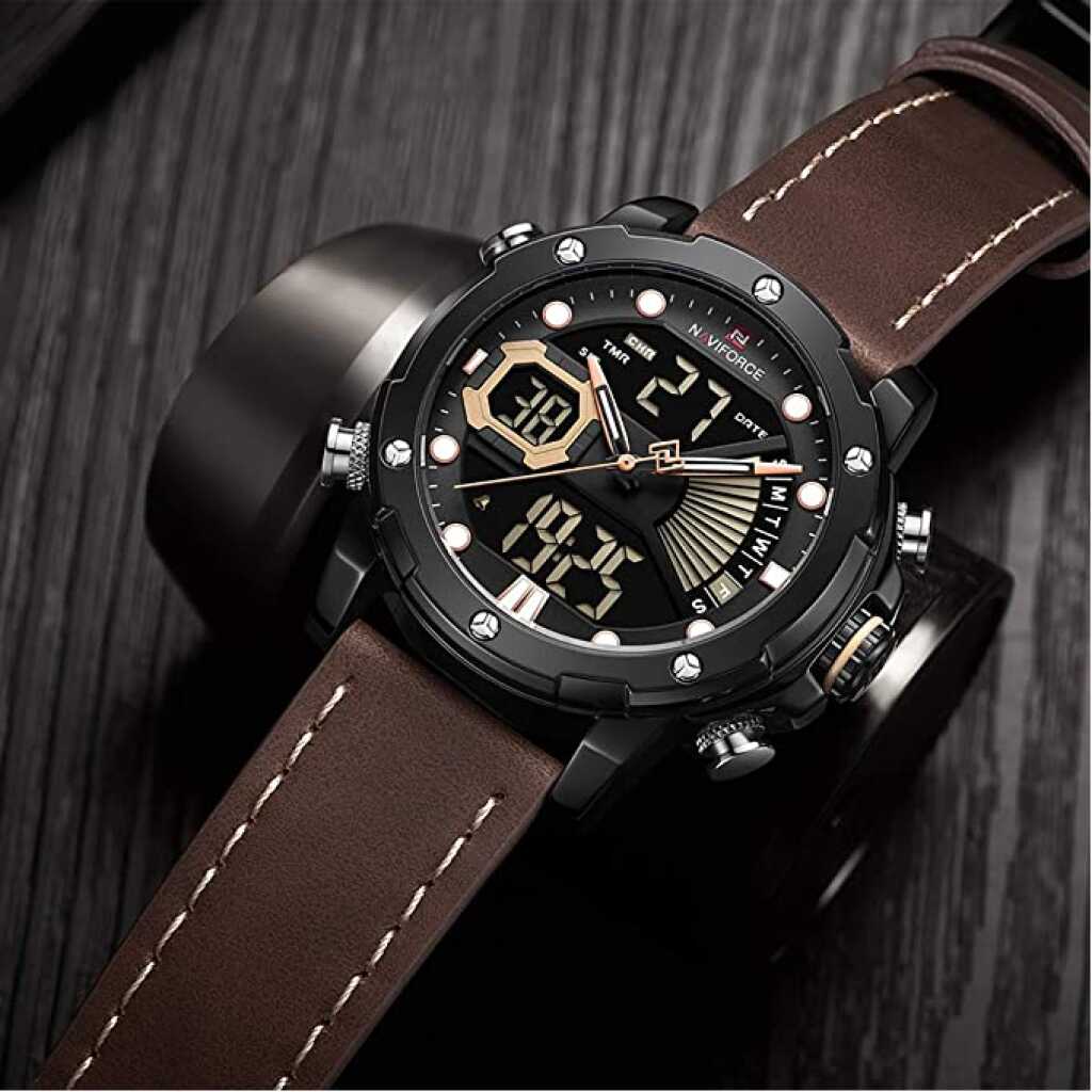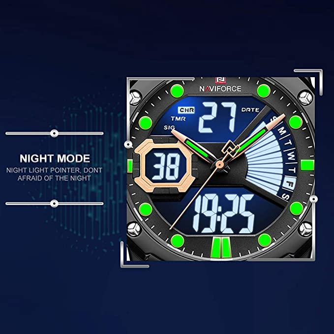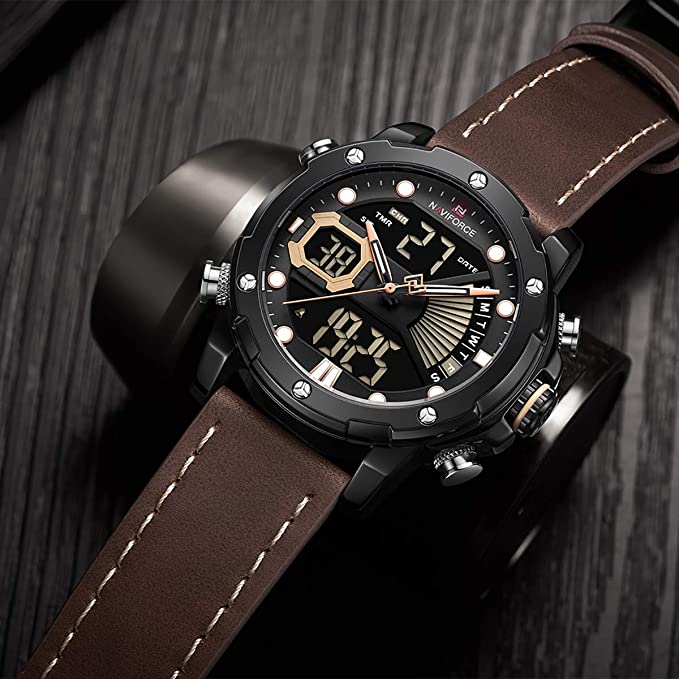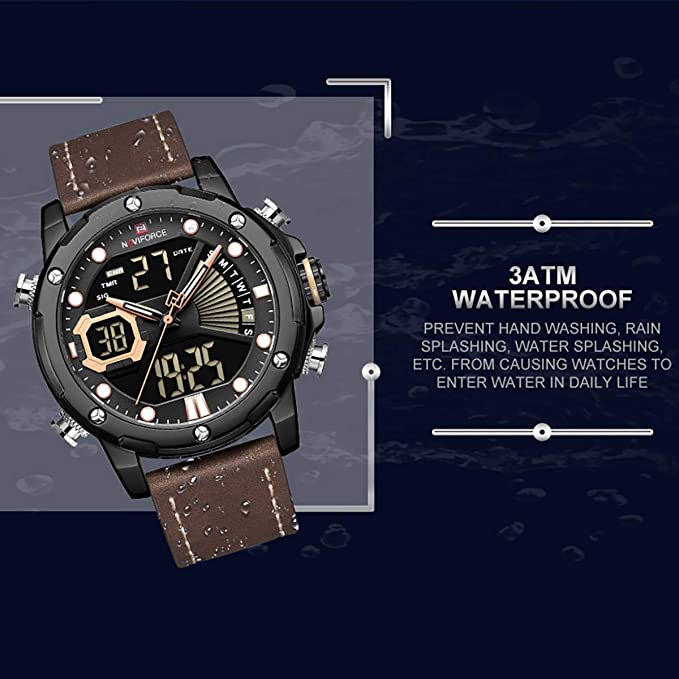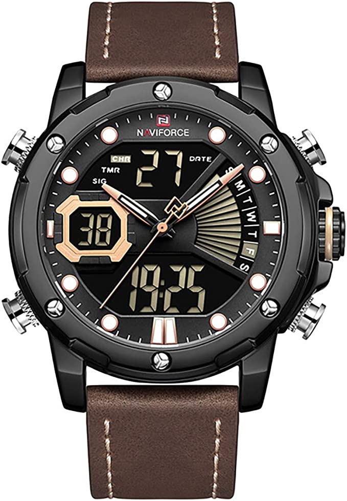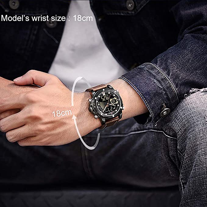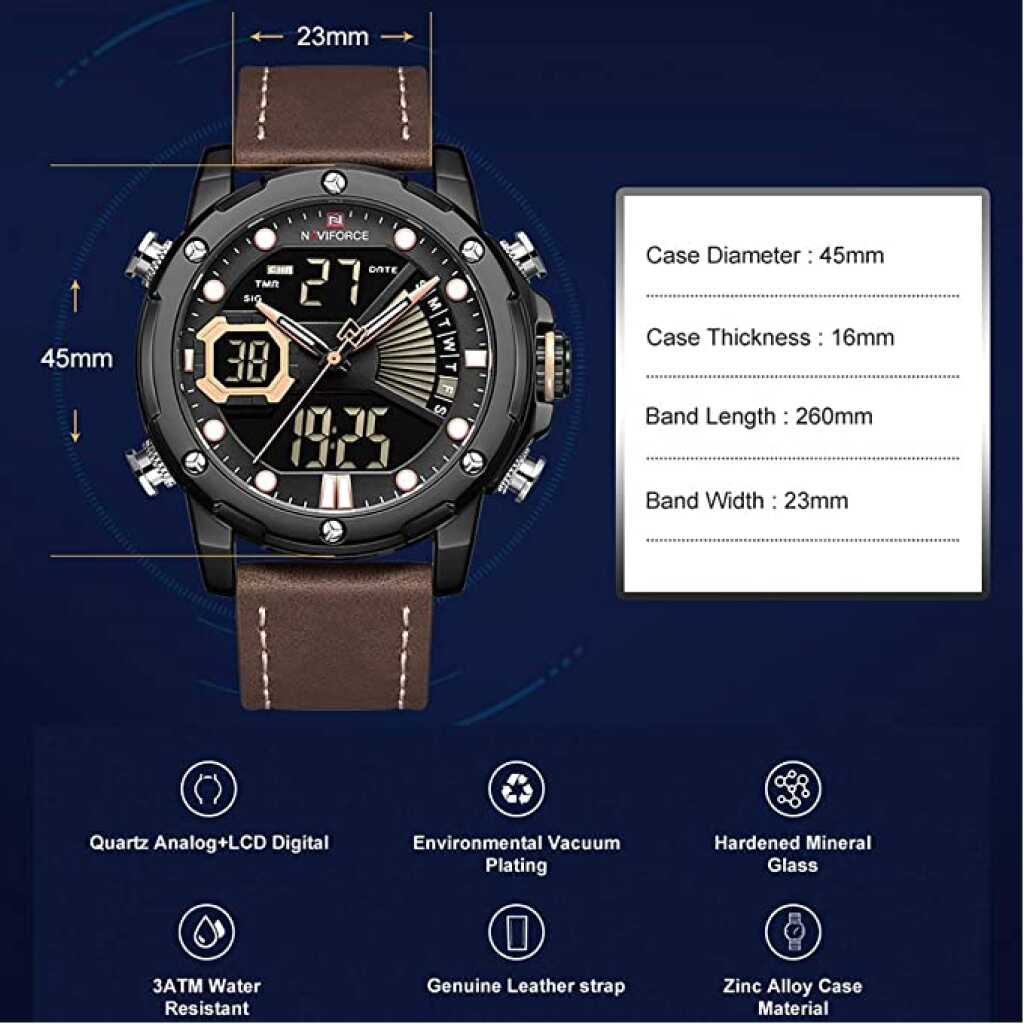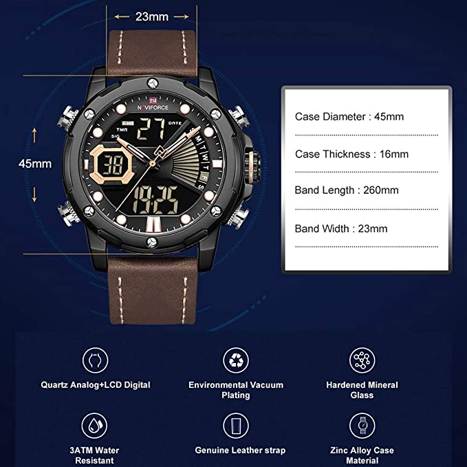 Key Features: NAVIFORCE 9172 Men’s Watch – Business Fashion Luxury – Digital Quartz Dual Time Display – Casual Japanese Quartz Watches. [DIGITAL MULTIFUNCTIONAL] * Analog-digital Dual Display, 1/100-Second Stopwatch, LED Display?Week Display, Day and Date, Luminous Hands, Complete Calendar, Shock Resistant [IMPORTED MOVEMENT] * Reliable Japanese Miyota Quartz Movement, Ensure Precise Time Keeping ±1s Deviation Per Day. [Waterproof to 30M/99feet/3ATM] * In general, Withstands Rain And Splashes Of Water, But Not Swimming Or Submersion [SIZE RANGE & SPECIFICATION]*Case Material: Stainless Steel,Band Material Type: Leather,Dial Diameter: 45mm,Case Thickness: 16mm,Band Length: 260mm,Band Width: 23mm [CUSTOMER SERVICE] * We offer 60 Days of Free Replacement (or FULL Refund) And 1 Year After Sales Service For Watches.