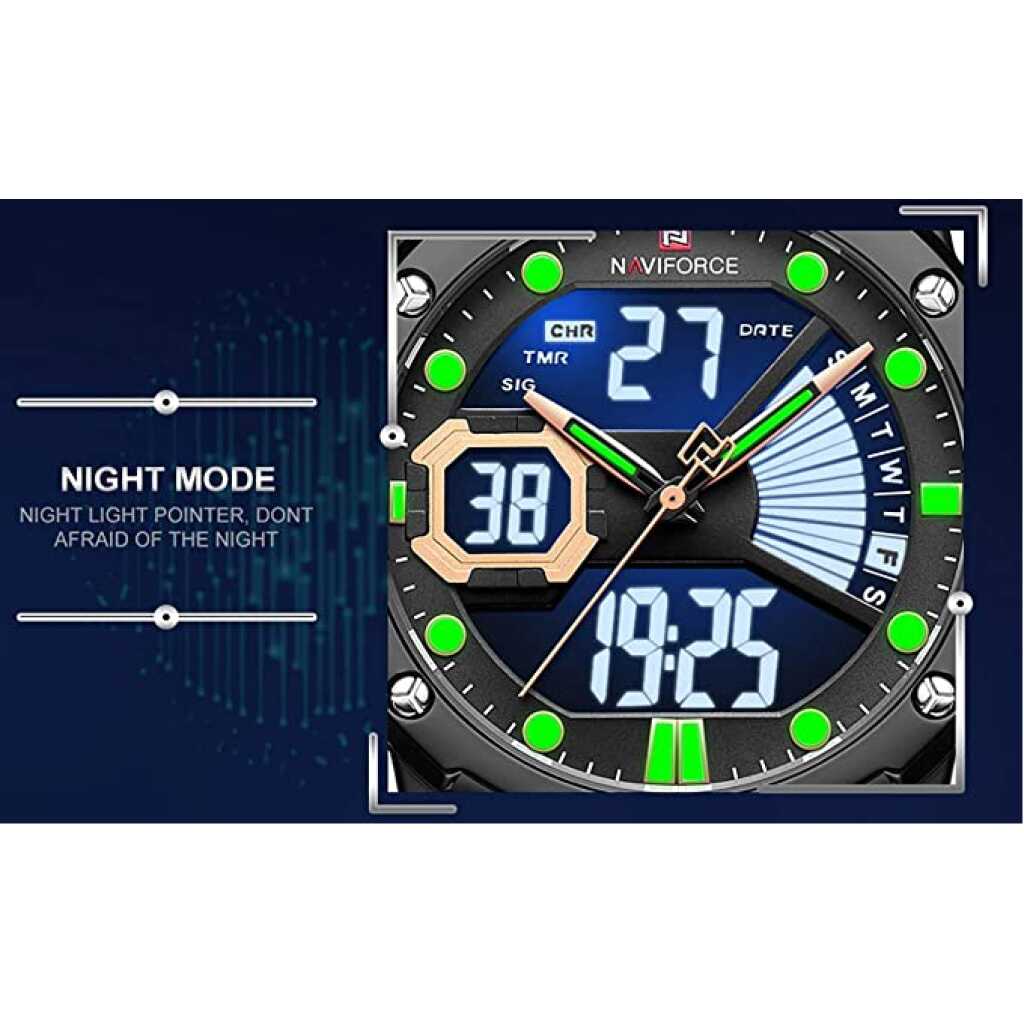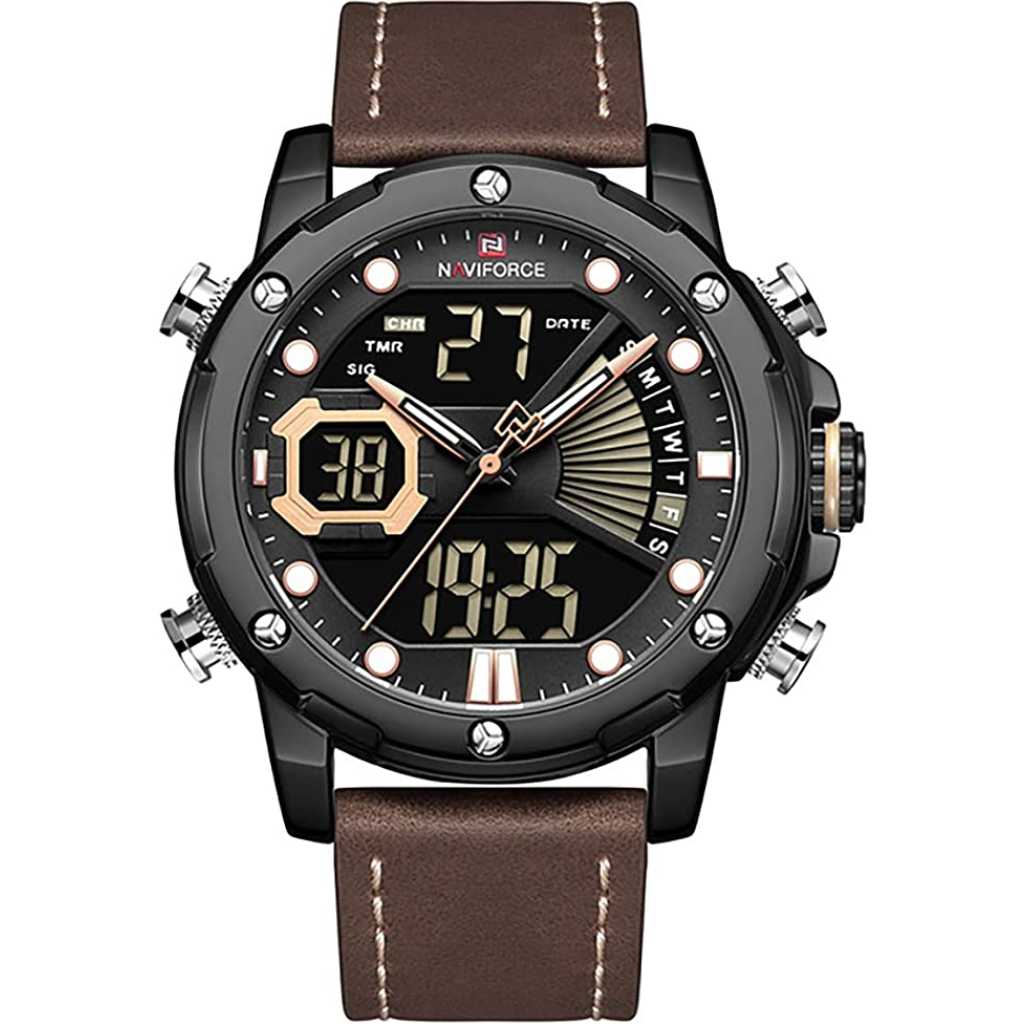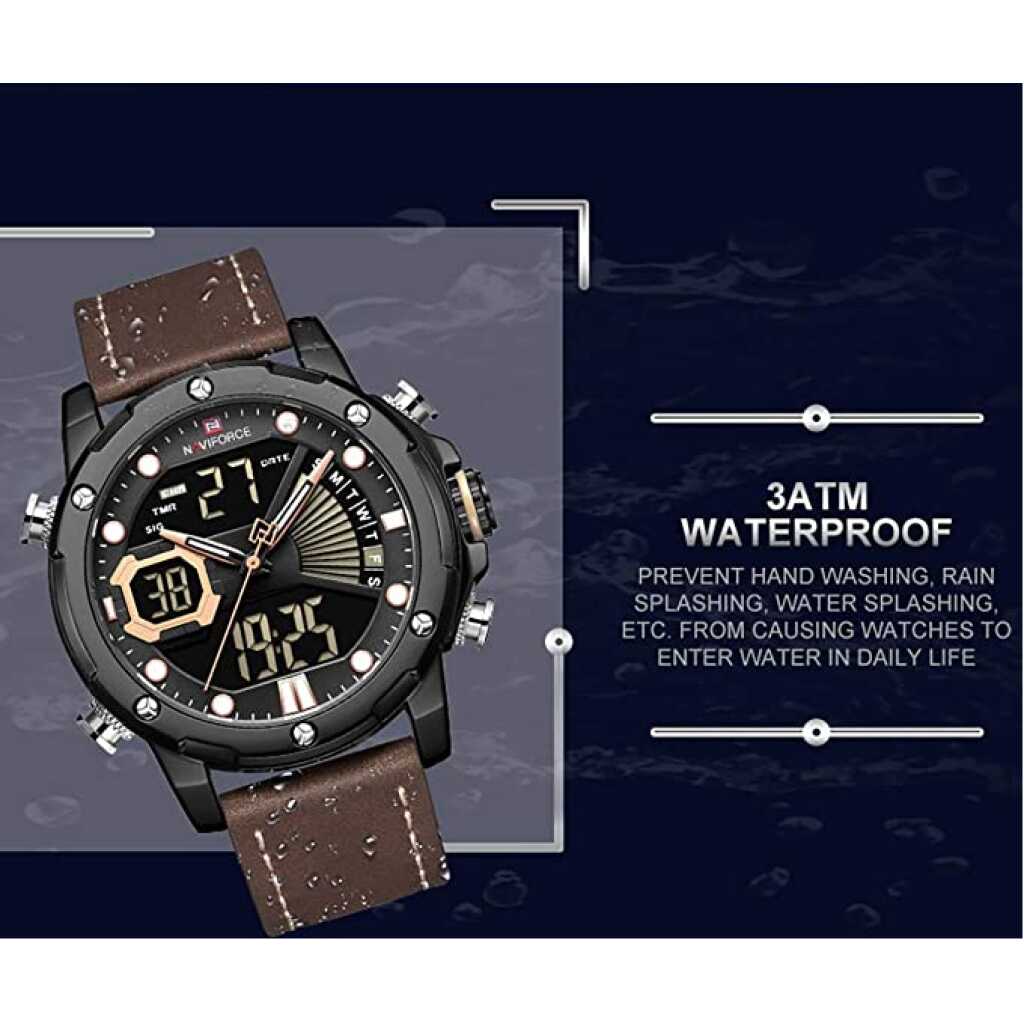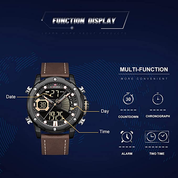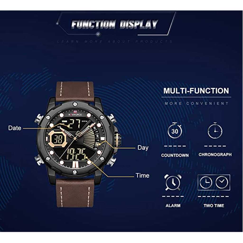 NAVIFORCE 9172 Men’s Watch – Business Fashion Luxury – Digital Quartz Dual Time Display – Casual Japanese Quartz Watches. Brand Name: NAVIFORCE Style: Fashion & Casual Clasp Type: Buckle Water Resistance Depth: 3Bar Movement: Dual Display Movement: QUARTZ Case Material: Stainless Steel Band Length: 26cm Dial Window Material Type: Hardlex Case Thickness: 16mm Band Width: 23mm Case Shape: Round Item Type: Quartz Wristwatches Boxes & Cases Material: No package Model Number: NF-9172 Band Material Type: Leather Feature: Shock Resistant Feature: Luminous Hands Feature: Stop Watch Feature: LED display Feature: Auto Date Feature: Week Display Feature: Water Resistant Feature: Chronograph Feature: Back Light Feature: Alarm Dial Diameter: 45mm