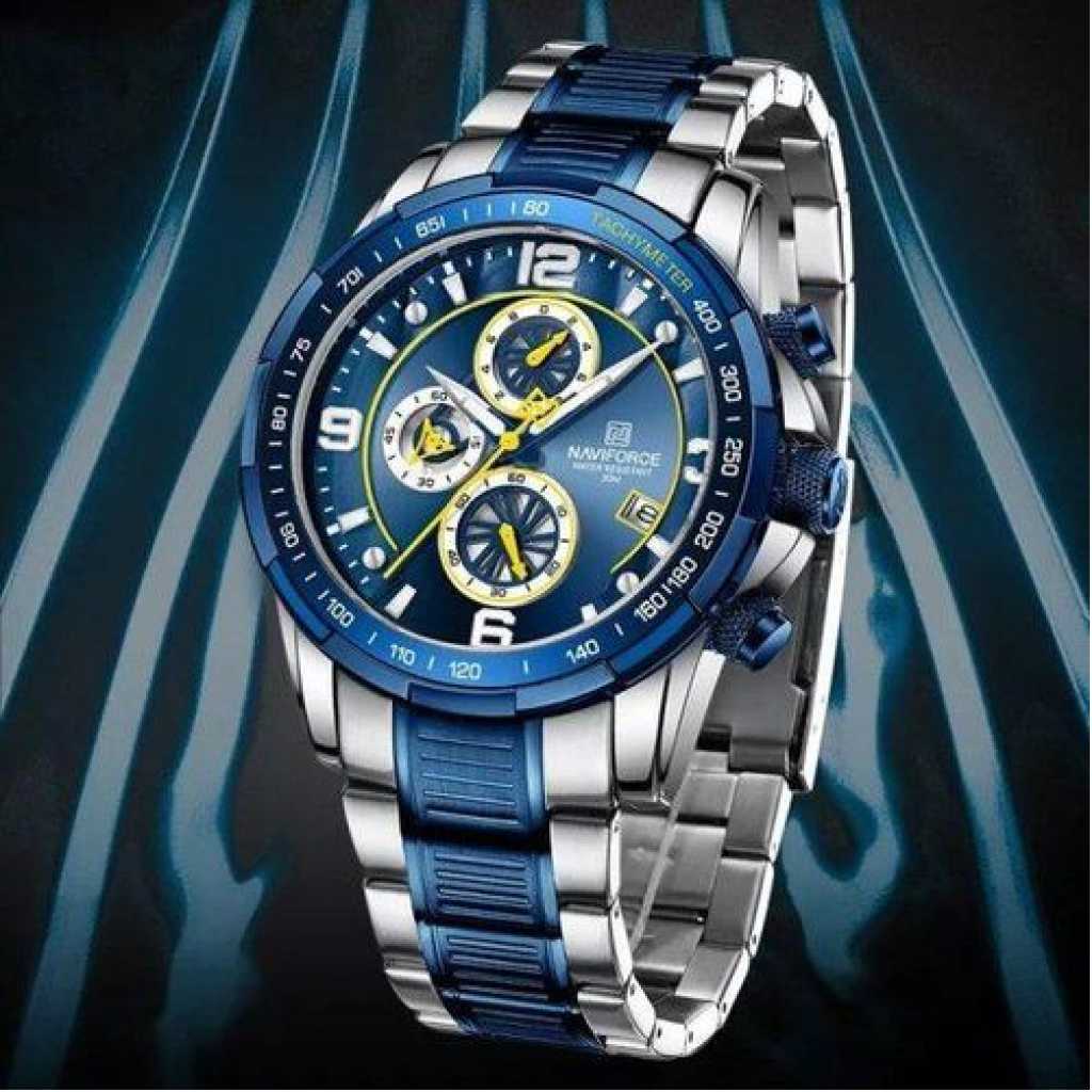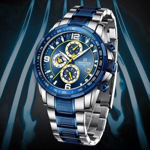 Naviforce Chronograph Waterproof Stainless Dated Men’s Watch -Blue, Silver Naviforce Men Gentle Analog Wrist Watch with Stainless Steel Straps – Silver This classy Wrist Watch is a beautiful time piece for the beautiful you. The high-quality stainless steel straps and clean dial ensures it is a luxury addition to your outfit. It is one to wear for both formal and casual occasions.