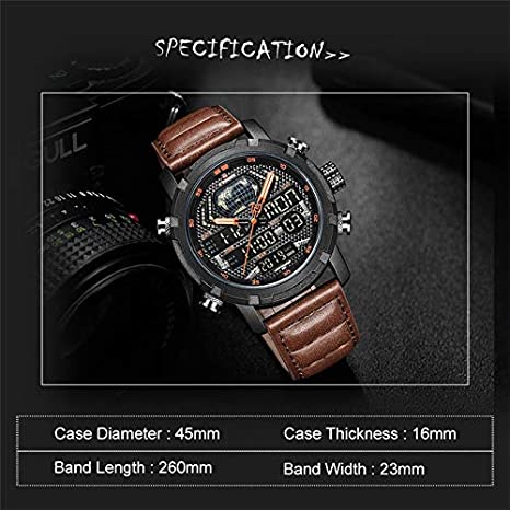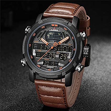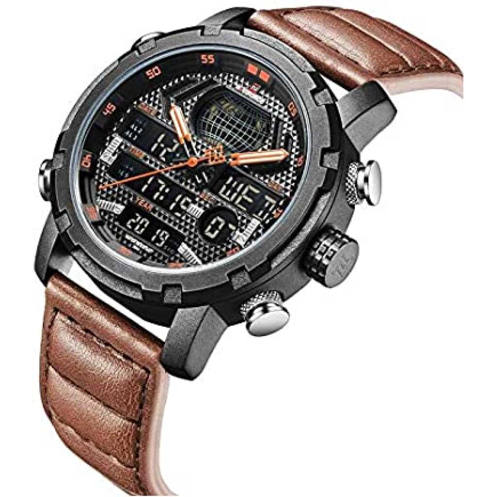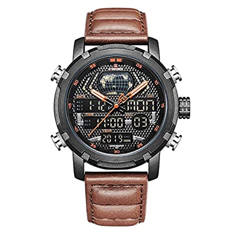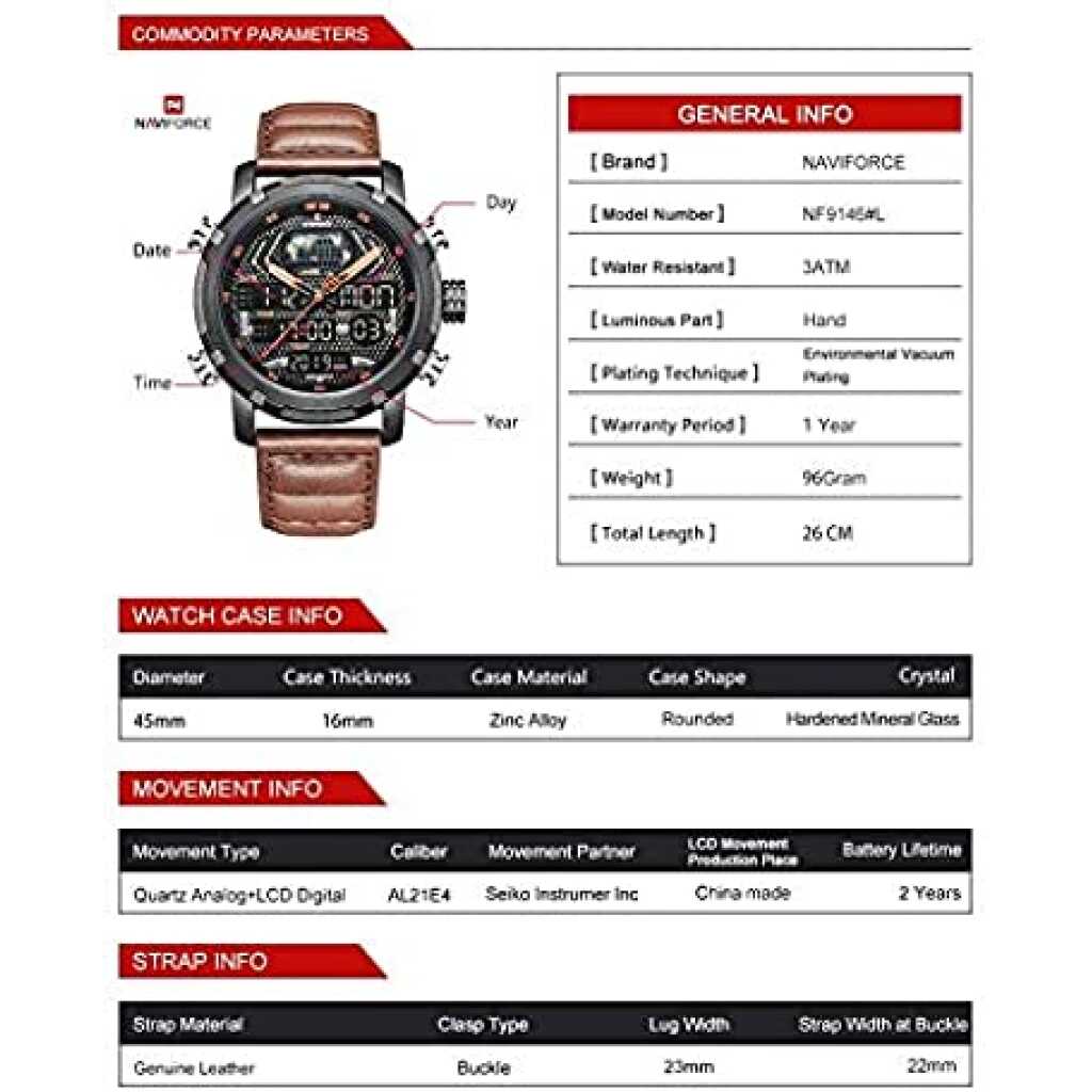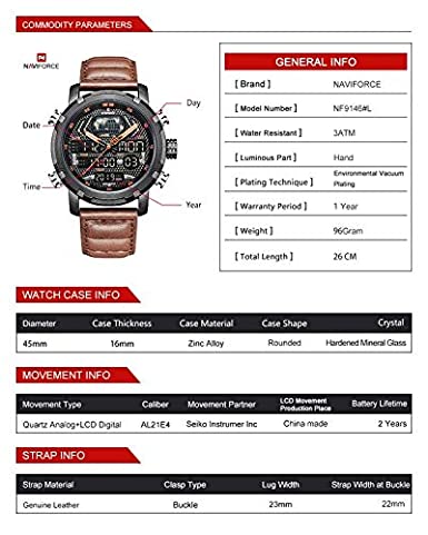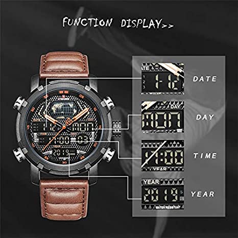 Key Features: Naviforce Dual Display Chronograph Date Military Digital Analog Sport Men’s Wrist Watches -NF9160. New and high-quality Genuine Brand comes in an Original Box. This classic watch, has date and Week functions, a precise movement display, and a multi-function display. The perfect combination of fashion and sport. The leather band ensures comfortable touch, a chic look, and a strong performance. Mineral reinforced mirror, high-end steel strap, anti-scratch, and wear-resistant, classic and stylish appearance, never out of time Please check the Images for a complete description. Quartz movement, making sure you have the most precise time in hand. Features: Water Resistant, Auto Date, Week, Display, Leisure Army Military design Men’s watch 3ATM water resistance, prevent accidental contact with water, such as rainwater splash or washing hands (Please don’t press any key underwater)