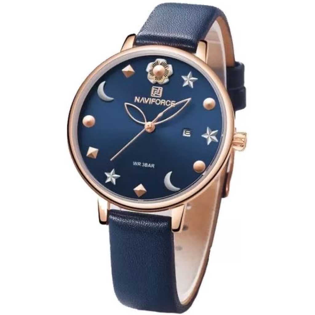 It’s a ladies less weight office and casual analog watch. It’s made of a stainless steel metal face and a fuax leather straps. It has blue straps which gives it a unique appearance. Key Features: Color blue Leather Analog Casual and office Quartz