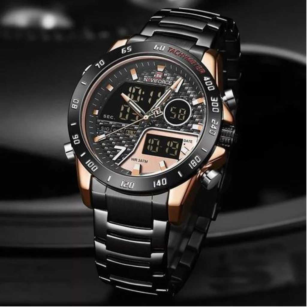Naviforce Luxury Waterproof Digital And Analog Watch – Black It’s a naviforce stainless steel digital And Analog Men’s waterproof designer watch. This watch is made of black and rose gold colors which gives it a unique appearance. This watch has back light which enable the user to tell time even at night.