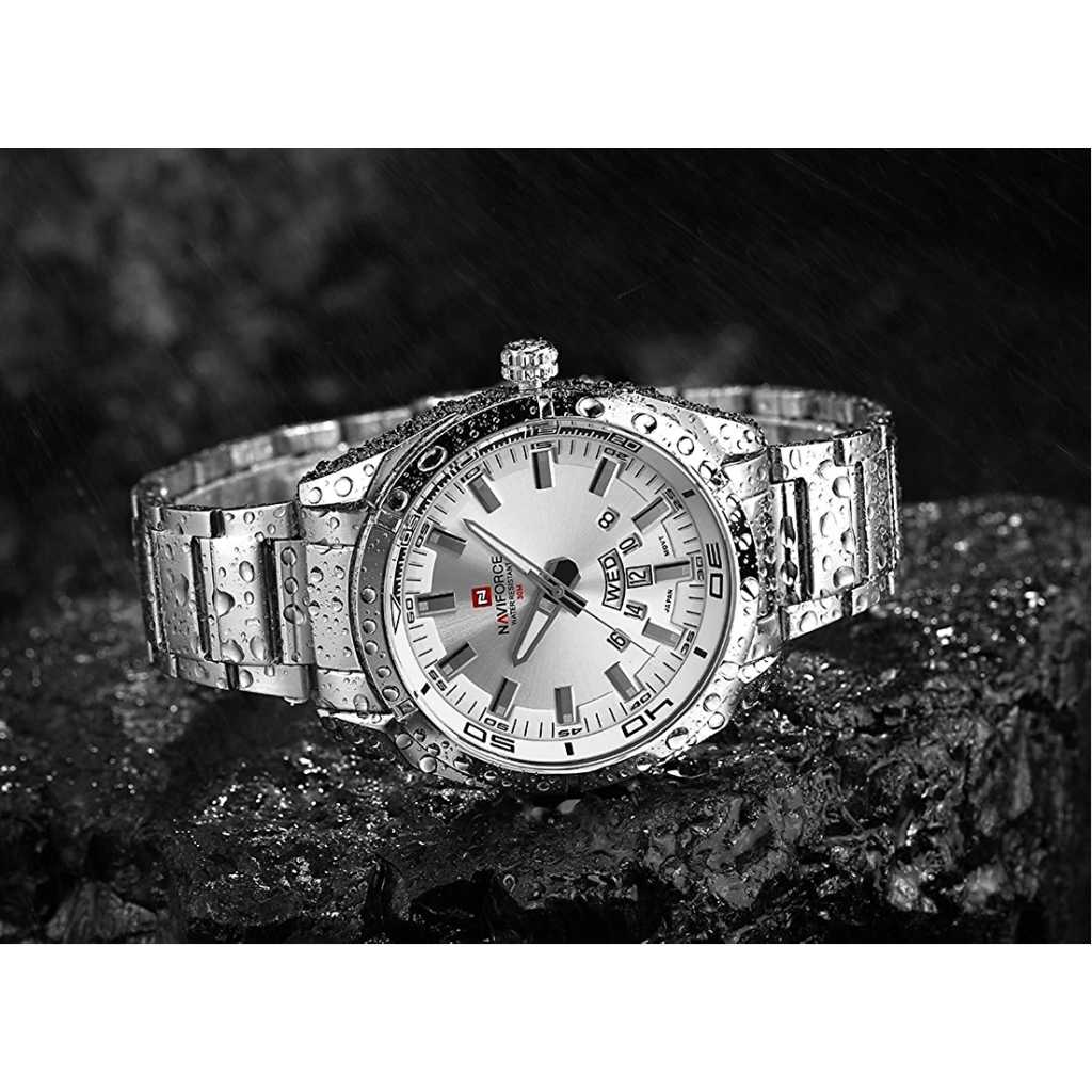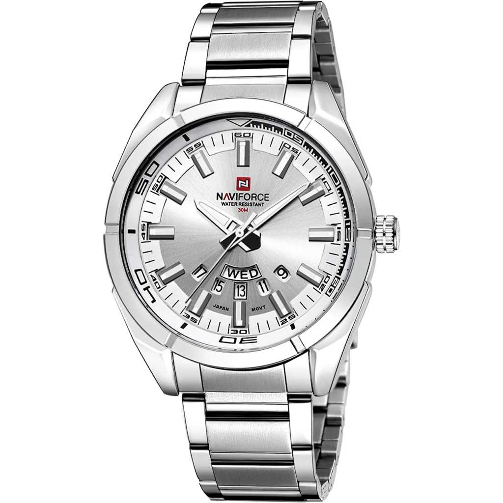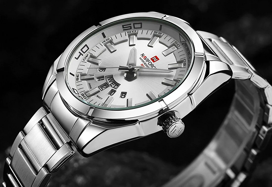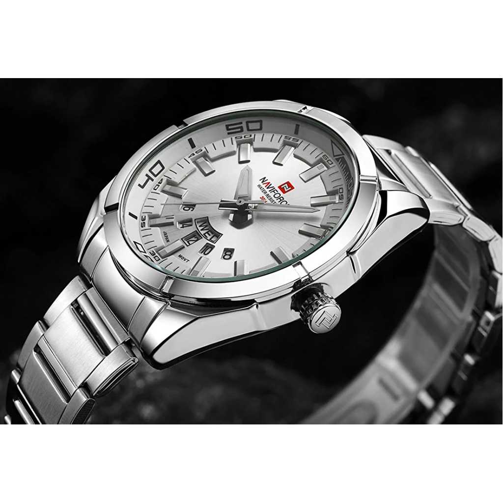 NAVIFORCE Men’s Sports Watches Waterproof Military Quartz Leather Strap Date Wrist Watch – Silver. Features: Imported Japanese movement provides precise and accurate time keeping. Time and week and date display, stylish and precise scale on the dial makes it more luxurious. Durable stainless steel back and watch strap, double deployment clasp. Luminous hands and easy to read time Water resistant to 30 meters, ideal for business, casual, indoor activities and daily use. Material: Case Material: Stainless Steel Band Material: Stainless Steel Mirror Surface: High Hardness Mineral Glass (Scratch Resistant) Specification: Band Material: Stainless Steel Case Material:Zinc Alloy Band Width:2cm Case Thickness: 1.2cm Case Diameter:4.5cm Maximum fit wrist diameter: 7 cm. Buckle: double locking, fold-over clasp. Product weight: 120g Battery Code: Seiko626 Note: Please DO NOT PULL OUT the Button Underwater. Also avoid use in extreme hot or cold temperature. If mist or droplets found inside watch surface, please contact us immediately for maintenance to prevent moisture corrosion of the internal components. Clean the strap by a soft cloth on regular bases is highly recommended. Too much water contact will shorter watch life.