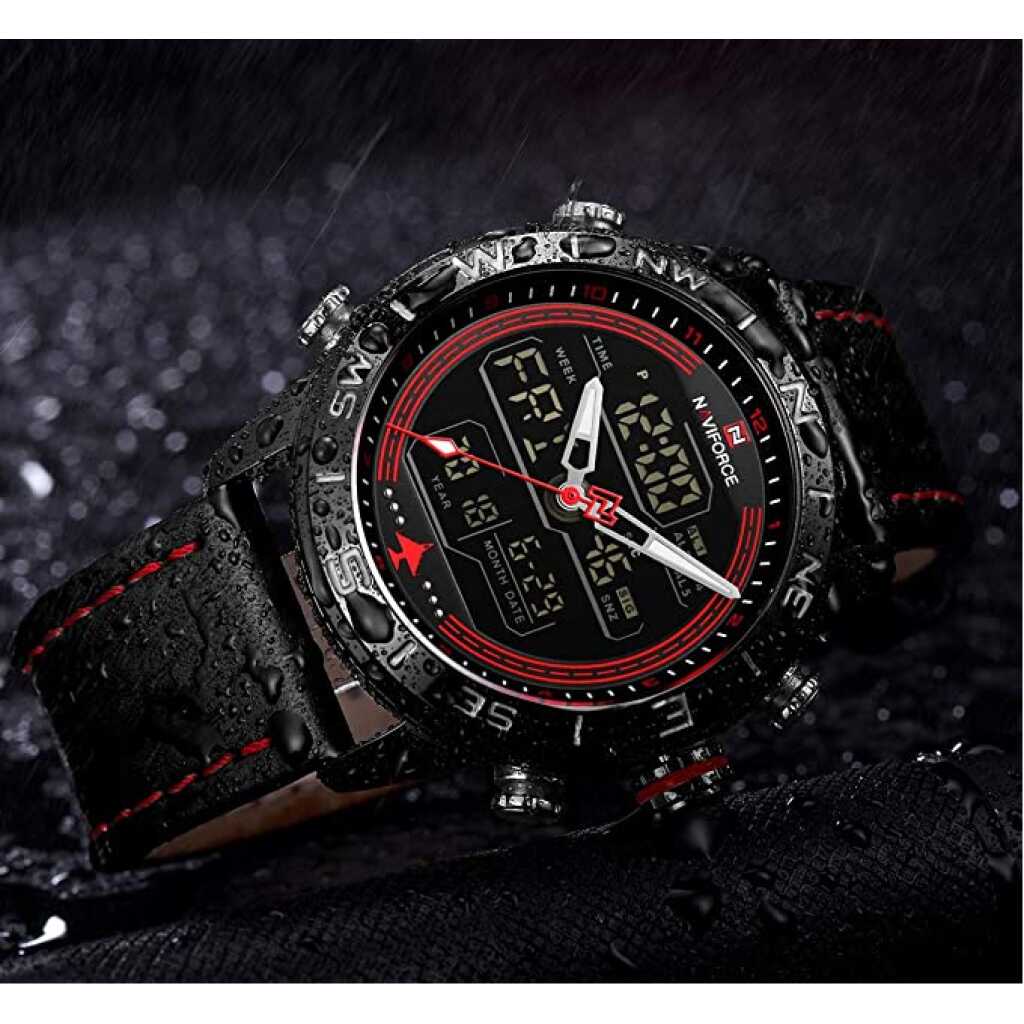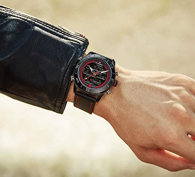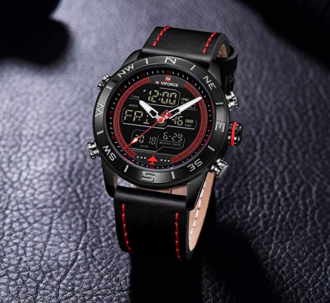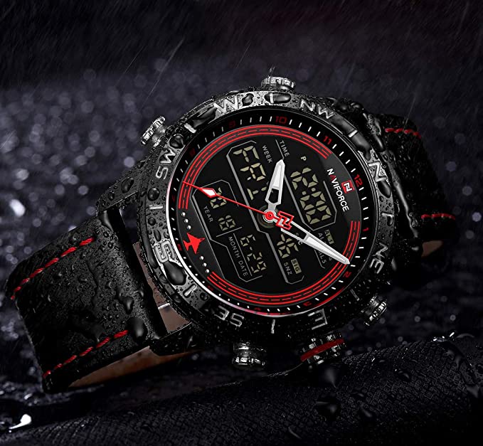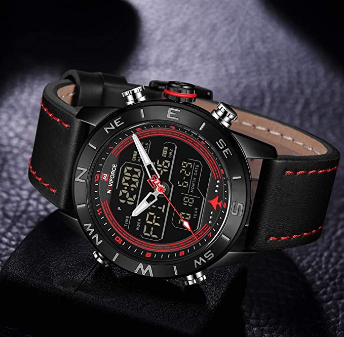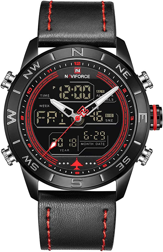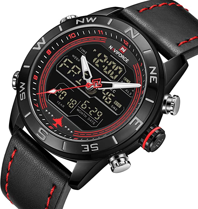 Key Features: NAVIFORCE Men’s Waterproof Sport Watches Leather Digital Analog Watch Luxury Casual Dual Time Wristwatch. 30M Water resistant: daily use waterproof, washing hands, raining or splashing. Not suitable for swimming, diving, shower. The waterproof sport watch has an 8-digit multi-function display, which can display the time, minute, second, day, month, week, dual time, and 12 /24-hour time format selection. Multi-Function Watch: Alarm, hourly chime,1/100s chronograph, Luminous hands. Precise Japanese quartz movement keeps accurate time, the sports watch is made of 245mm genuine leather, and the buckle of the watch is a pin buckle design. The watch has a backlit display that makes it easy to view the time even at night.