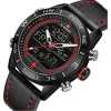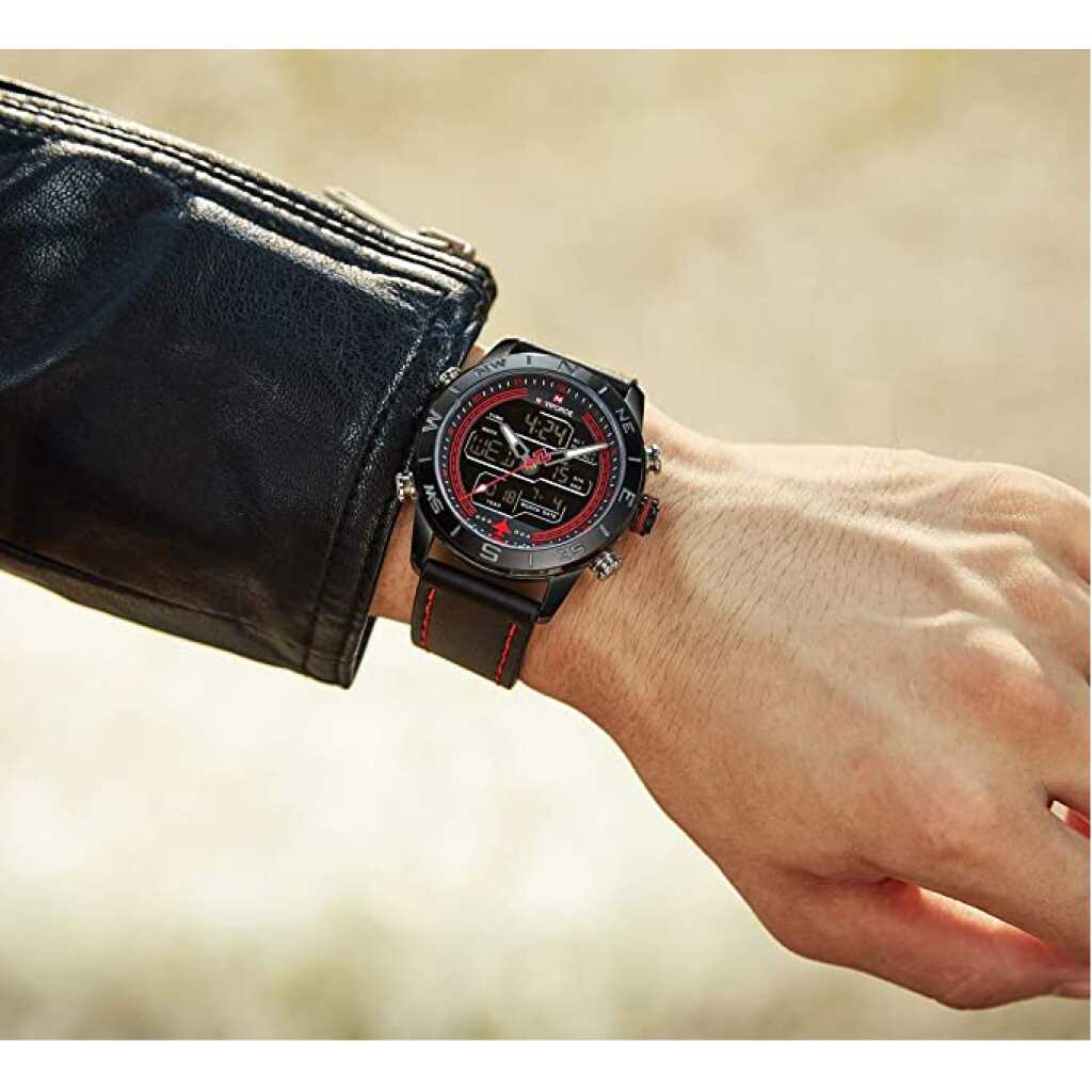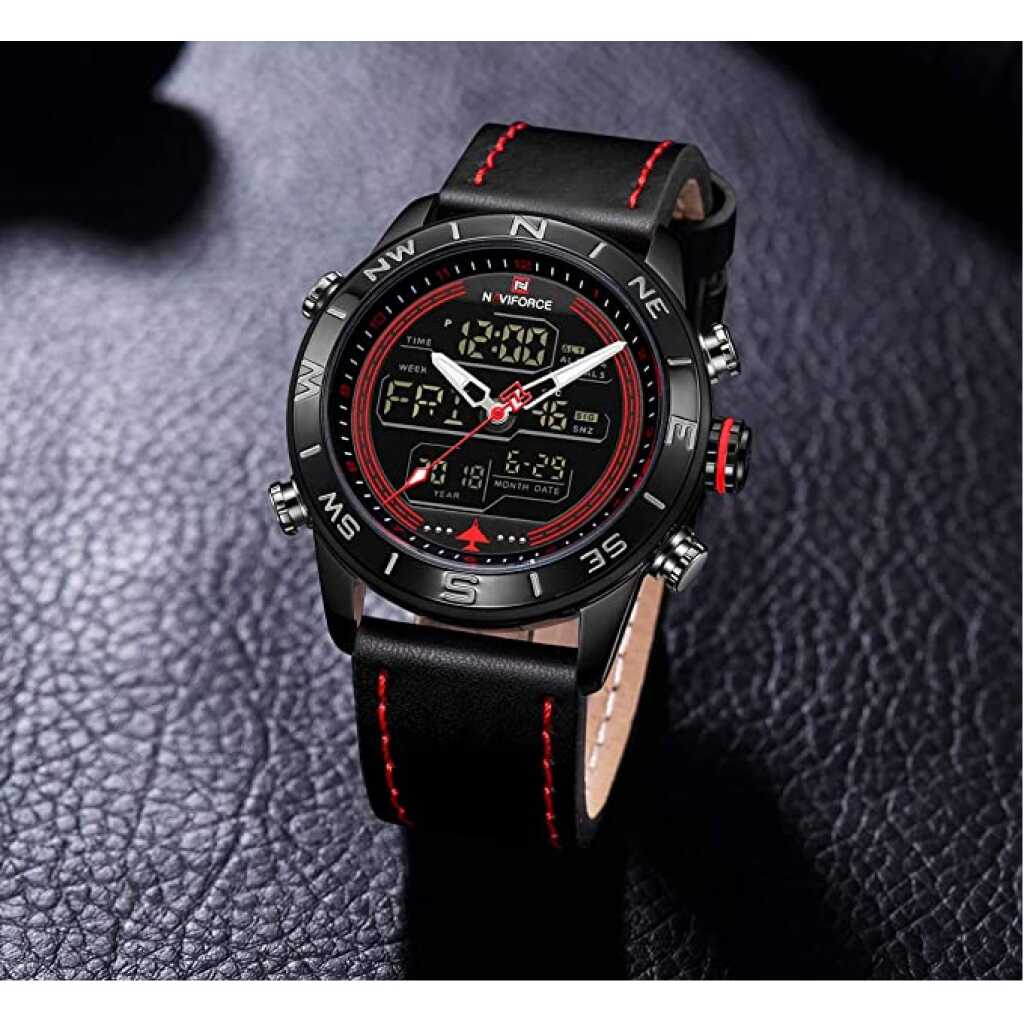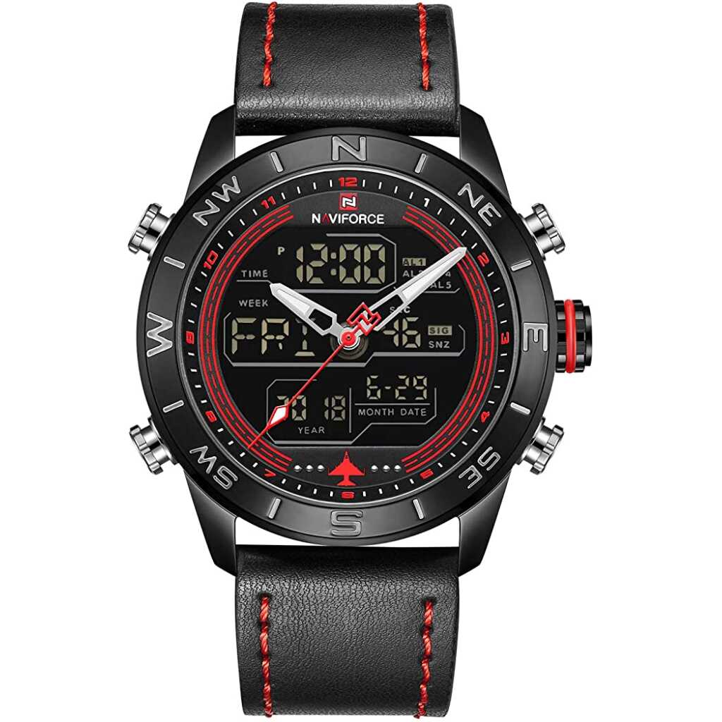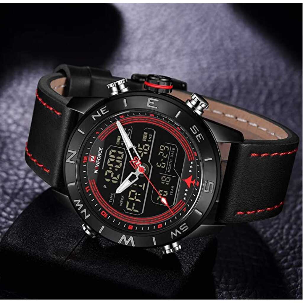 Key Features: NAVIFORCE Men’s Waterproof Sport Watches Leather Digital Analog Watch Luxury Casual Dual Time Wristwatch. 30M Water resistant: daily use waterproof, washing hands, raining or splashing. Not suitable for swimming, diving, shower. The waterproof sport watch has an 8-digit multi-function display, which can display the time, minute, second, day, month, week, dual time, and 12 /24-hour time format selection. Multi-Function Watch: Alarm, hourly chime,1/100s chronograph, Luminous hands. Precise Japanese quartz movement keeps accurate time, the sports watch is made of 245mm genuine leather, and the buckle of the watch is a pin buckle design. The watch has a backlit display that makes it easy to view the time even at night.