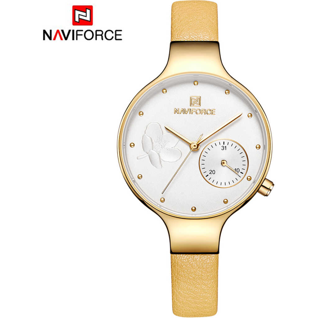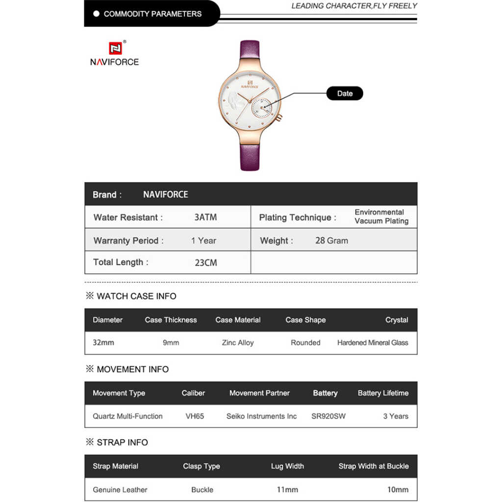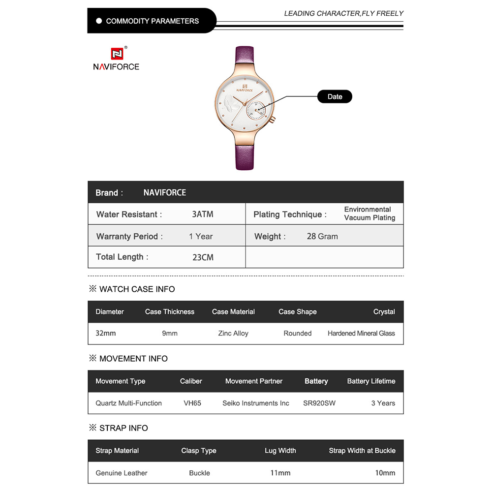 Key Features: NAVIFORCE NF5001 Women Fashion Quartz Brand Watch Lady Leather Watchband Casual Waterproof Wristwatch Gift for Wife Girlfriend Family. • Three-dimensional engraved flower dial. • Leather needle buckle makes an adjustment for your wrist more flexible. • Watch band is comfortable to wear and durable to use • Date and hour display, the new creative timekeeping features, keep perfect time accuracy. • Go great with any outfit and any occasion: date, outdoor, sport, business, etc.
