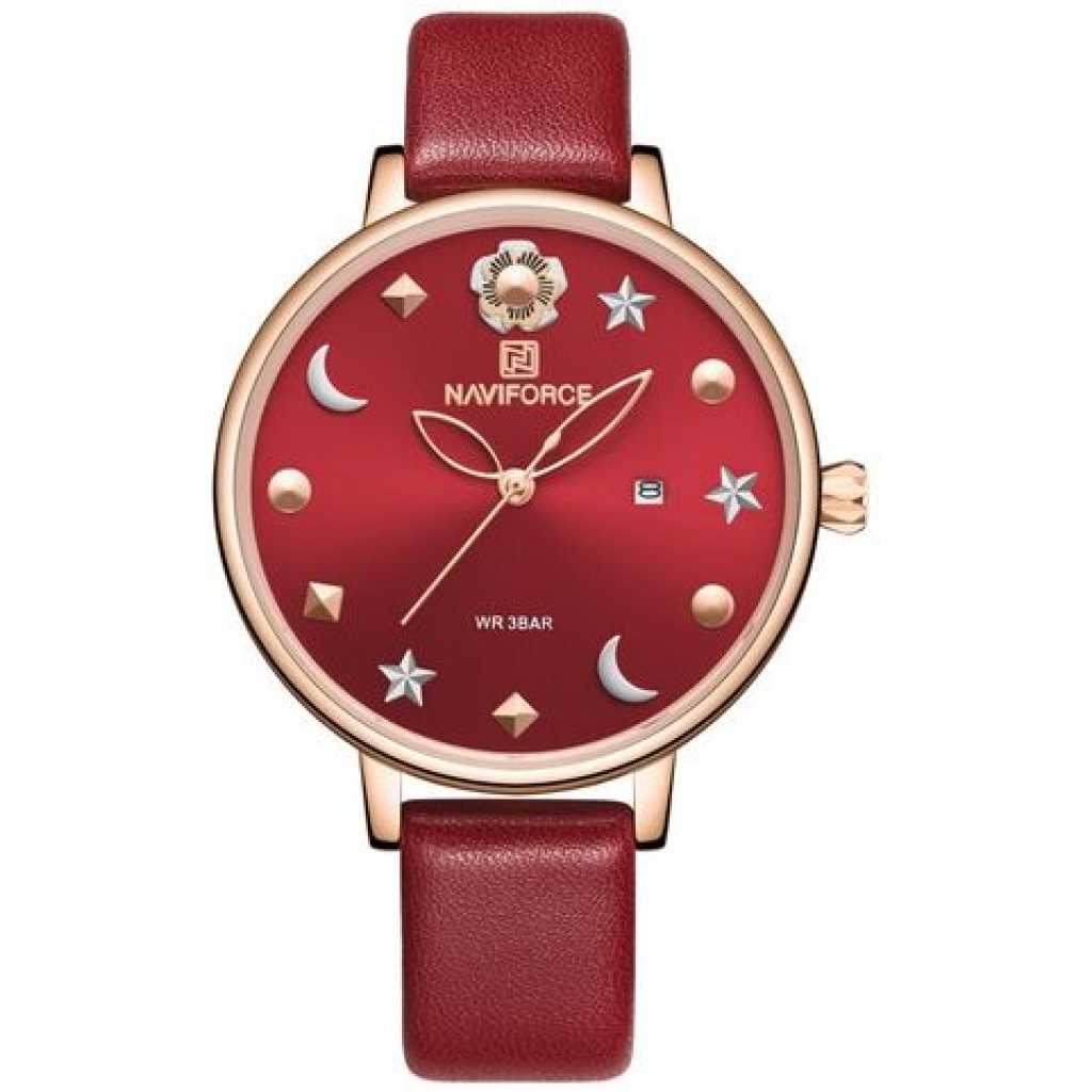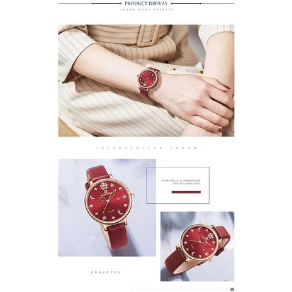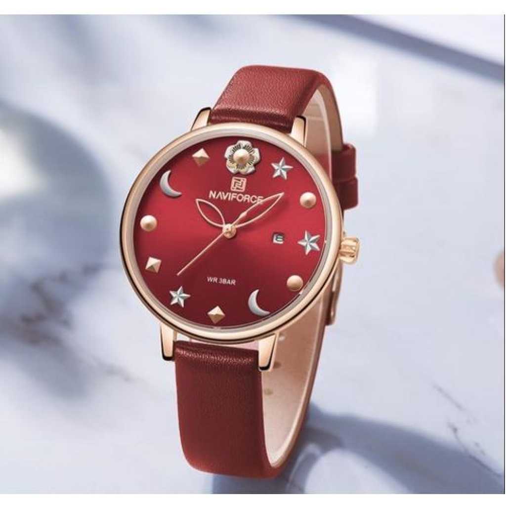 Key Features: Naviforce NF5009 Moon Star Design Casual Style Women Wrist Watch Waterproof – Red. Product: Ladies Watch. Brand: NAVIFORCE. Model No.: NF5009L. Color: Rose Gold. Strap Material: Leather Glass material: Hardlex glass (Anti-scratch). Movement: Quartz. Display: Analog. Gimbal diameter: 36mm. Case Thickness: 7.5mm. Bracelet width: 14mm. Bracelet length: 24.5cm. Weight: 48g. Water resistance: Yes (30m). NB: Only for washing hands, not for swimming and showering.