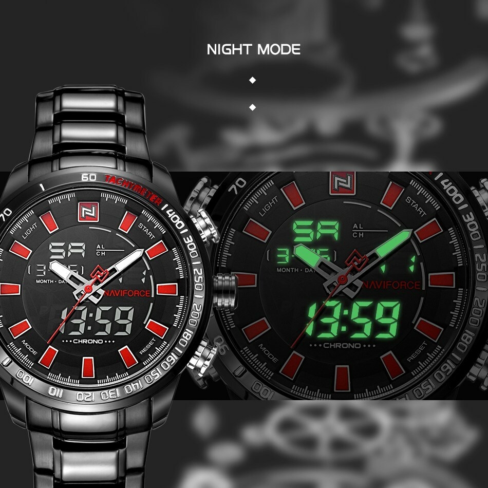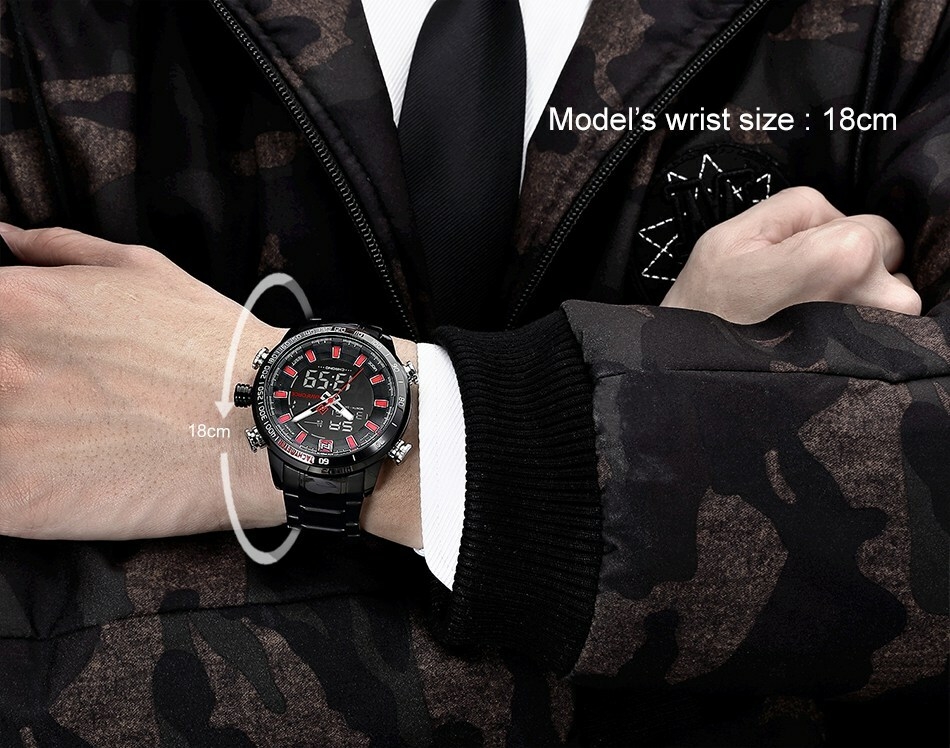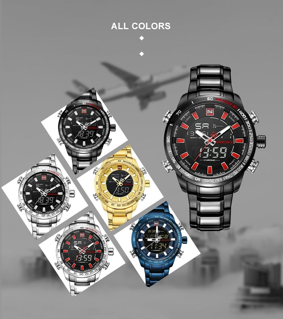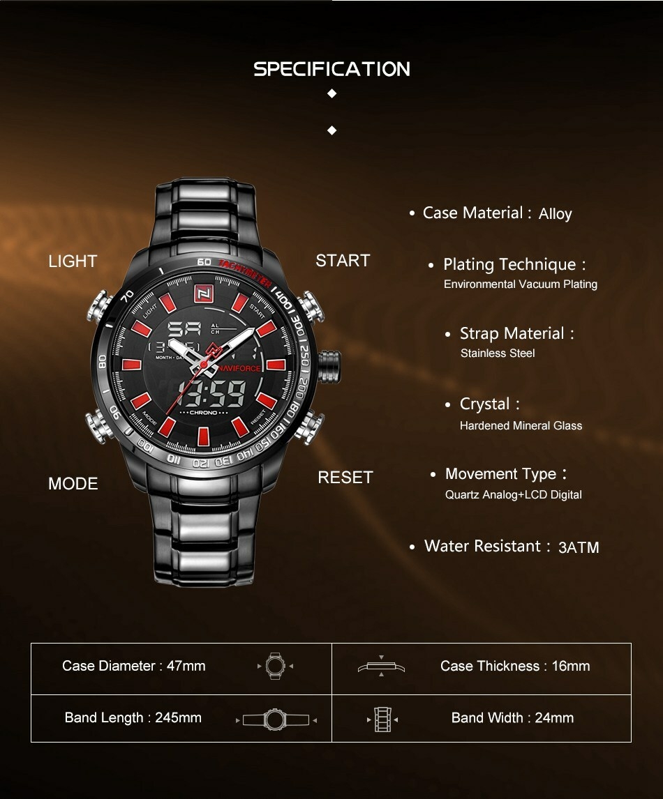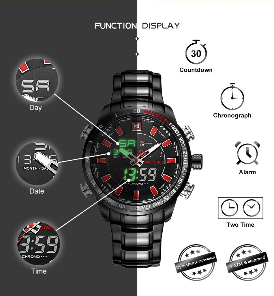 Key Features: Naviforce Watch Fashion Sports Men’s Watch – Black 100% New and high quality Alarm outpout with 4 min, Snooze Day, Date and Time Display Chrime on every hour Chronograph with and 1/100 lap operation Dual Core Analog and Digial display EL (Blue) function Hourly chime function Stainless steel band Water Reistant Case Material: Stainless Steel Case Diameter: 48mm Case Thickness: 16mm Band Material: Stainless Steel Band Length (include Case): 245mm Band Width: 24mm Weight: 182g