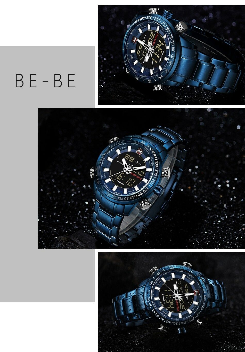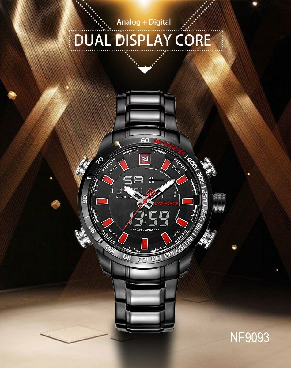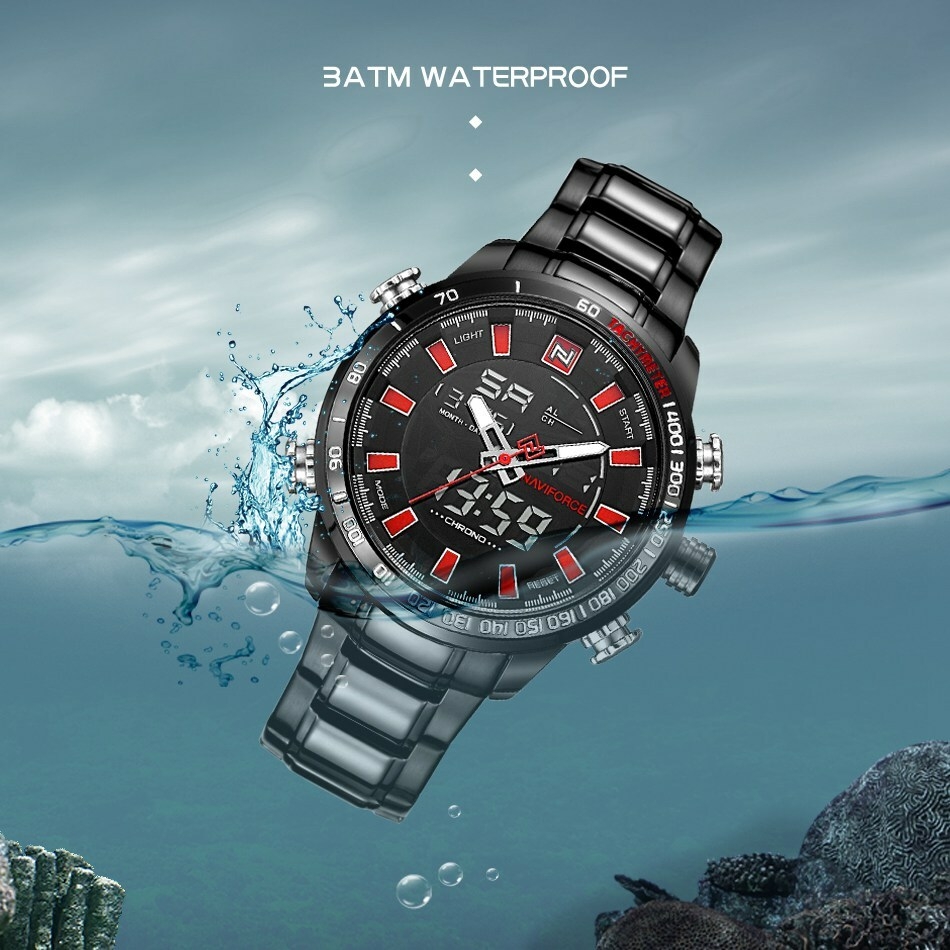 Key Features: Naviforce Watch Fashion Sports Men’s Watch – Black 100% New and high quality Alarm outpout with 4 min, Snooze Day, Date and Time Display Chrime on every hour Chronograph with and 1/100 lap operation Dual Core Analog and Digial display EL (Blue) function Hourly chime function Stainless steel band Water Reistant Case Material: Stainless Steel Case Diameter: 48mm Case Thickness: 16mm Band Material: Stainless Steel Band Length (include Case): 245mm Band Width: 24mm Weight: 182g