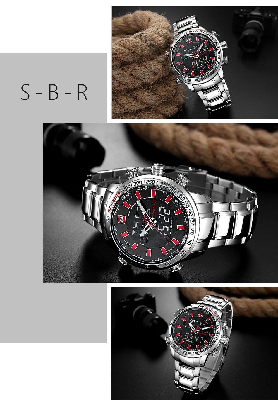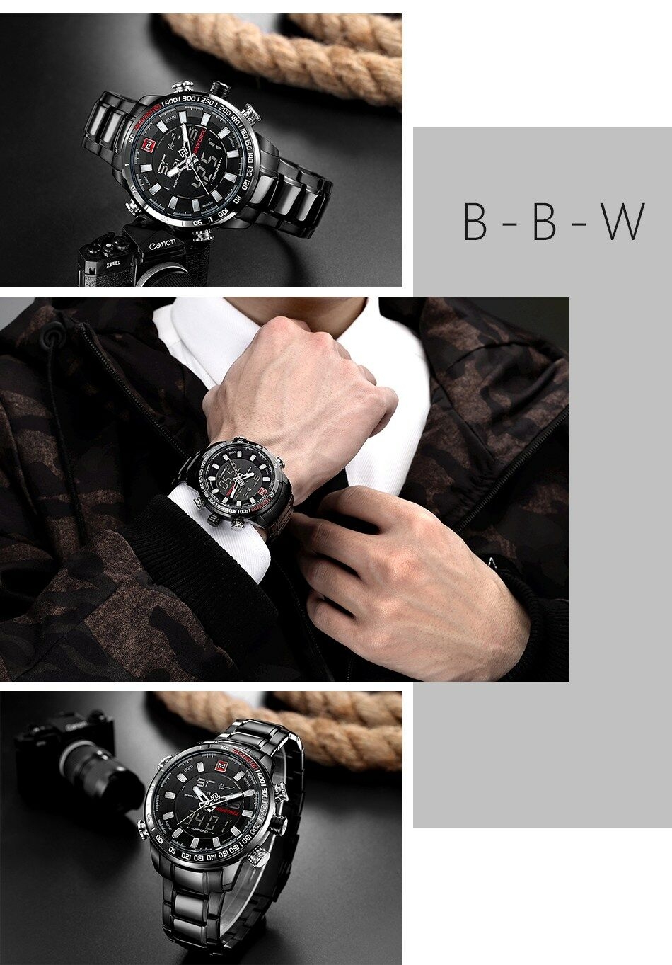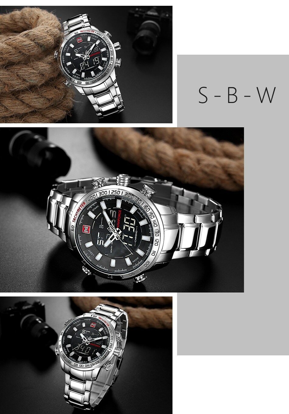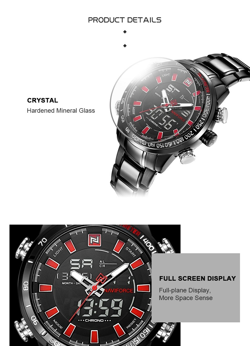 Key Features: Naviforce Watch Fashion Sports Men’s Watch – Black 100% New and high quality Alarm outpout with 4 min, Snooze Day, Date and Time Display Chrime on every hour Chronograph with and 1/100 lap operation Dual Core Analog and Digial display EL (Blue) function Hourly chime function Stainless steel band Water Reistant Case Material: Stainless Steel Case Diameter: 48mm Case Thickness: 16mm Band Material: Stainless Steel Band Length (include Case): 245mm Band Width: 24mm Weight: 182g