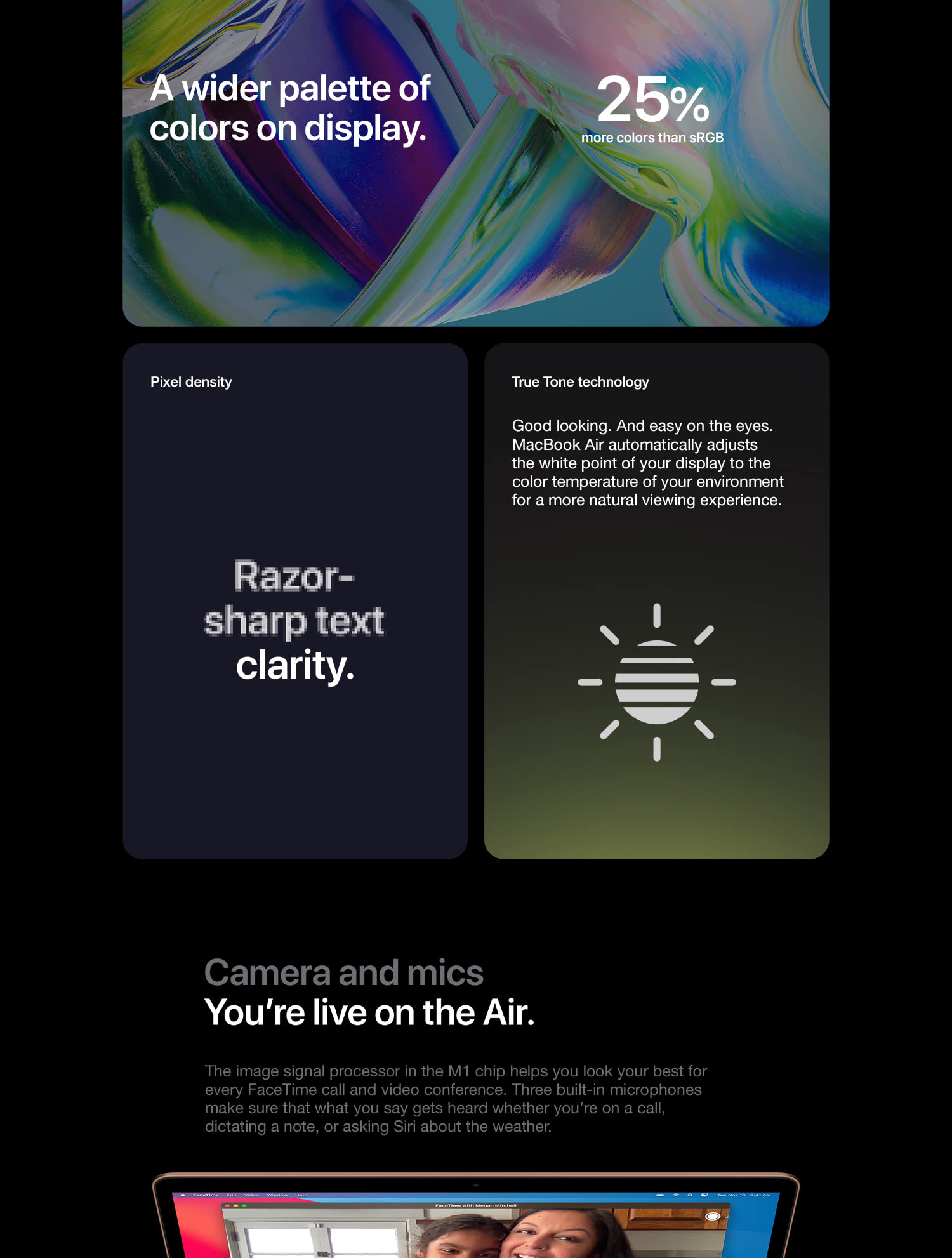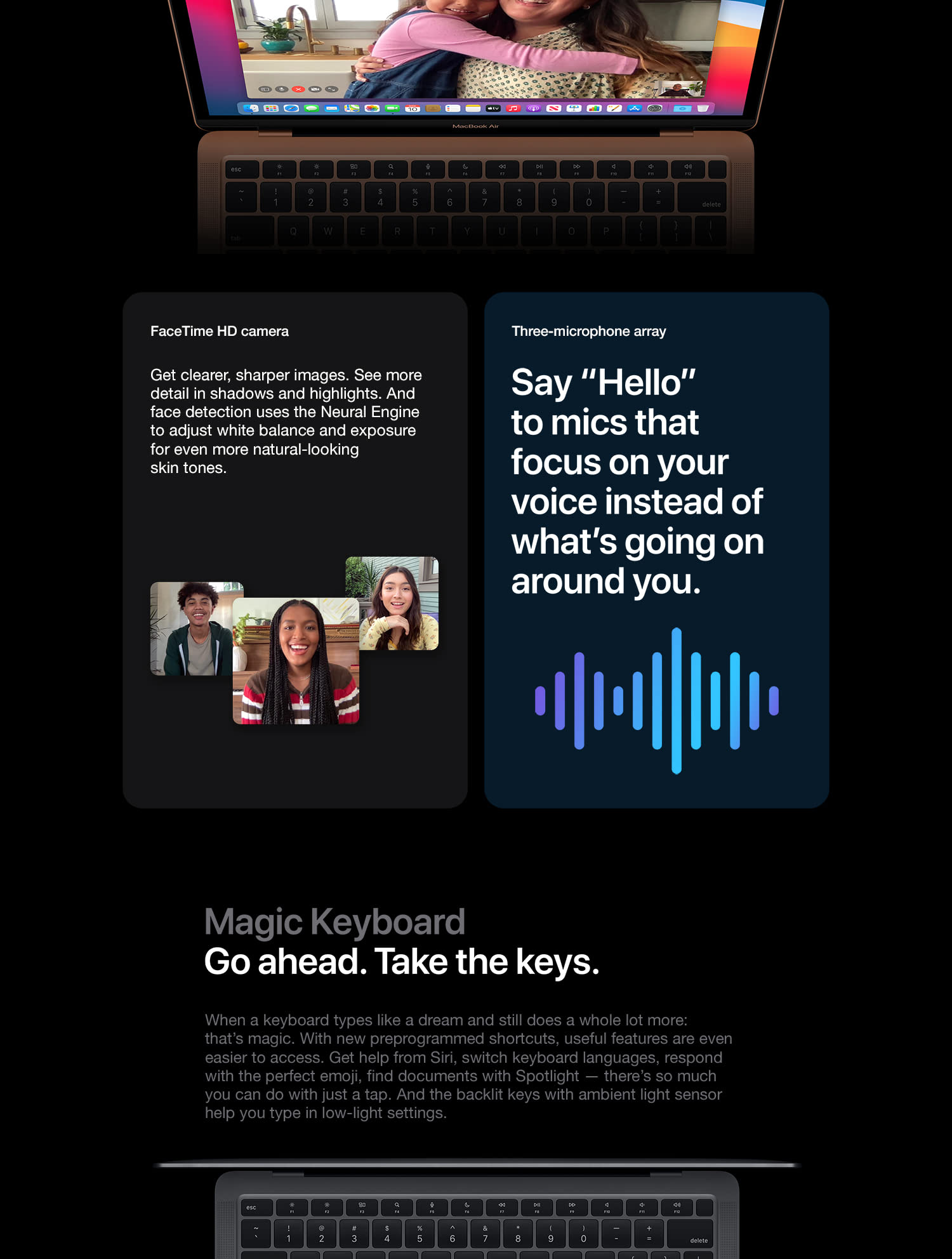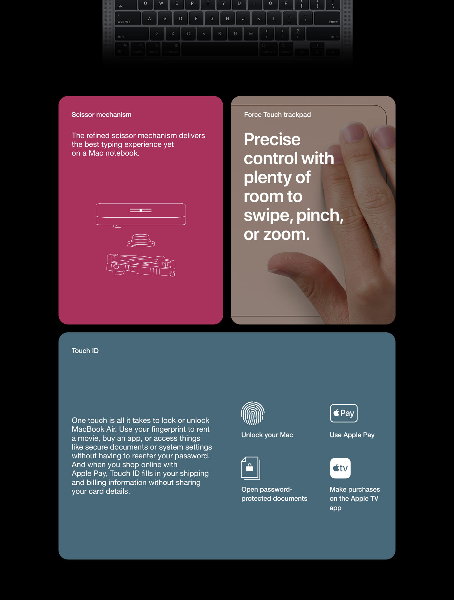 The incredibly thin and light MacBook Air is now more powerful than ever. It features a brilliant Retina display, new Magic Keyboard, Touch ID, processors with up to twice the performance,1 faster graphics, and double the storage capacity. The sleek wedge-shaped design is created from 100 percent recycled aluminum, making it the greenest Mac ever.2 And with all-day battery life, our most popular Mac is your perfectly portable, do-it-all notebook. With a resolution of 2560-by-1600 for over 4 million pixels, the results are positively jaw dropping. Images take on a new level of detail and realism. Text is sharp and clear. And True Tone technology automatically adjusts the white point of the display to match the color temperature of your environment — making web pages and email look as natural as the printed page. With millions of colors, everything you see is rich and vibrant. The display glass goes right to the edge of the enclosure, so you can focus on what’s on your screen. And you’re going to love what you see. The advanced security and convenience of Touch ID are built right into MacBook Air. Simply place your finger on the Touch ID sensor and — just like that — your Mac unlocks. Use your fingerprint to immediately access locked documents