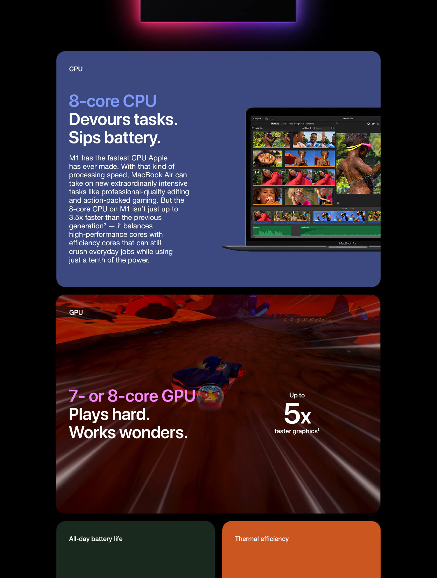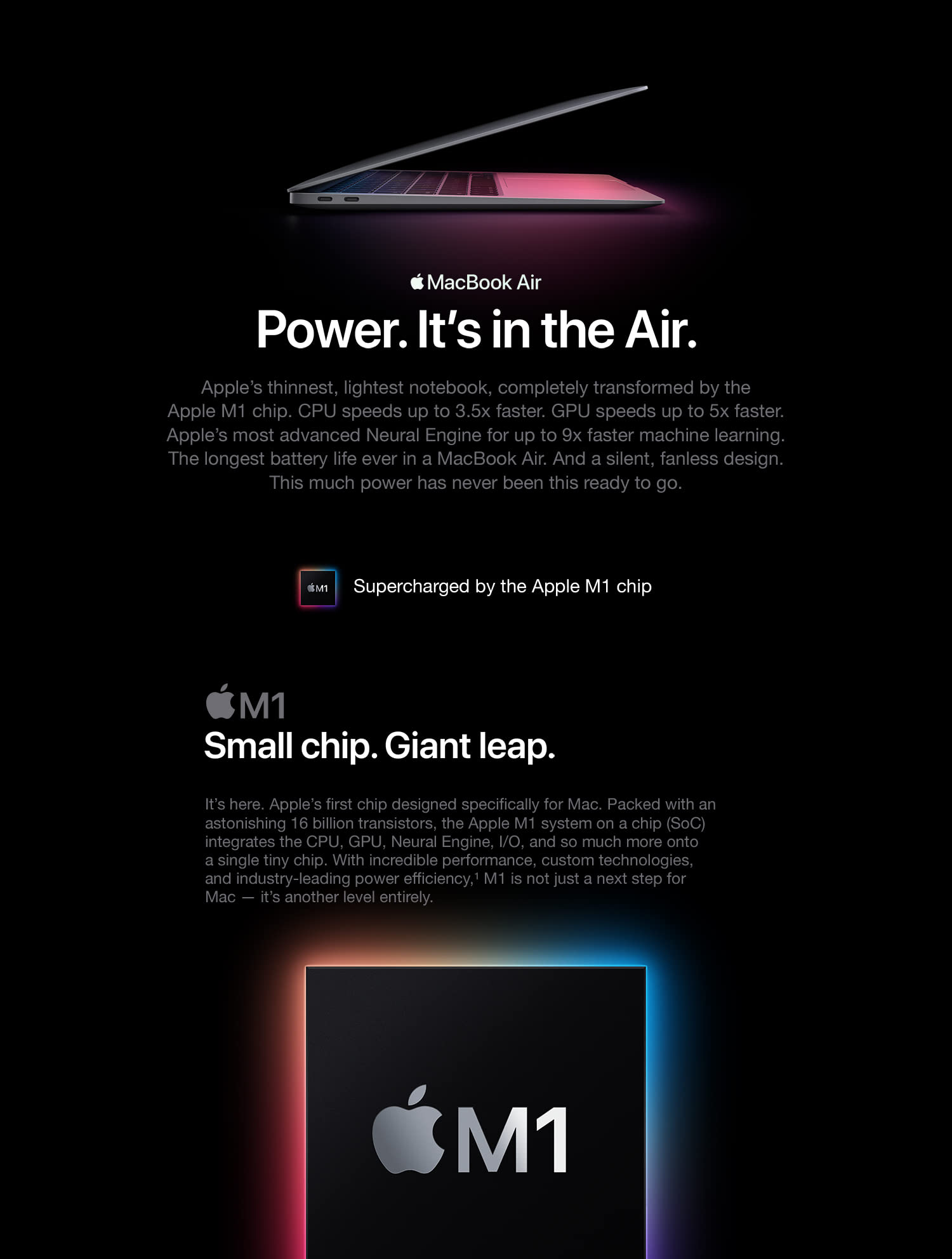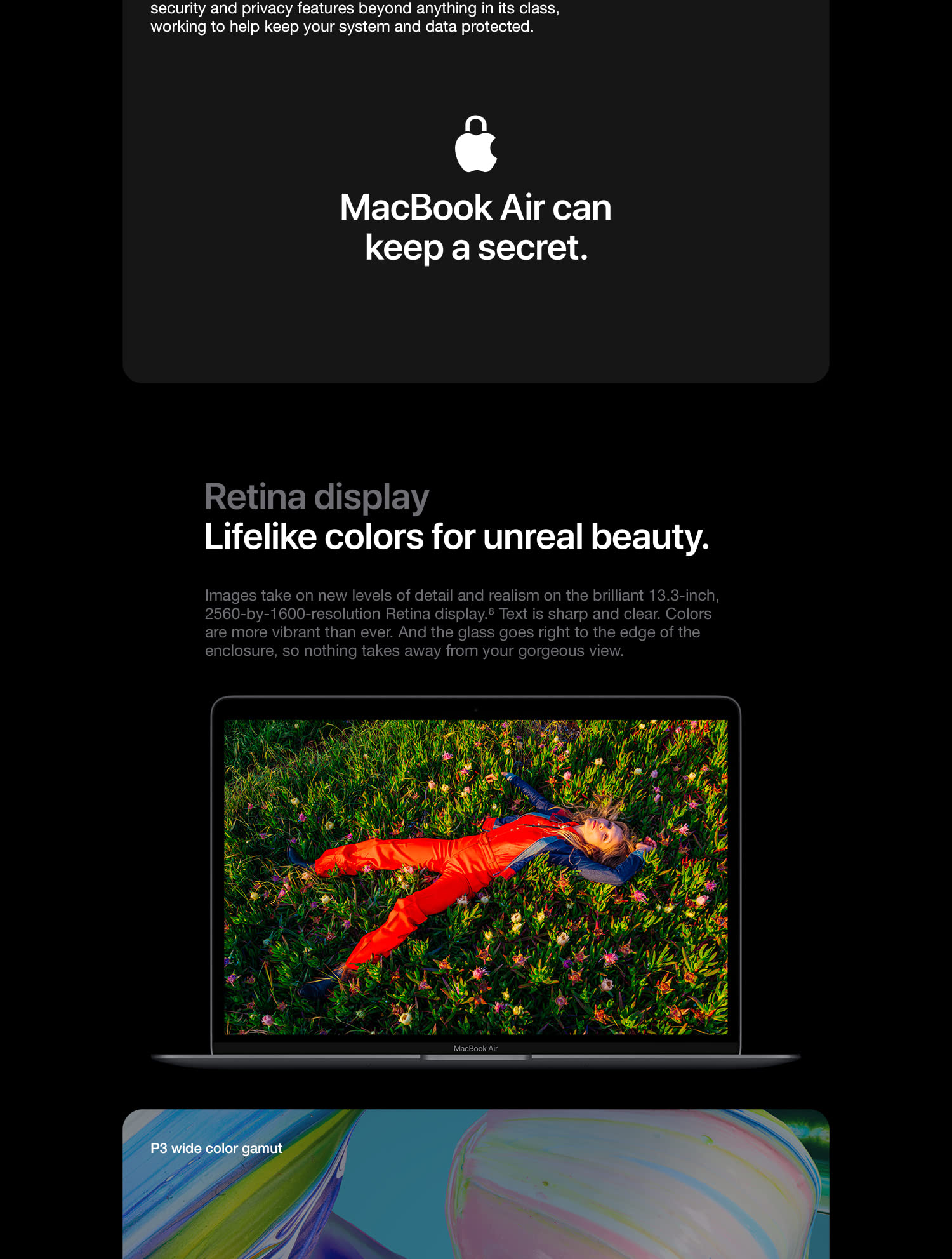 The incredibly thin and light MacBook Air is now more powerful than ever. It features a brilliant Retina display, new Magic Keyboard, Touch ID, processors with up to twice the performance,1 faster graphics, and double the storage capacity. The sleek wedge-shaped design is created from 100 percent recycled aluminum, making it the greenest Mac ever.2 And with all-day battery life, our most popular Mac is your perfectly portable, do-it-all notebook. With a resolution of 2560-by-1600 for over 4 million pixels, the results are positively jaw dropping. Images take on a new level of detail and realism. Text is sharp and clear. And True Tone technology automatically adjusts the white point of the display to match the color temperature of your environment — making web pages and email look as natural as the printed page. With millions of colors, everything you see is rich and vibrant. The display glass goes right to the edge of the enclosure, so you can focus on what’s on your screen. And you’re going to love what you see. The advanced security and convenience of Touch ID are built right into MacBook Air. Simply place your finger on the Touch ID sensor and — just like that — your Mac unlocks. Use your fingerprint to immediately access locked documents
