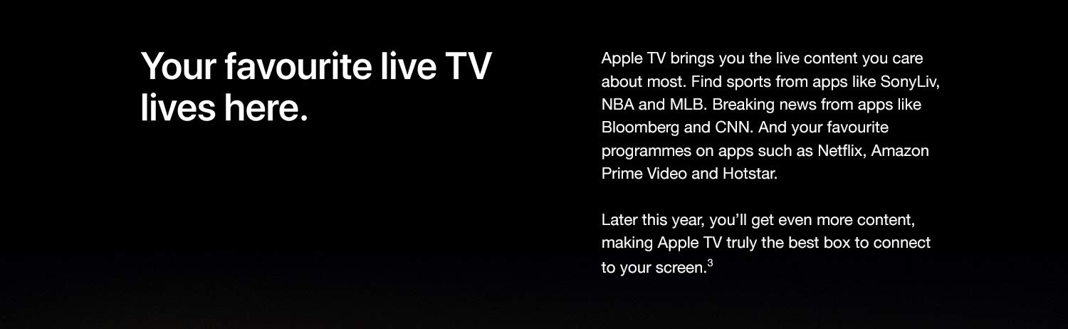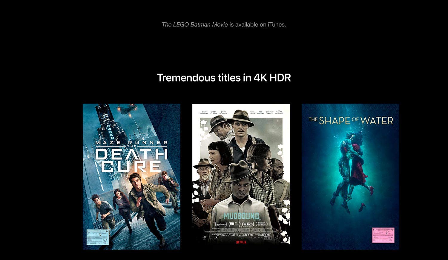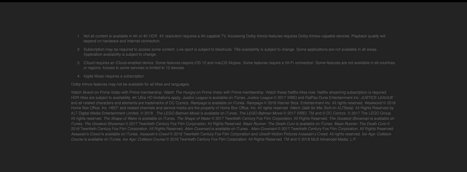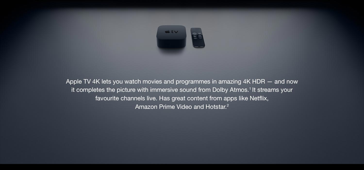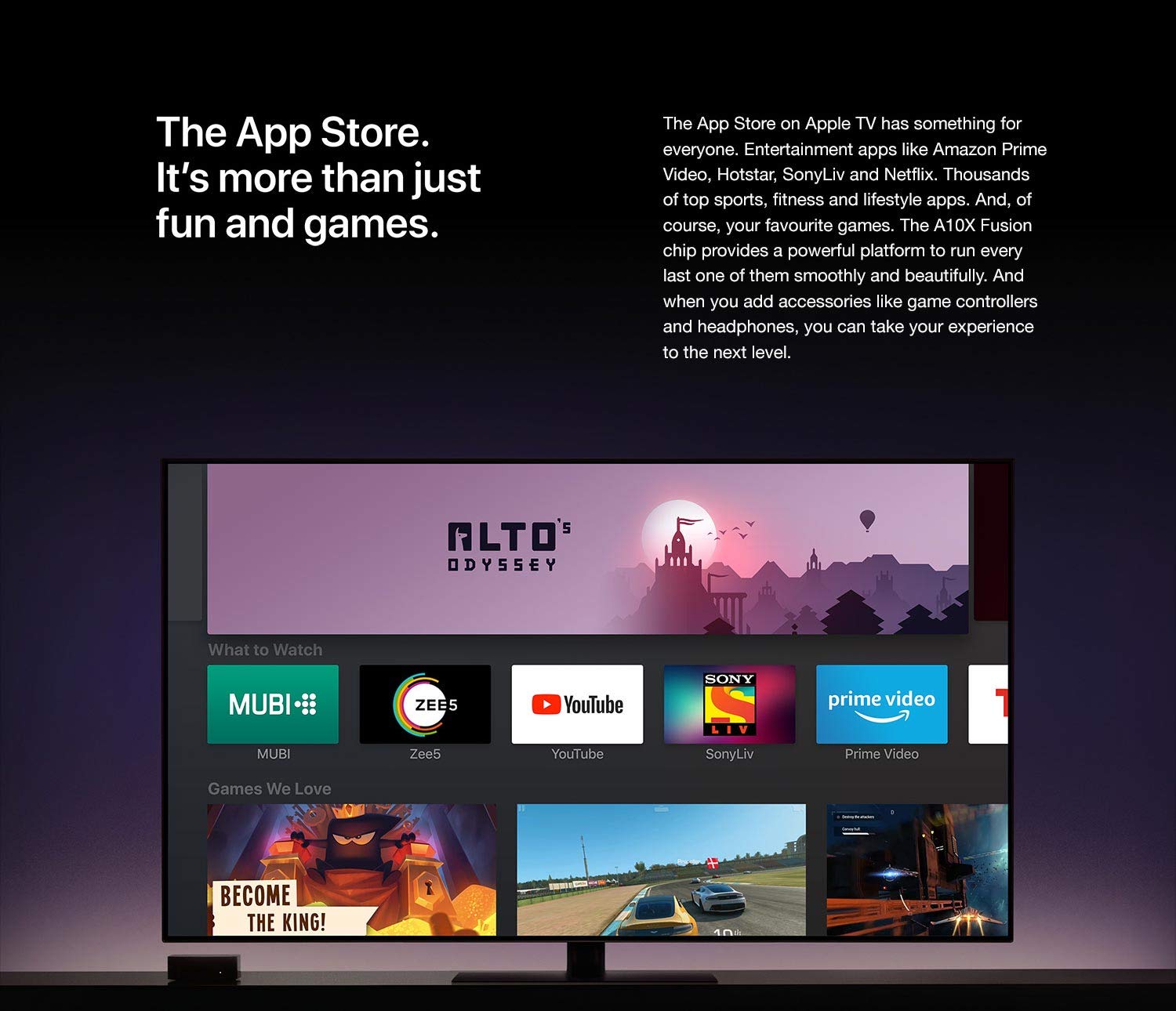 Key Features: 4k high dynamic range (dolby vision and hdr10) for stunning picture quality Dolby atmos for three-dimensional, room-filling sound A10x fusion chip for ultra-fast graphics and performance Navigate and search with the apple tv remote Use airplay to view photos and videos from your iPhone and iPad on your tv Netflix, Amazon prime video, hot star, alt balaji, Zee5, iTunes and thousands more apps in the app store