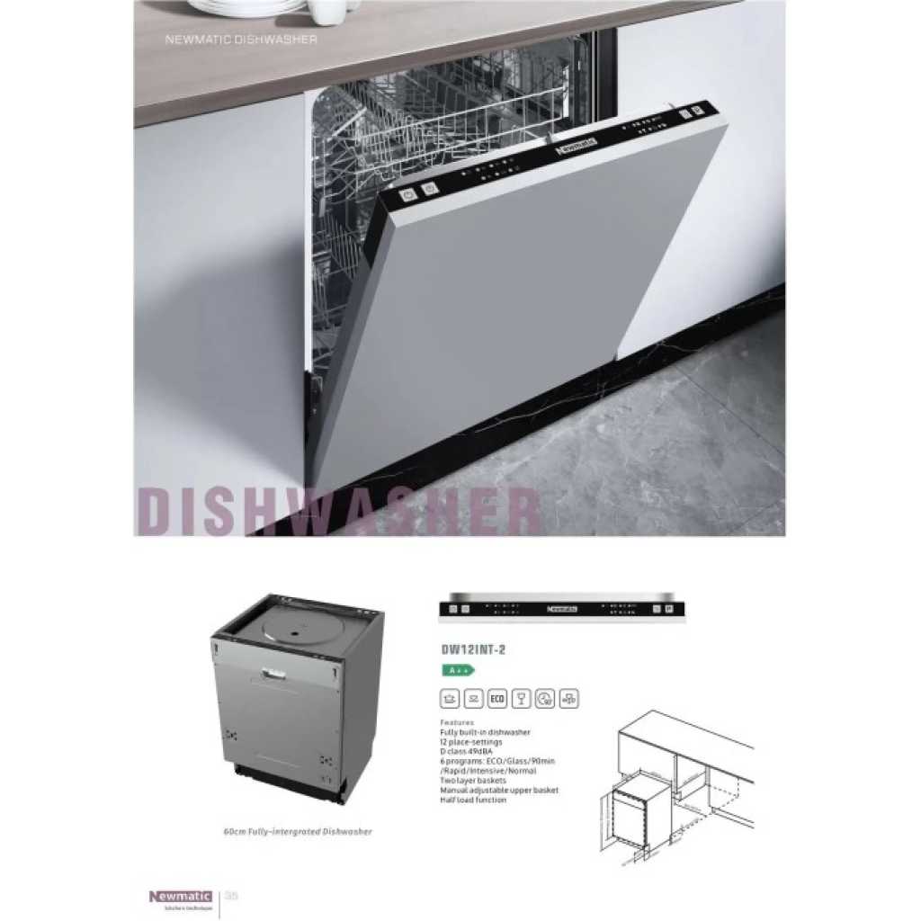 The Newmatic DW12INT-2 Fully Integrated Dishwasher is a perfect blend of style, efficiency, and convenience for modern kitchens. Designed to fit into your cabinetry seamlessly, this 60cm dishwasher offers a sleek, minimalist look while delivering exceptional cleaning performance. Key Features Equipped with 6 different programs: eco, glass, and 90-minute quick wash Caters to diverse cleaning needs Handles heavily soiled pots and delicate glassware with optimal results Energy-efficient A++ rating Reduces energy consumption without compromising performance User-friendly controls Modern touch interface Ideal for homes seeking a high-performance yet eco-friendly kitchen solution, this fully integrated dishwasher promises to simplify your cleaning routine while adding a touch of elegance to your kitchen. Product Specifications TYPE FULLY-INTEGRATED DISHWASHER CAPACITY 12 SETTINGS NOISE LEVEL 49dBA ENERGY CLASS A++ PROGRAMS 6 DIMENSIONS D550 X W598 X H815 MM