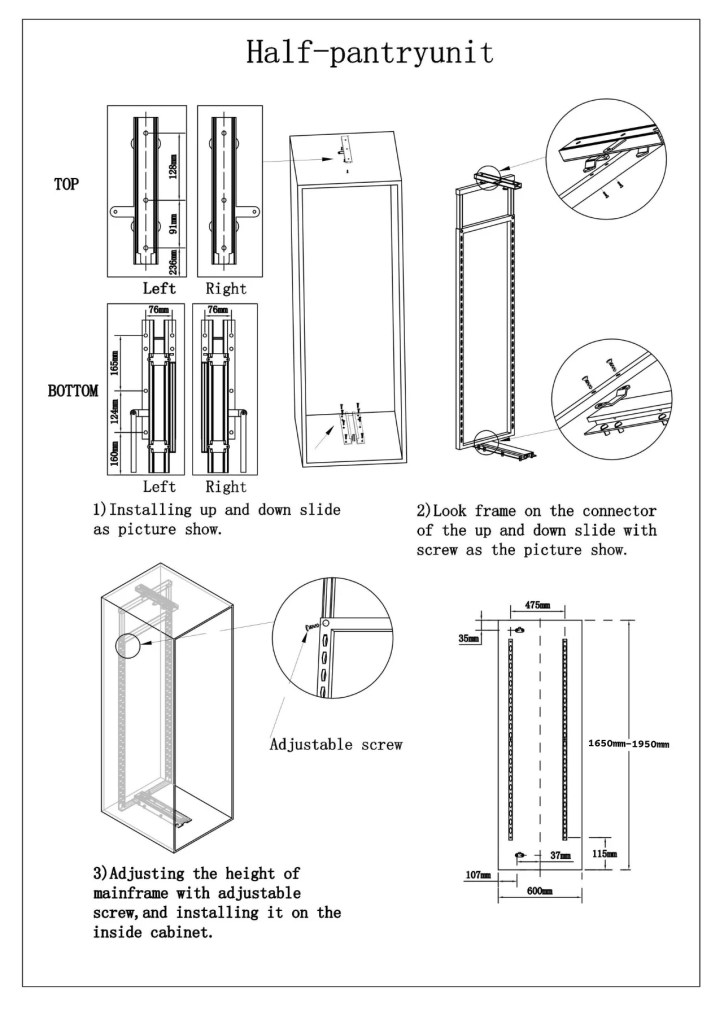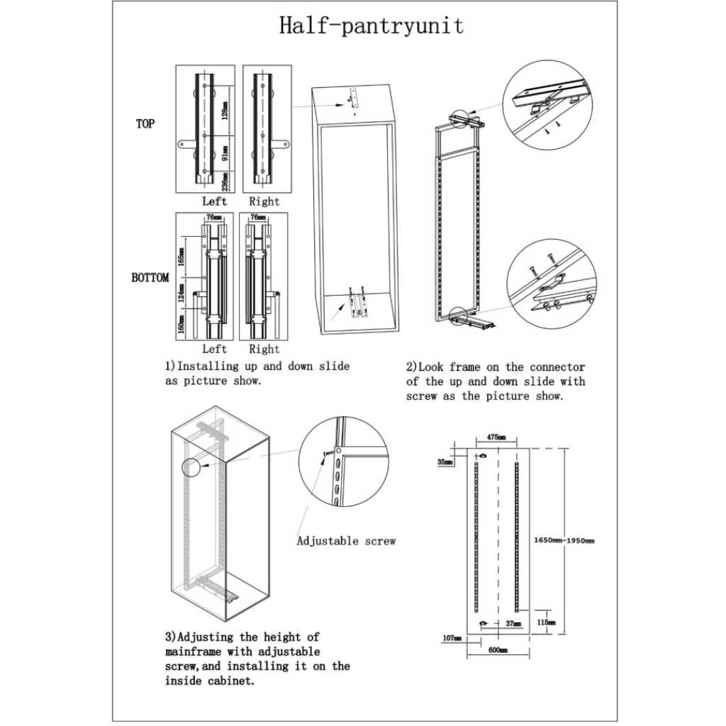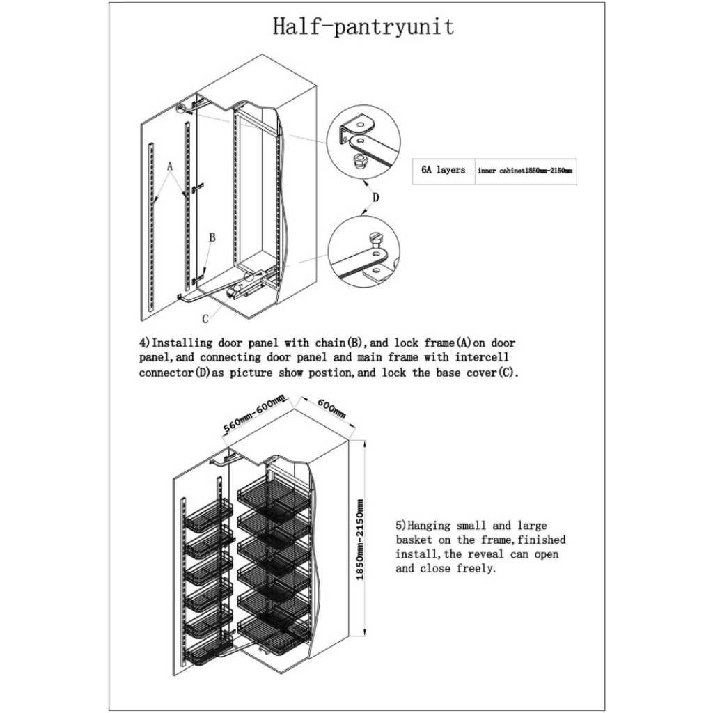Don’t have space for a walk-in pantry? Newmatic has you covered with the BK7360 Pull-Out Pantry, which is constructed of durable chrome steel and boasts six detachable shelves to store your groceries. The pantry also has a modern primary color finish. Optimize your kitchen with Newmatic kitchen hardware today. This product is designed to be installed in a kitchen cabinet. Pair with other Newmatic kitchen appliances and hardware for the perfect kitchen system. Suggested Cabinet Width – 600mm Materials Stainless Steel with a Primary Color Finish Levels 6 Dimensions Suggested Cabinet Dimensions W56.4 X H(165-195)cm X D50 W 60cm x H 185-215cm x D 56-60cm