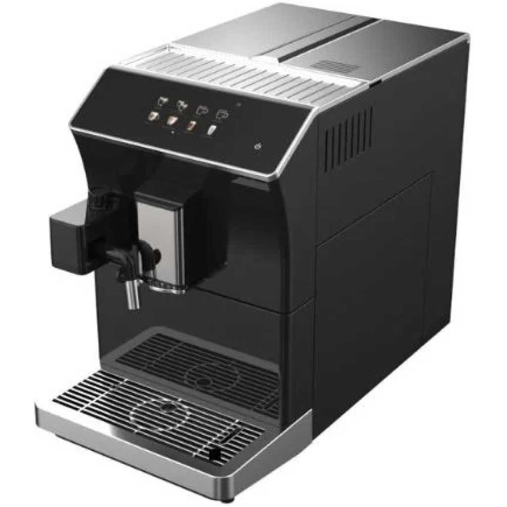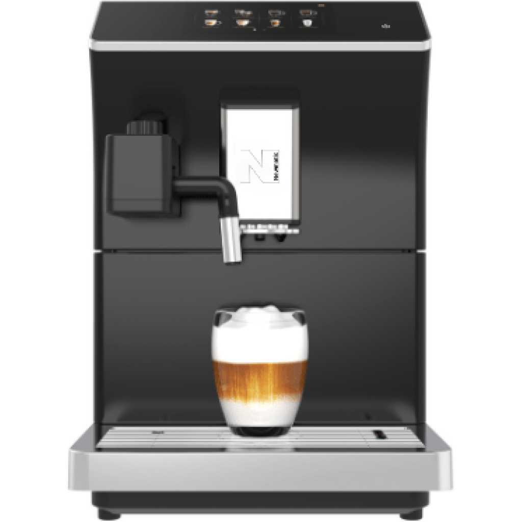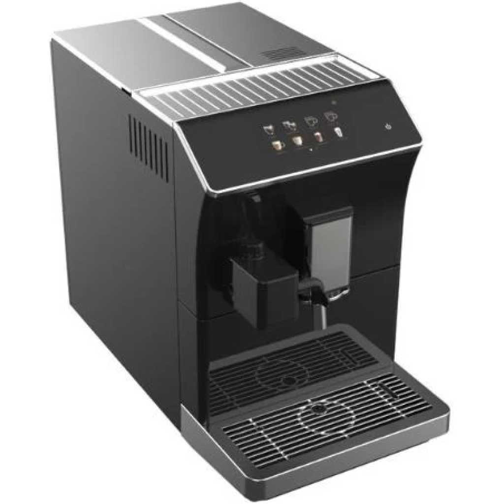 Key Features: Newmatic Automatic Bean To Cup Espresso Coffee Machine BT-COF-203, 1300W, Classic Milk Frother, Touch Control LCD Display, 1.7L Water Capacity. Stainless steel cup warmer. Alerts for water and bean refills. Notification for full coffee grounds. Customizable beverage settings. Beverage count memory. Auto-rinse on startup and shutdown. 7-level bean grinder. HD touch screen. Automated milk frothing. One-touch brewing for 16 beverages. Customizable production. Multi-language support.