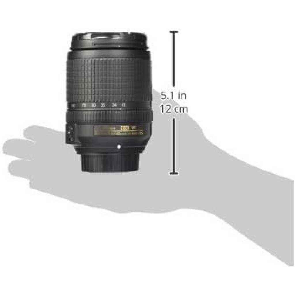 Key Features: Goes from wide-angle (18 millimeter ) to telephoto (140 millimeter ) for great snapshots and videos in just about any situation Nikon Silent Wave Motor (AFS) enables fast, accurate and quiet autofocus, Minimum focus distance 0.45 m (1.48 ft) from focal plane at all zoom positions Focal Length : 18-140 millimeter VR image stabilization for sharper handheld photos and videos in low-light situations and at telephoto distances.Zoom Ratio 7.8 x Extra-low Dispersion (ED) glass minimizes chromatic aberration, and aspherical lens element virtually eliminates coma. Type G AF-S DX lens with built-in CPU and F mount. Lens construction-17 elements in 12 groups (including 1 ED lens element, 1 aspherical lens element) Nikon Super Integrated Coating (SIC) enhances light transmission efficiency and offers superior color consistency and reduced flare