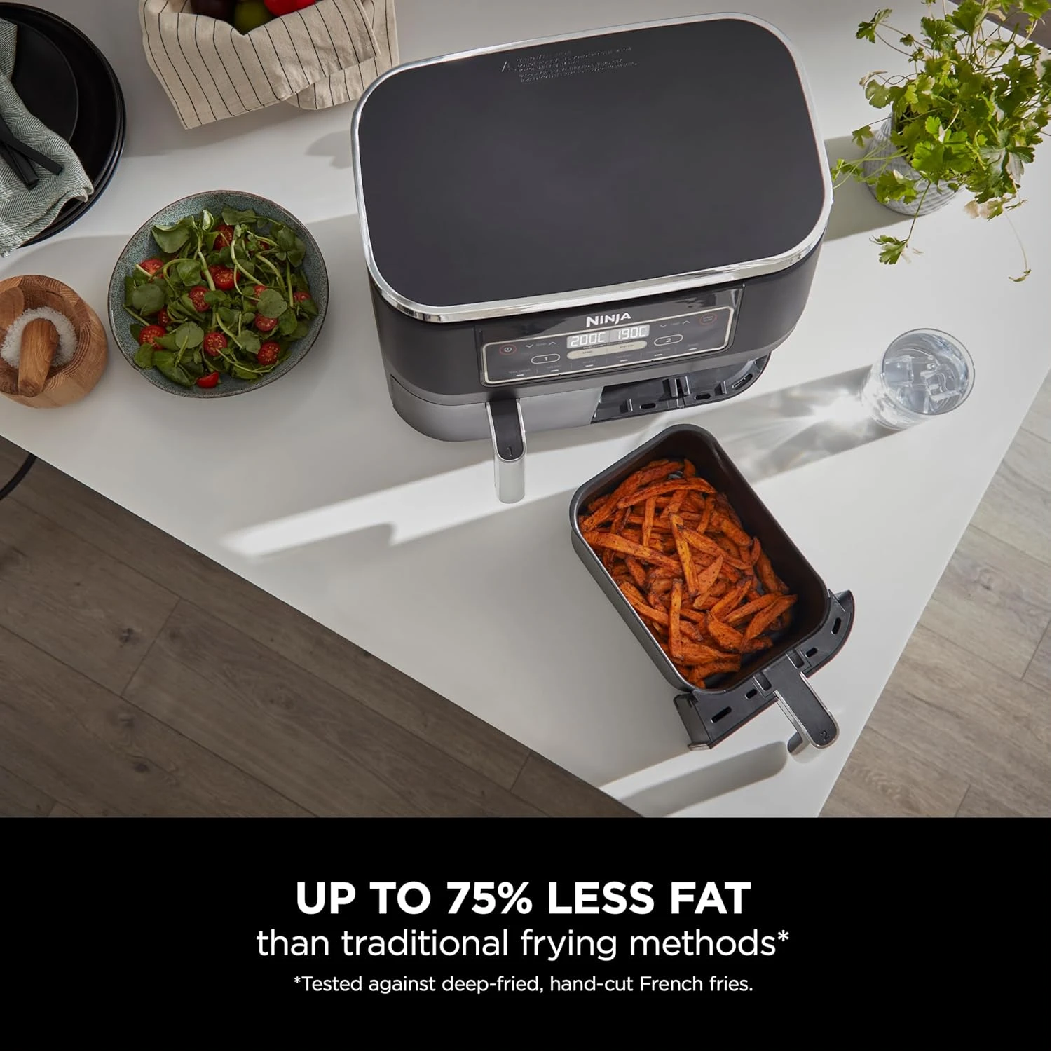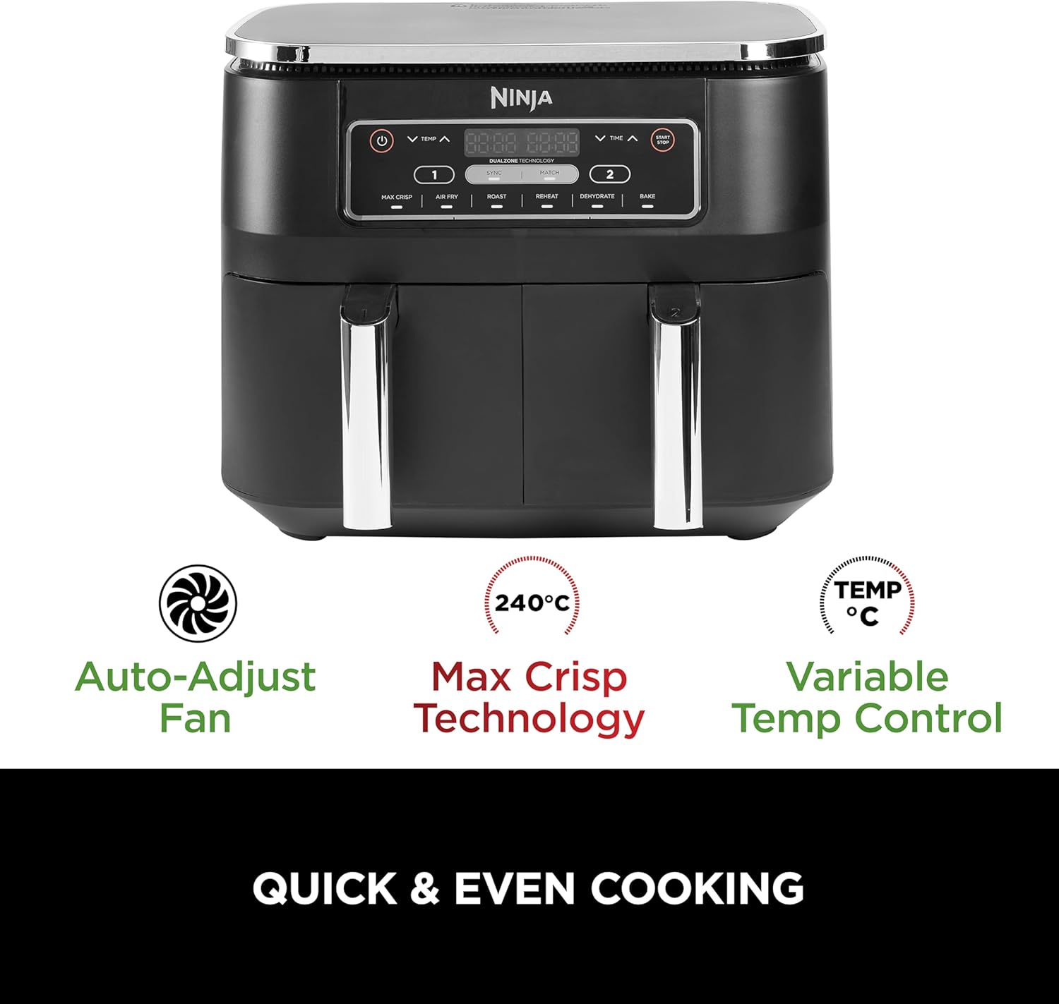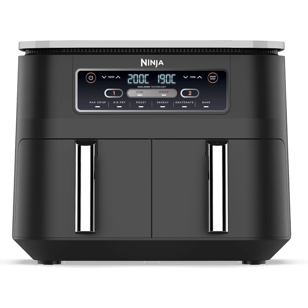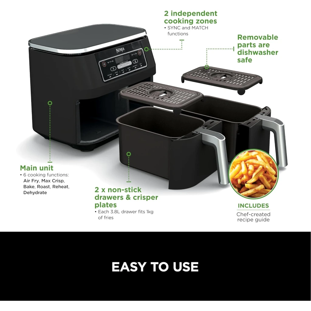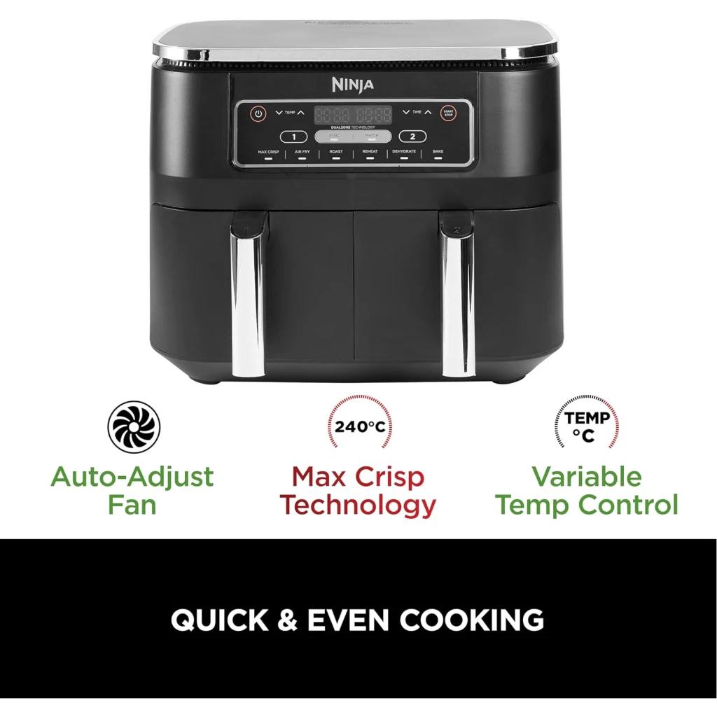 Ninja Foodi 7.6L Dual Zone Digital Air Fryer, 2 Drawers, 6-in-1, Air Fry, Max Crisp, Roast, Bake, Dehydrate, Cooks 4-6 Portions, Non-Stick, Dishwasher Safe Baskets, Black, AF300ME, 2 Years Warranty. Save up to 75% on your oven energy bill. The air fryer that cooks 2 foods, 2 ways, and finishes at the same time. More than an air fryer. 6 ways to cook – Max Crisp, Roast, Bake, Reheat, Dehydrate and Air Fry. When it comes to cooking, timing is everything. The Ninja Foodi Dual Zone 7.6L Air Fryer does the thinking and timing for you. With 2 independent cooking zones, you can mix and match cooking programs, times and temperatures across both drawers to create delicious meals in moments! SYNC to cook different foods in each drawer – both ready to serve at exactly the same time! Feeding the whole household? MATCH to make double the amount of food in the same amount of time! Up to 75% faster than fan ovens, cook from frozen to crispy in minutes. Air Fry using little to no oil – up to 75% less fat. (Testing and calculations based on recommended cook time for sausages, using air fry function versus conventional ovens. Tested against fish fingers and sausages, including pre-heat. Tested against deep fried, hand-cut French fries.)