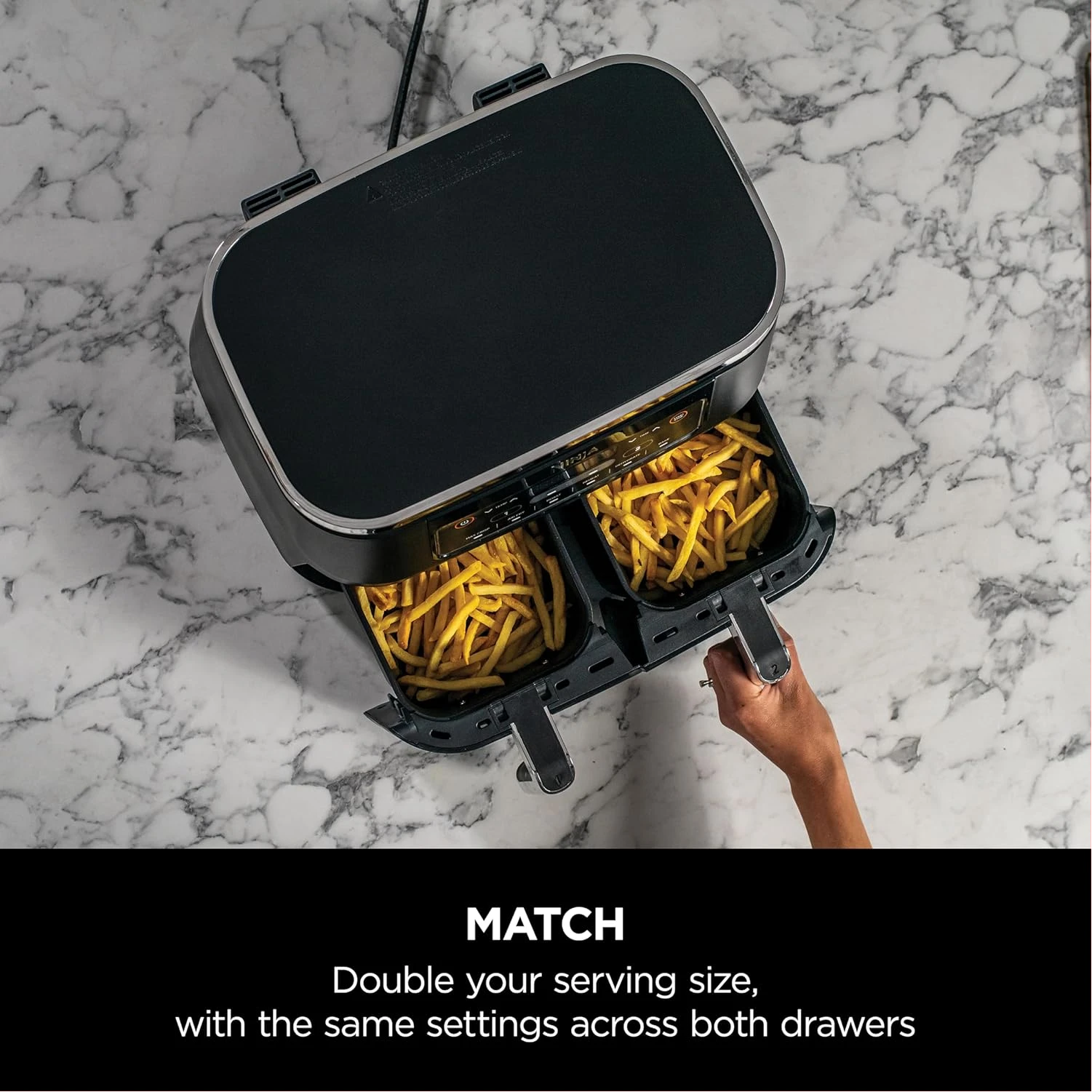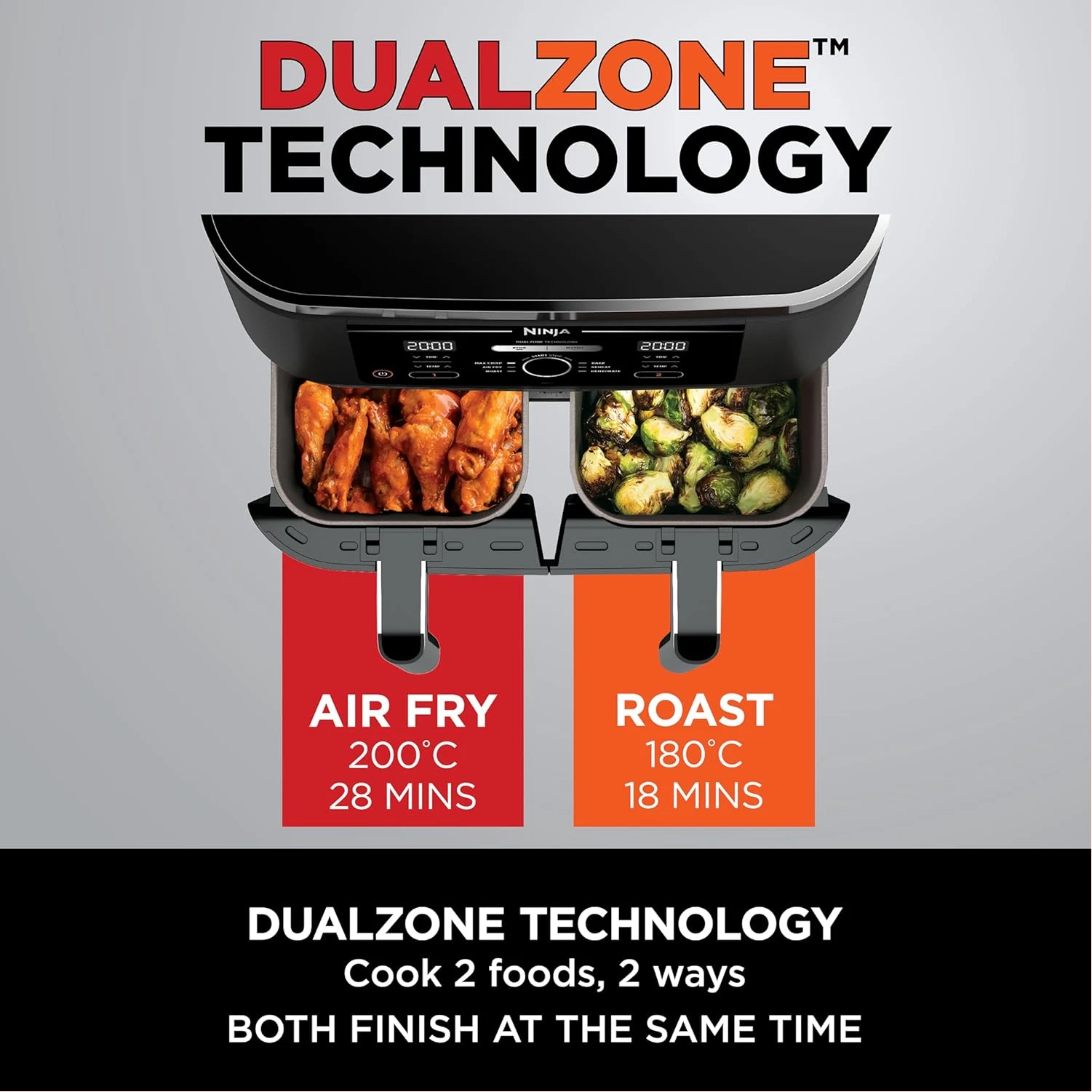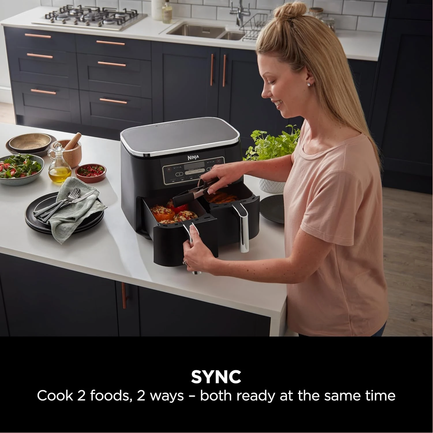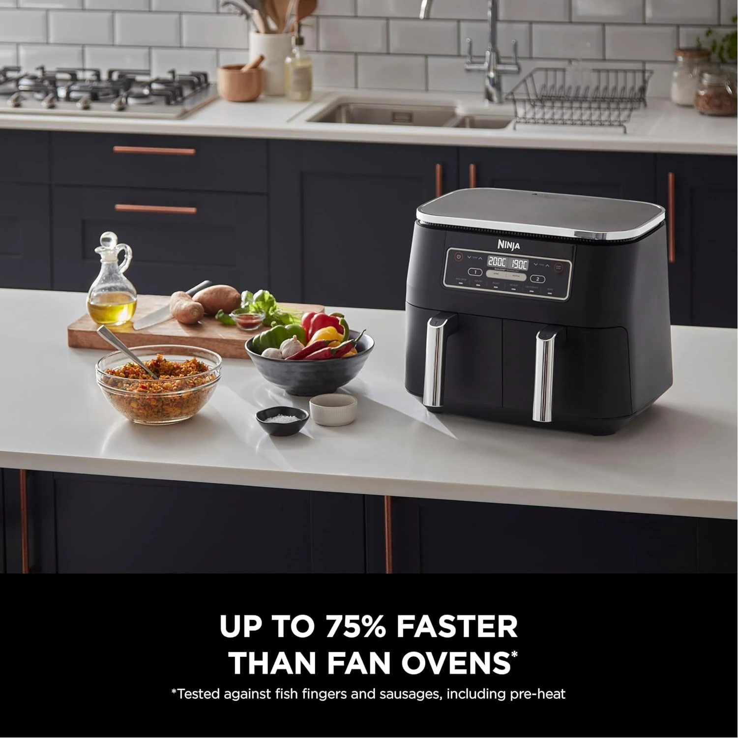 Ninja Foodi 7.6L Dual Zone Digital Air Fryer, 2 Drawers, 6-in-1, Air Fry, Max Crisp, Roast, Bake, Dehydrate, Cooks 4-6 Portions, Non-Stick, Dishwasher Safe Baskets, Black, AF300ME, 2 Years Warranty. Save up to 75% on your oven energy bill. The air fryer that cooks 2 foods, 2 ways, and finishes at the same time. More than an air fryer. 6 ways to cook – Max Crisp, Roast, Bake, Reheat, Dehydrate and Air Fry. When it comes to cooking, timing is everything. The Ninja Foodi Dual Zone 7.6L Air Fryer does the thinking and timing for you. With 2 independent cooking zones, you can mix and match cooking programs, times and temperatures across both drawers to create delicious meals in moments! SYNC to cook different foods in each drawer – both ready to serve at exactly the same time! Feeding the whole household? MATCH to make double the amount of food in the same amount of time! Up to 75% faster than fan ovens, cook from frozen to crispy in minutes. Air Fry using little to no oil – up to 75% less fat. (Testing and calculations based on recommended cook time for sausages, using air fry function versus conventional ovens. Tested against fish fingers and sausages, including pre-heat. Tested against deep fried, hand-cut French fries.)