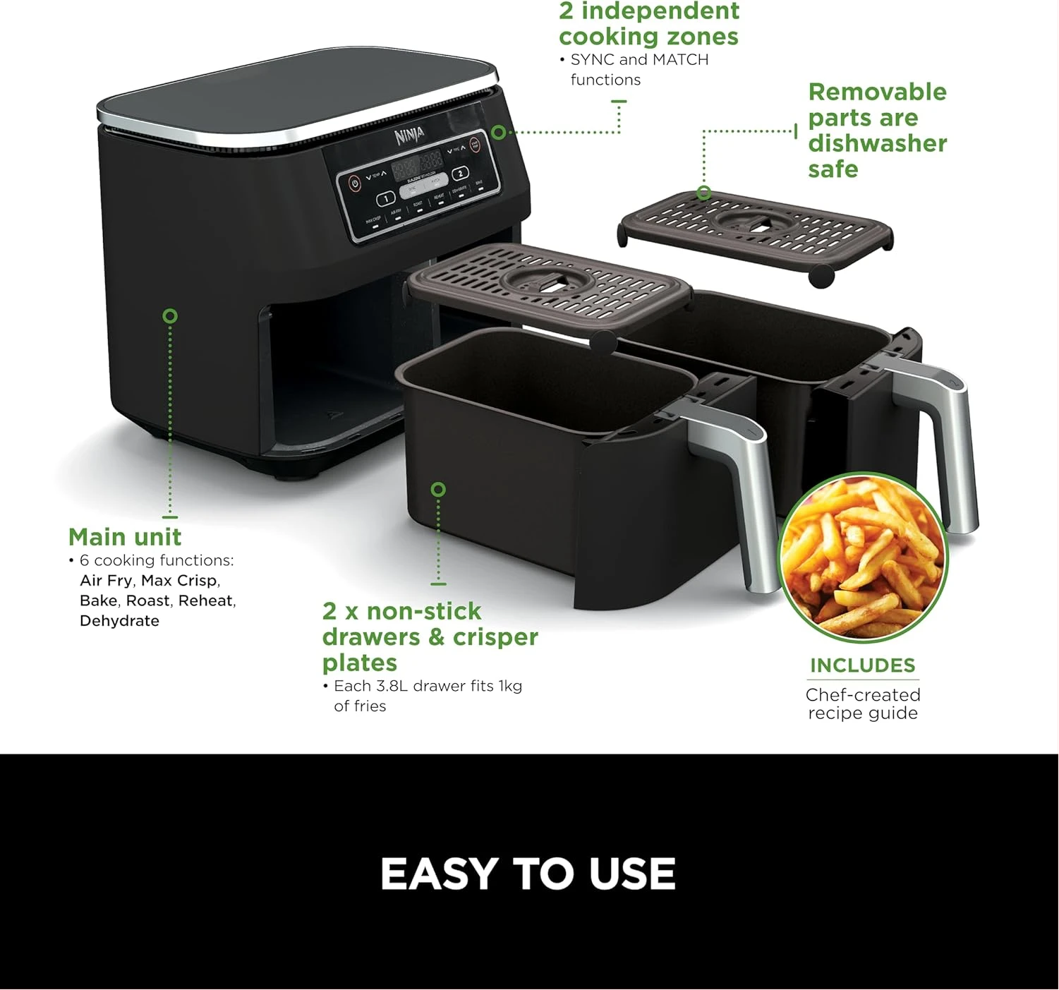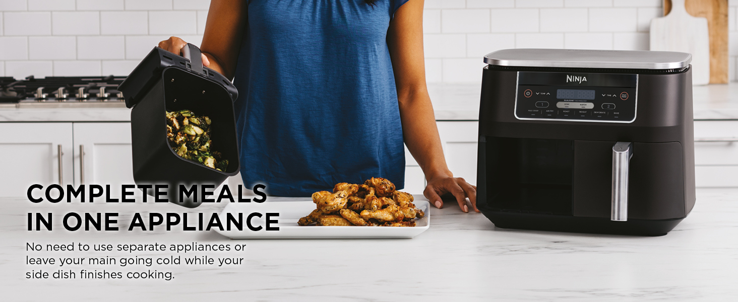 Key Features: Ninja Foodi 7.6L Dual Zone Digital Air Fryer, 2 Drawers, 6-in-1, Air Fry, Max Crisp, Roast, Bake, Dehydrate, Cooks 4-6 Portions, Non-Stick, Dishwasher Safe Baskets, Black, AF300ME, 2 Years Warranty. ENERGY-SAVING: Save up to 75% on your oven energy bill* (*testing and calculations based on recommended cook time for sausages, using air fry function versus conventional ovens). 2 INDEPENDENT COOKING ZONES: Cook 2 foods, 2 ways, both ready at the same time. Use different functions, times and temps in each drawer to create complete meals in one appliance, or cater to 2 tastes. 6 COOKING FUNCTIONS: Max Crisp, Air Fry, Roast, Bake, Reheat, Dehydrate. Cook from frozen to crispy. Up to 75% less fat* using the Air Fry function (*Tested against deep fried, hand-cut French fries). LARGE CAPACITY: Cook 4-6 portions. Each drawer fits up to 1kg of fries or a 1.6kg chicken. Cook up to 75% faster than fan ovens* (*Tested against fish fingers and sausages, including preheat). INCLUDES: Ninja Air Fryer, 2x Non-stick, dishwasher-safe 3.8L Drawers (7.6L total capacity) & Crisper Plates. Chef-Created Recipe Guide. Weight: 8.2kg. Colour: Black. DIMENSIONS: H31.5cm x W38cm x D26.5cm. 2-year guarantee upon registration with Ninja .