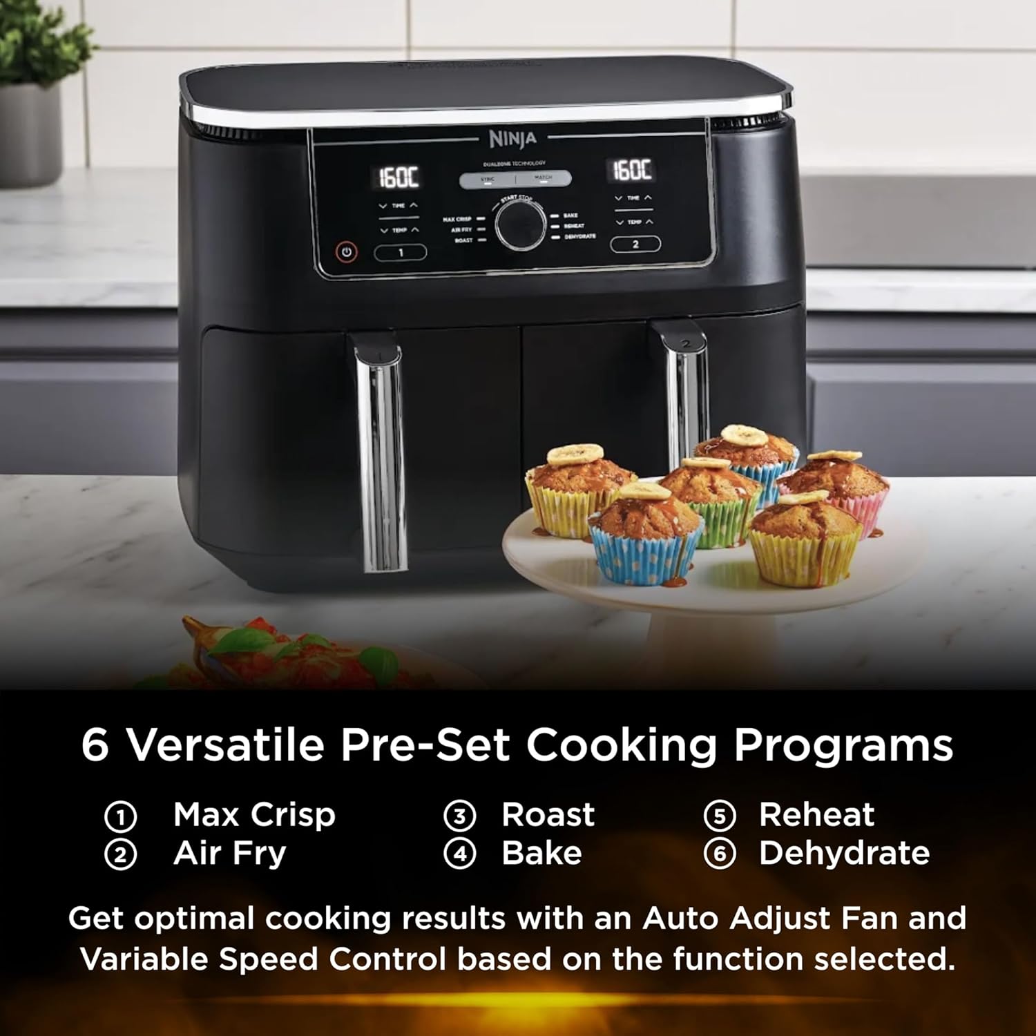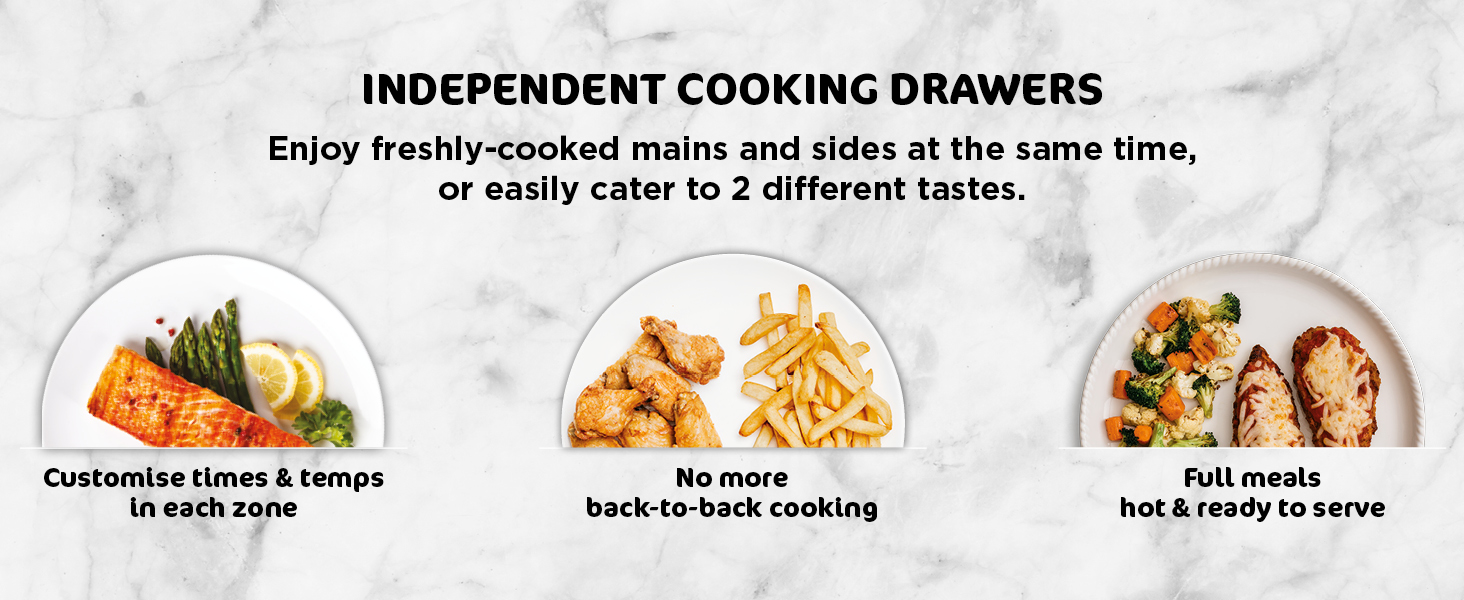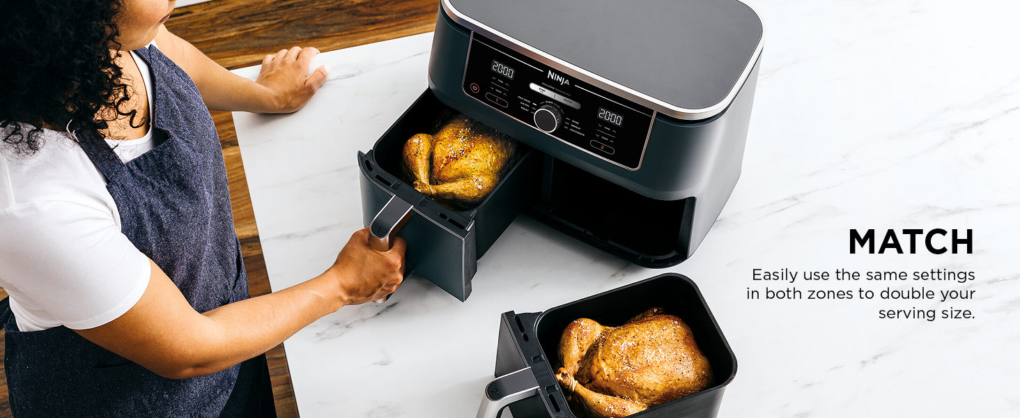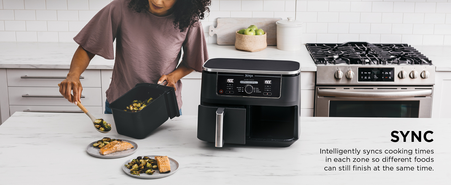 Ninja Foodi MAX 9.5L Dual Zone Digital Air Fryer, 2 Drawers, 6-In-1, Uses No Oil, Air Fry, Max Crisp, Roast, Bake, Reheat, Dehydrate, Cook 8 Portions, Non-Stick Dishwasher Safe Baskets, B 9.5 L 2470 W AF400ME – Black. Save up to 65% on your oven energy bill. Take mealtimes to the MAX with the large capacity air fryer that cooks 2 foods, 2 ways, and finishes at the same time. More than an air fryer. 6 ways to cook – Max Crisp, Roast, Bake, Reheat, Dehydrate and Air Fry. Introducing the ultimate mealtime solution, perfect for feeding the whole household. With a large capacity and 2 independent cooking zones, the Ninja Foodi MAX Dual Zone 9.5L Air Fryer does the thinking and timing for you. Mix and match cooking programs, times and temperatures across both drawers to create delicious meals in moments! SYNC to cook different foods in each drawer – both ready to serve at exactly the same time! MATCH settings across both drawers to double your serving size. Cook up to 25% more – easily fit a 2kg chicken in each drawer! Up to 75% faster than fan ovens. Up to 75% less fat than traditional frying methods. (Testing and calculations based on recommended cook time for sausages, using air fry function versus conventional ovens Compared to AF300ME, 7.6L Tested against fish fingers and sausages, including pre-heat. Tested against deep fried, hand-cut French fries.)