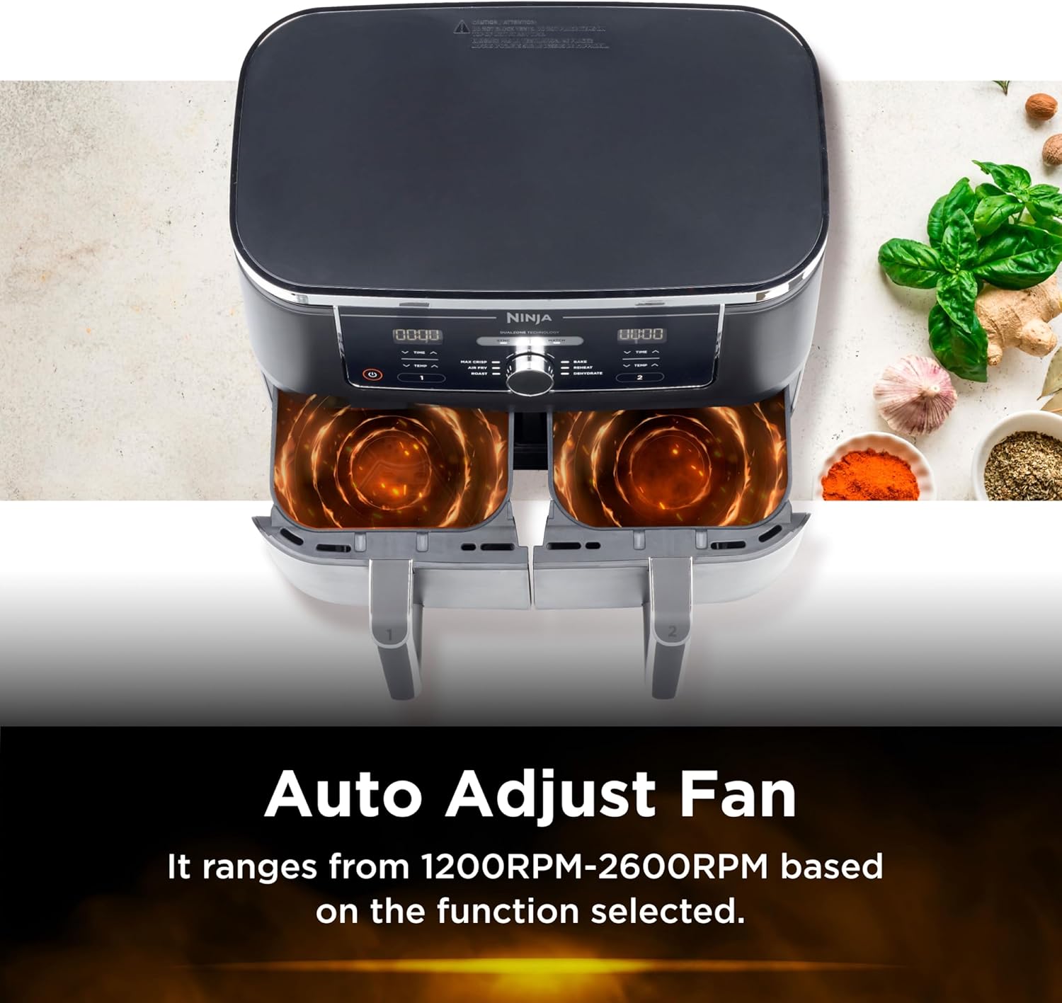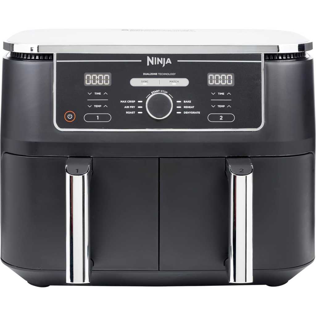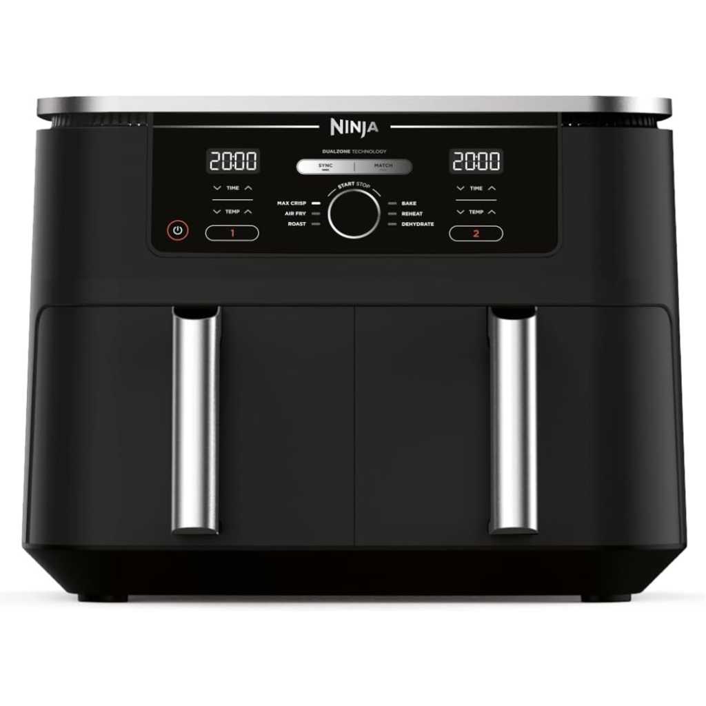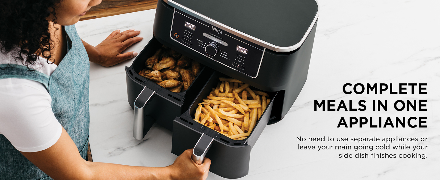 Key Features: Ninja Foodi MAX 9.5L Dual Zone Digital Air Fryer, 2 Drawers, 6-In-1, Uses No Oil, Air Fry, Max Crisp, Roast, Bake, Reheat, Dehydrate, Cook 8 Portions, Non-Stick Dishwasher Safe Baskets, B 9.5 L 2470 W AF400ME – Black. ENERGY-SAVING: Save up to 65% on your oven energy bill* (*testing and calculations based on recommended cook time for sausages, using air fry function versus conventional ovens). 2 INDEPENDENT COOKING ZONES: Cook 2 foods, 2 ways, both ready at the same time. Use different functions, times and temps in each drawer to create complete meals in one appliance, or cater to 2 tastes. 6 COOKING FUNCTIONS: Max Crisp, Air Fry, Roast, Bake, Reheat, Dehydrate. Cook from frozen to crispy. Up to 75% less fat* using the Air Fry function (*Tested against deep fried, hand-cut French fries). EXTRA-LARGE CAPACITY: Cook up to 8 portions. Each drawer fits up to 1.4kg fries or a 2kg chicken. Cook up to 75% faster than fan ovens* (*Tested against fish fingers and sausages, including preheat). INCLUDES: Ninja Dual Drawer Air Fryer, 2x non-stick dishwasher-safe 4.75L Drawers (9.5L total capacity) & Crisper Plates. Chef-created Recipe Guide. Weight: 8.9kg. Colour: Black. DIMENSIONS: H32.5cm x W41.5cm x D27cm. 2-year guarantee upon registration with Ninja .