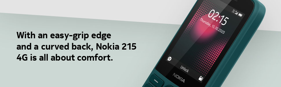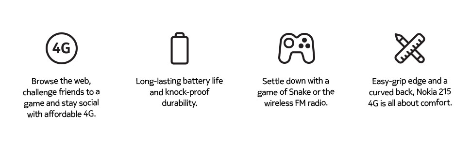 Key Features: Browse the web, challenge friends to a game and stay social with affordable 4G With long-lasting battery life and knock-proof durability, this is a phone you can rely on Bit of downtime? Settle down with a game of Snake or the wireless FM radio With an easy-grip edge and a curved back, Nokia 215 4G is all about comfort In the box: Nokia 215 4G Device, Battery, Quick start guide, Micro USB Charger