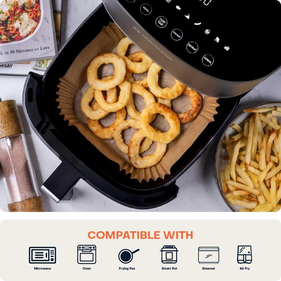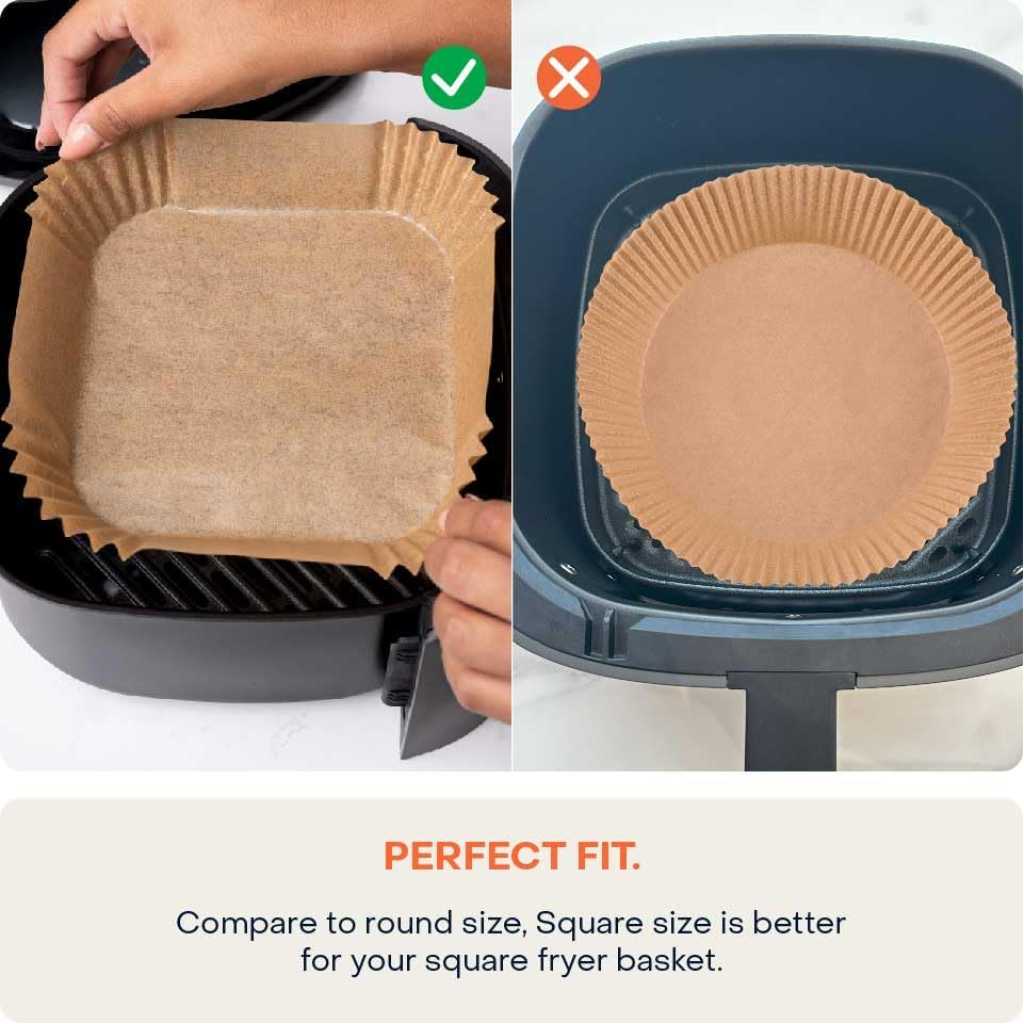 Eco-Friendly: Made from sustainable wood pulp material, offering an environmentally-conscious cooking accessory. Dual-Sided Silicone Coating: It’s coated with silicone on both sides, enhancing its non-stick capabilities and making it easy to handle and use. Non-Stick: Ensures that food releases effortlessly, reducing the need for additional oils or sprays and promoting healthier cooking. Greaseproof and Waterproof: Effectively wards off oil and water, keeping the air fryer basket and cooking tray clean and reducing cleanup time. Heat Resistant: It can withstand temperature up to 220°C. Food-safe: Free from harmful chemicals, ensuring that the liner does not alter the flavor or safety of the food. Convenient and Easy to Use: Compatible with Air Fryers from 3.3L – 5.2L ensuring quick and easy placement inside the air fryer basket. Versatile Cooking Applications: Ideal for a wide range of dishes, including meats, vegetables, and baked goods, enhancing the overall air frying experience.