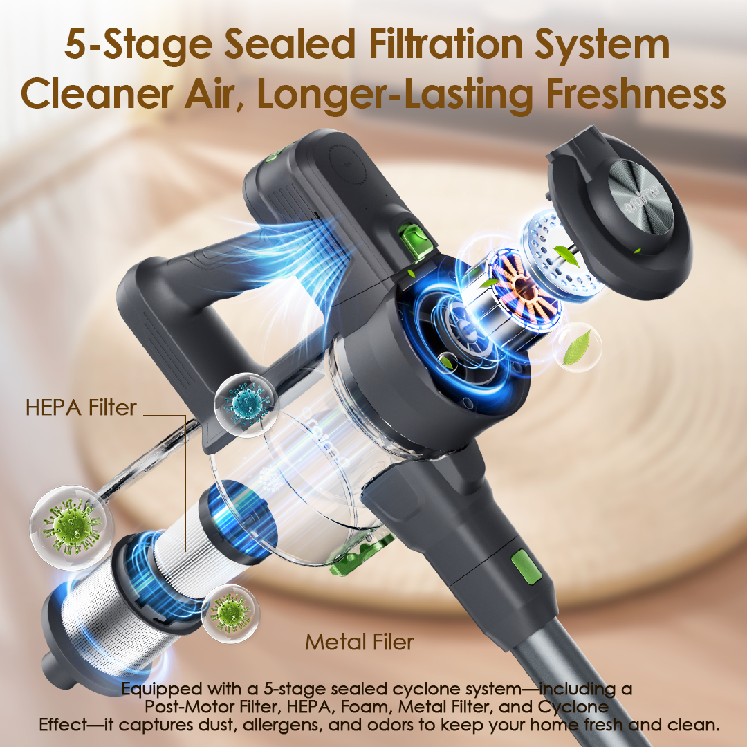 Key Features: High-Efficiency Suction: Strong motor power delivers deep cleaning on carpets and hard floors. 5-Stage Sealed Filtration: Includes HEPA, foam, metal, and post-motor filters to trap fine dust and allergens. One-Button Dust Empty: Hygienic disposal without touching dirt. Adjustable Telescopic Rod: Customizable length for comfortable cleaning. Self-Standing Design: Stands upright without wall support for easy storage. Detachable Battery: Swap batteries for extended cleaning sessions. 6-in-1 Versatility: Suitable for multiple surfaces and cleaning needs.