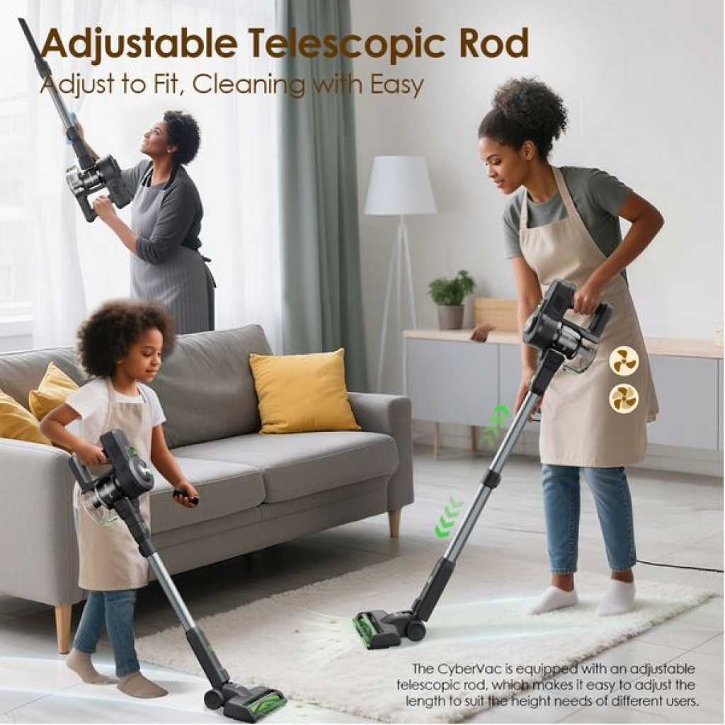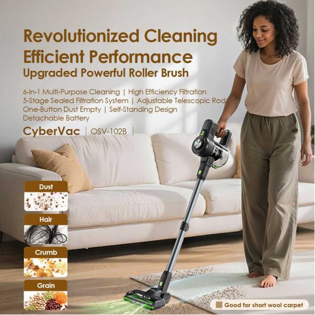 Power Adapter Input: 100-240V 50/60Hz Power Adapter Output: 26.5V 500mA Battery Capacity: 22.2V 2200mAh Rated Power: 180W Usage Type: Dry Product Features: High-Efficiency Filtration Powerful Suction. Faster Cleaning. Equipped with a high-performance motor, it captures fine dust and allergens from carpets and hard floors–deliveringa deep whole-home clean in half the time. 5-Stage Sealed Filtration System Cleaner Air, Longer-Lasting Freshness Equipped with a 5-stage sealed cyclone system-including a Post-Motor Filter, HEPA, Foam, Metal Filter, and Cyclorhe Effect-it captures dust, allergens, and odors to keep your home fresh and clean. One-Button Dust Empty No Mess. No Contact. No Hassle you never have to touch the dirt. Adjustable Telescopic Rod Adjust to Fit, Cleaning with Easy The CyberVac is equipped with an adjustable telescopic rod, which makes it easy to adjust the length to suit the height needs of different users. Self-Standing Design Hands-Free Convenience Anywhere CyberVac stands upright on its own-no wall, dock, or holder needed-making storage effortless wherever you are. Detachable Battery Flexible Charging, Always Ready After the product has expired, you only need to purchasea battery pack separately. What’s in the Box? 1 x Cordless Stick Vacuum 4 x HEPA Filter 1 x Welcome Guide 1 x Long Suction Nozzle 1 x Short Brush Head 1 x Storage bracket 1 x Power Adapter 1 x Cleaning Brush 1 x Welcome Guide