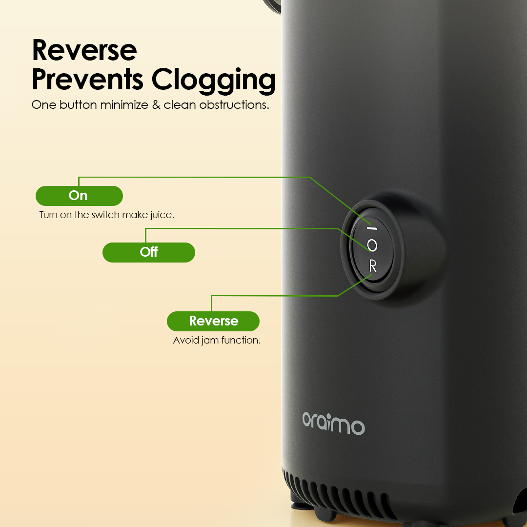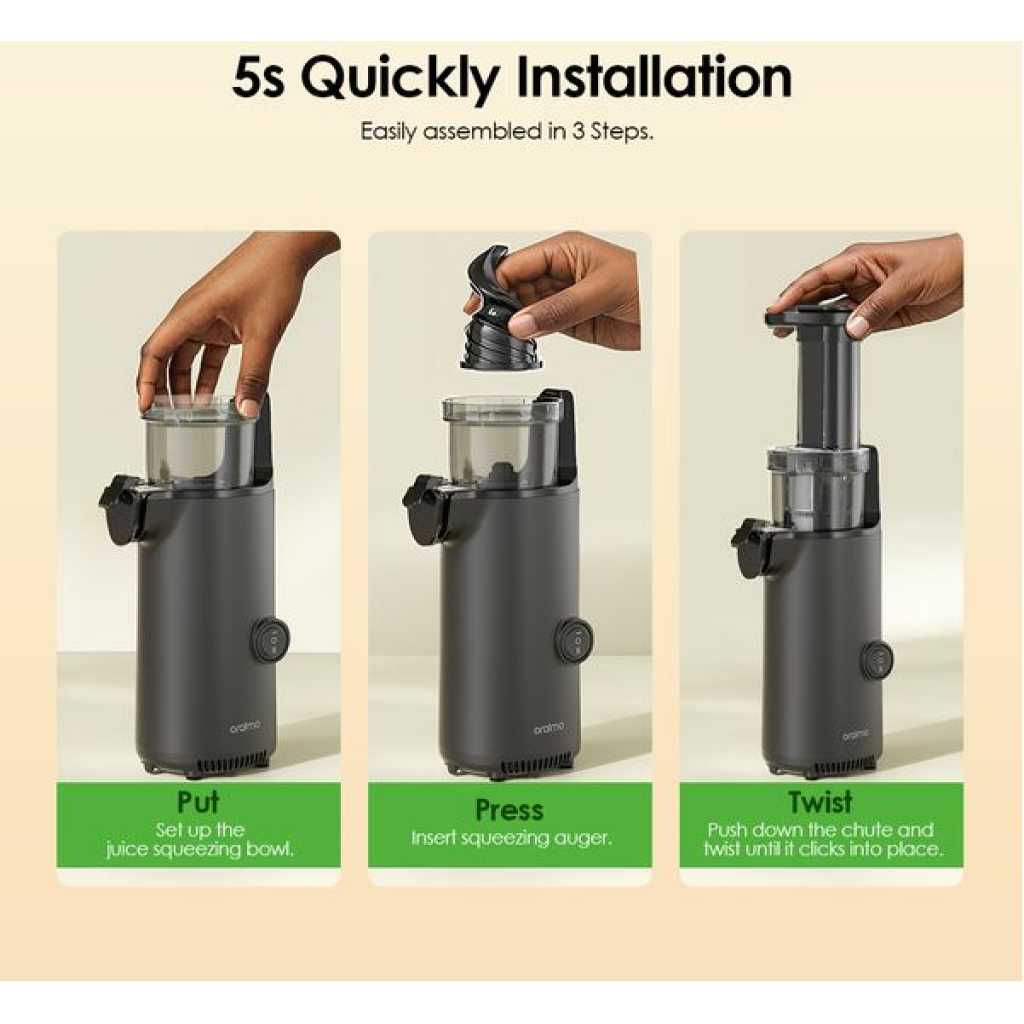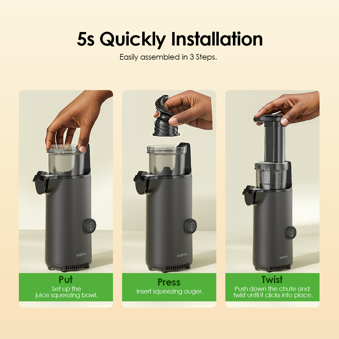 Key Features: Compact & Space-Saving: Slim, bottle-sized design fits easily on countertops or in storage. High Juice Yield: Extracts pure juice without adding water, preserving natural nutrients. Automatic Separation: Effortlessly separates pulp from juice for smooth results. Efficient Low-Oxidation Juicing: Non-metallic blade head minimizes oxidation for fresher juice. Reverse Function: Clears clogs instantly to keep juicing smooth. Quick Setup: Installs in seconds with simple 3-step assembly. Easy Cleaning: Three detachable parts rinse clean in about a minute. Quiet Operation: Works at less than 70 dB for comfortable use.
