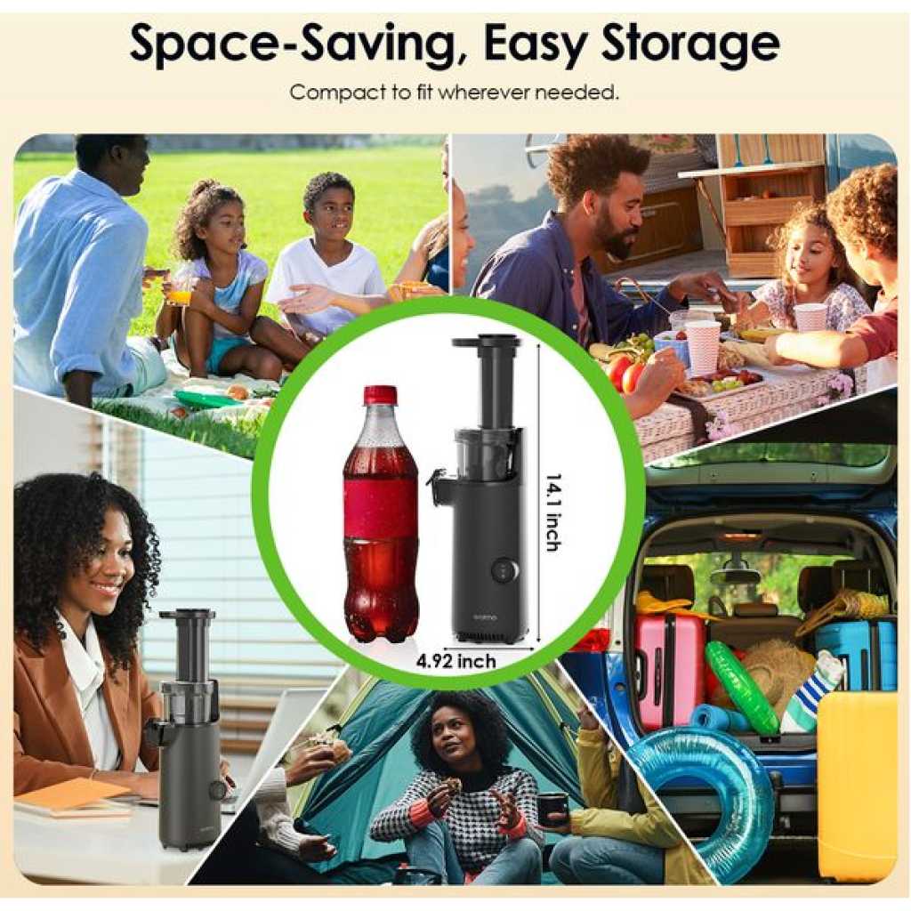 Product Material: PC+ABS+COPPER+PP Rating Voltage: 220V-240V 50/60Hz Rating Power: 130W Capacity: 500ml Noise: <70dB Net Weight: 2.6kg Product Dimensions: 125 x 100 x 360 mm Model: OMJ-201A Product Features: Space-Saving, Easy Storage Compact to fit wherever needed The EasyJuice Mini is as compact as a Coke bottle, easy to store, and features a portable design for effortless travel. High Juice Yield No need to add water to preserves all nutrients No water added, yet ensures a high juice yield, preserving the original juice from fresh fruits. No Manual Straining Needed Automatic pulp and juice separation Enjoy smooth, pulp-free juice effortlessly, without the need for manual filtering or extra steps. Efficient Juicing, Nutrient-Rich Enhanced blade effectively minimizes juice oxidation The non-metallic blade head design for efficient juicing, retaining maximum nutrients with no waste. Convenient Ingredient Placement Food tray design reduce operational hassle Convenient ingredient placement to reduce operational hassle. Reverse Prevents Clogging One button minimize & clean obstructions Easily clear pulp blockages with the reverse function for smooth juicing. 5s Quickly Installation Easily assembled in 3 Steps 5-second setup, 3-second disassembly, simple operation with no hassle. Rinse Clean in One Go Cleaning stains takes only 1 minute 3 easy-to-remove parts, no residue or odor, just rinse to clean. What’s in the box? Juicer Body x 1 Juicer Cup x 1 Pulp Container x 1 Pusher x 1 Cleaning Brush x 1 Welcome Guideline x 1
