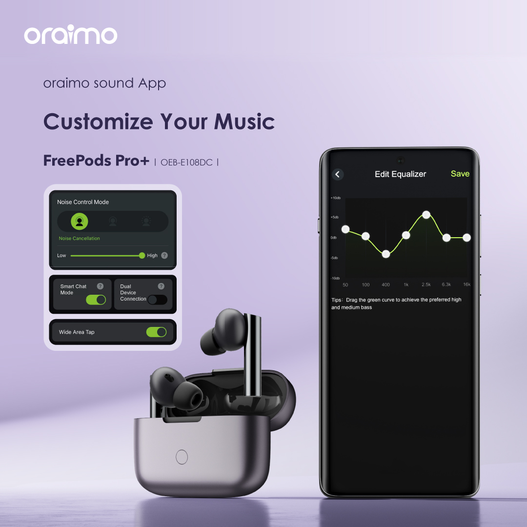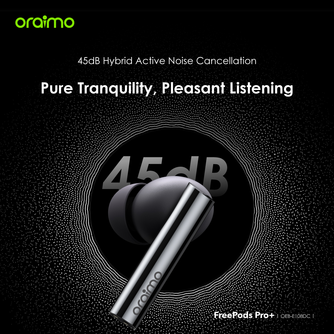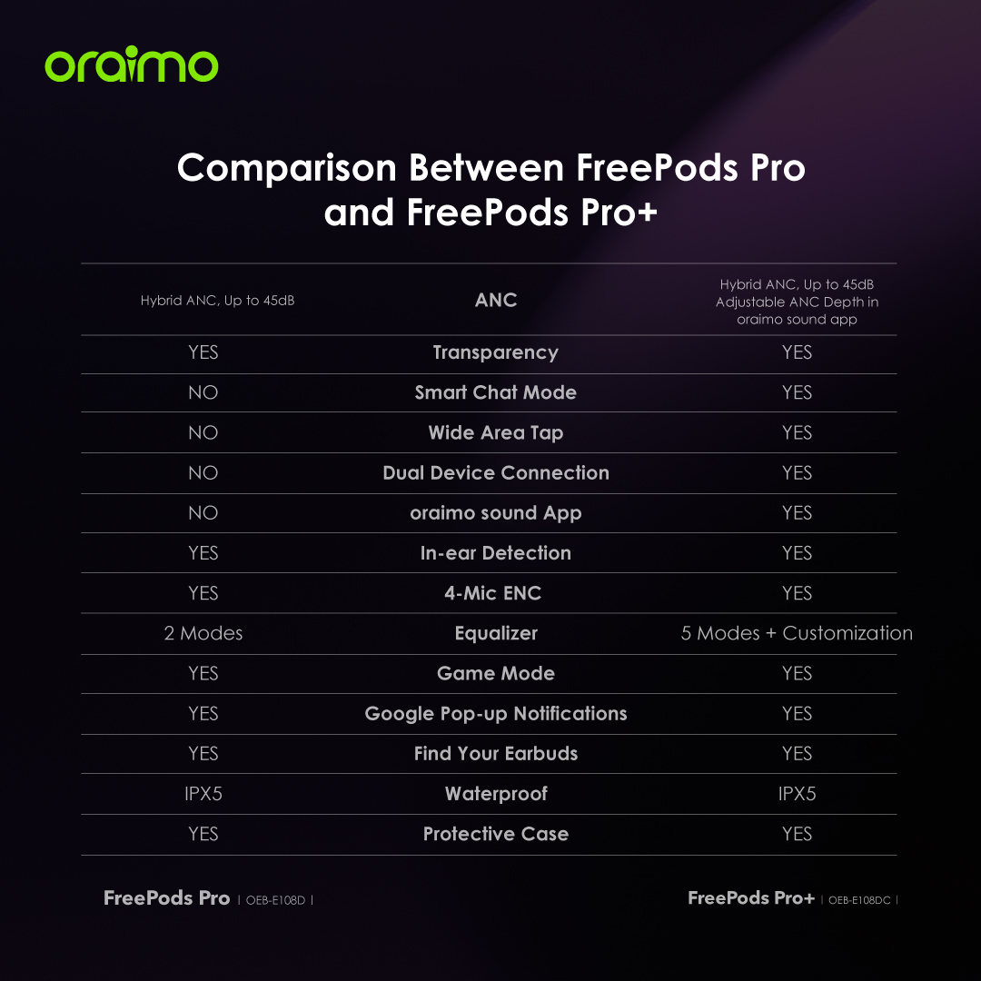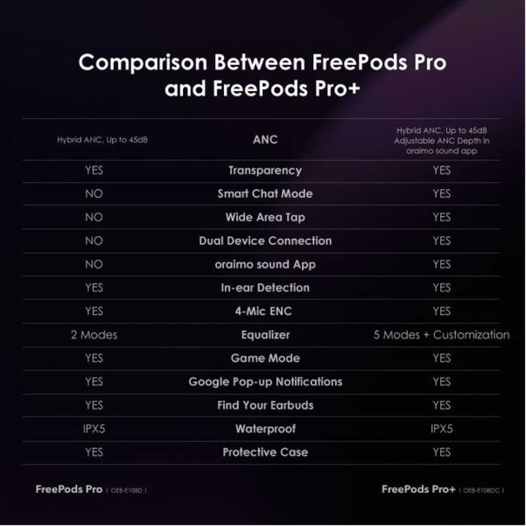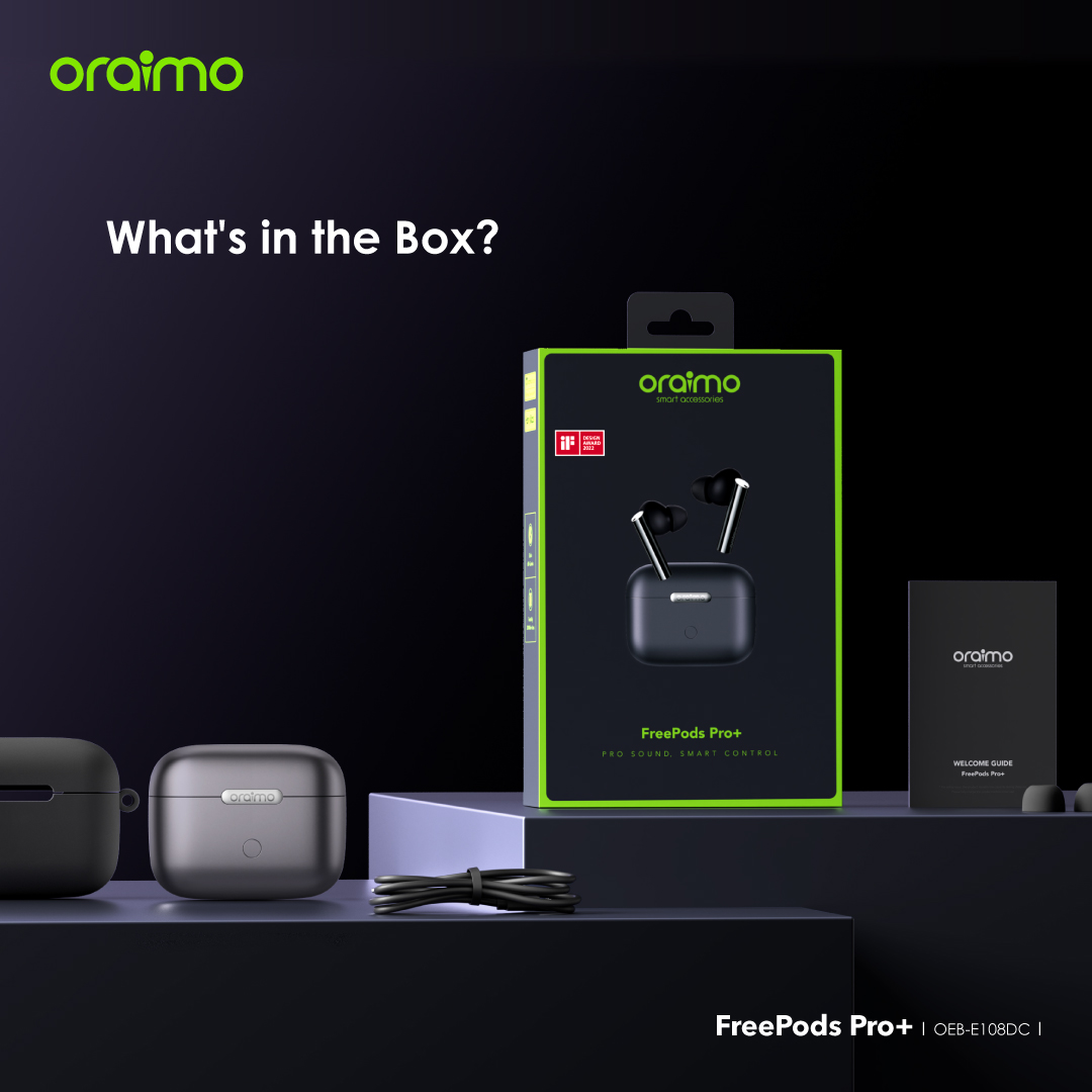 Product Parameters: Bluetooth Version: 5.4 Bluetooth Range: 10m Battery Capacity: 74mAh(Each Earbud), 510mAh(Case) Case Input: Type-C Protective Case: Yes *oraimo Lab test results Model: OEB-E108DC Product Features: 45dB Hybrid Active Noise Cancellation Pure Tranquility, Pleasant Listening FreePods Pro+ provides up to 45dB noise reduction, effortlessly eliminates distractions, allowing you to immerse yourself in crystal-clear audio. You can fine-tune the noise cancellation depth using the oraimo Sound app for the most comfortable audio experience. Smart Chat Mode Seamless Integration of Music and Speech FreePods Pro+ will automatically change the current mode into Transparency when it detects your voice. Ideal for multitaskers, engage effortlessly in discussions without ever hitting pause on your device. *Smart Chat Mode might be triggered by chewing, swallowing, coughing, and other unusual noises. Activate it on the oraimo Sound app. Wide Area Tap Prompt Responsiveness In Wide Range Control the audio with intuitive wide-area taps on your ears without any physical contact with the earbuds, allowing for effortless control of tracks and play mode. *Activate it on oraimo Sound app. Tap according to the location of the diagram. oraimo Sound App Customize Your Music Compatible with oraimo Sound app, users are able to enjoy various functions, such as customized EQ , personalized control settings, etc. 4-mic ENC HD Calling Clear Voice in Call The beamforming array and AI Deep Neural Network algorithm reduce the disruptive noise around the caller. Optimized air duct suppresses wind noise. Therefore, FreePods Pro+ is designed to offer a clear and pure voice in calls. In-ear Detection Smarter and Easier oraimo FreePods Pro+ comes with inbuilt sensitive sensors that detect when they are being used. Music playback automatically pauses when you take them off and resumes when you put them back on. Dual Device Connection Freely Switch Between Gaming and Phone Calls FreePods Pro+ can connect to 2 devices simultaneously, allowing you to play games on a tablet without missing calls from your phone. *Refer to the Welcome Guide to connect to another device. Low-latency Game Mode Audio and Video Instant Sync Featuring low-latency Game Mode and specially tuned gaming sound, the FreePods Pro+ allow you to emerge in your game with audio and video sync in seconds. Pop-up Notifications Google Fast Pairing Google Fast Pairing function supports automatic fast pairing with Pop-up notifications between FreePods Pro+ and your Google devices. *Compatible with Android 6.0 or above, the device must also support Google Play services. IPX5 Waterproof & Sweat Protection Not Afraid of Water and Sweat Featured with an IPX5 waterproof rating and nano coating, splashes and sweat won’t stop music playing. *Water and sweatproof is only available for earbuds and not for the charging case. What’s in the box? Comparison Between FreePods Pro and FreePods Pro+