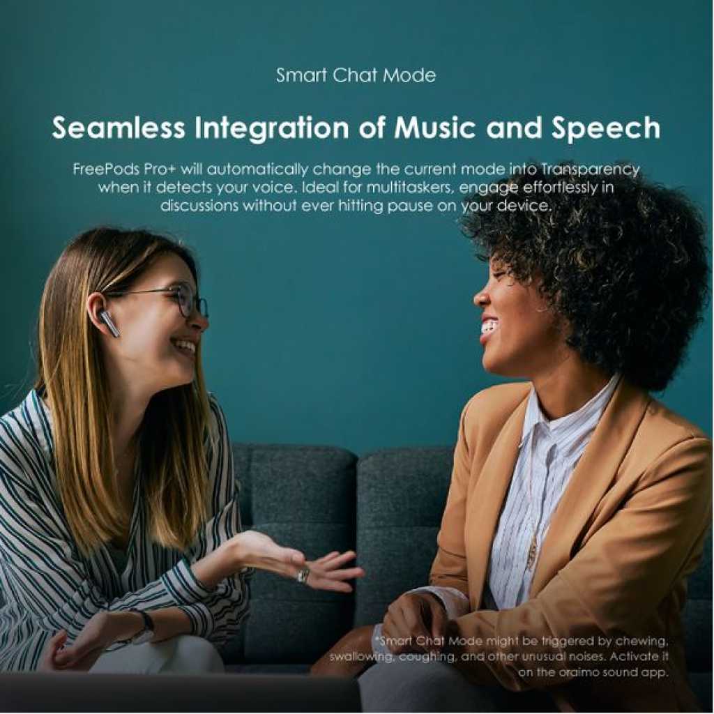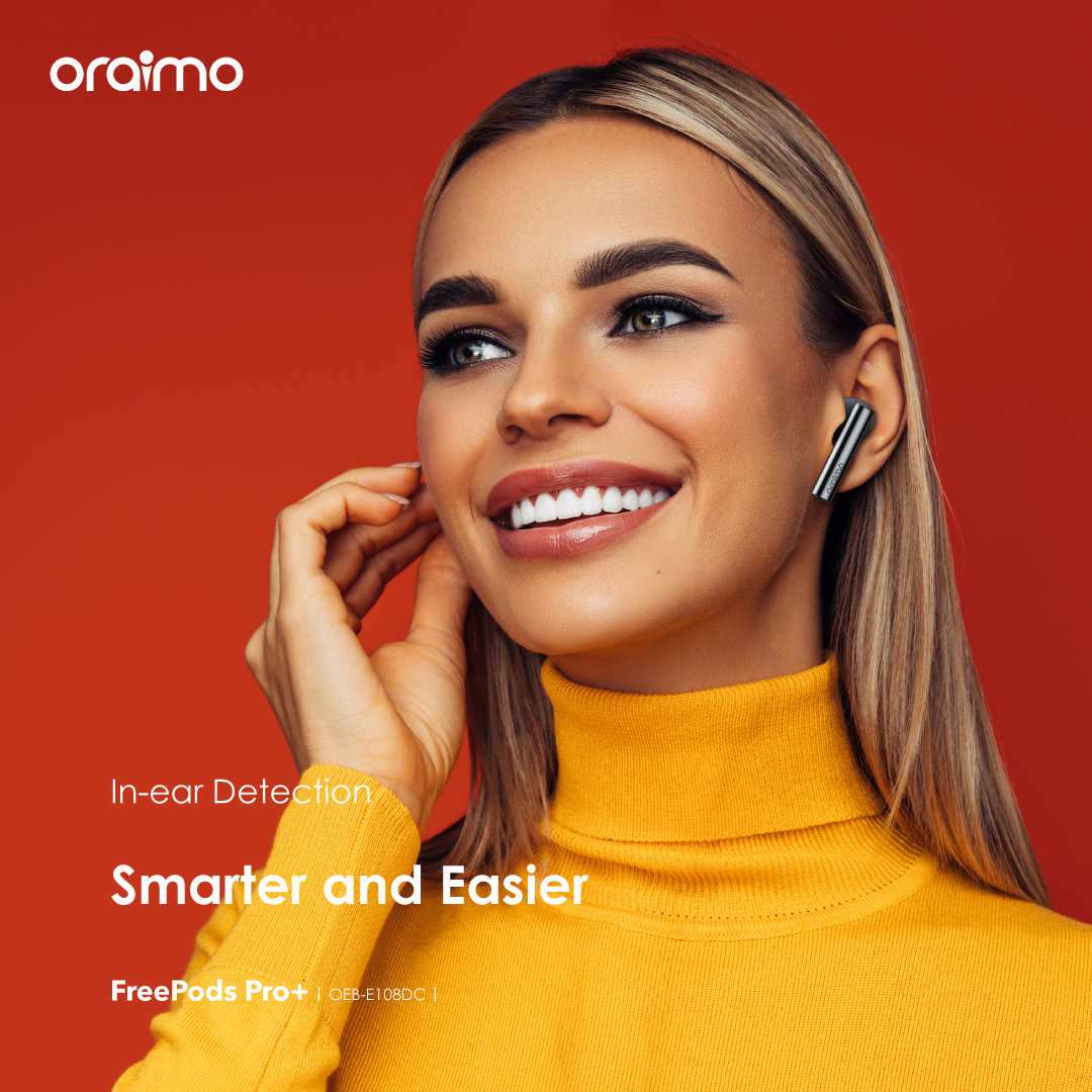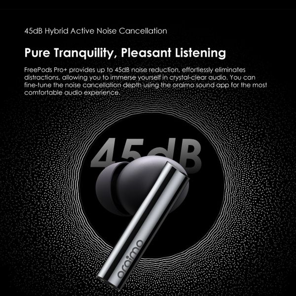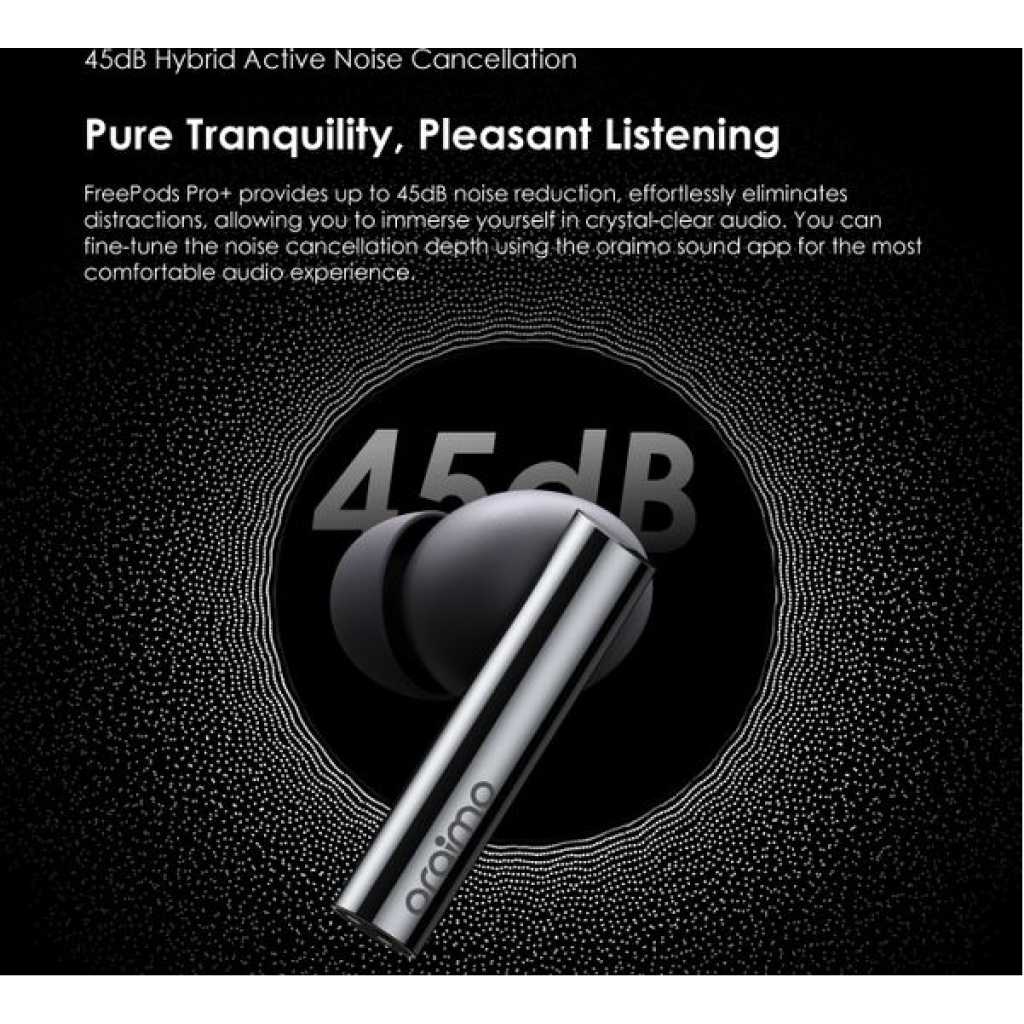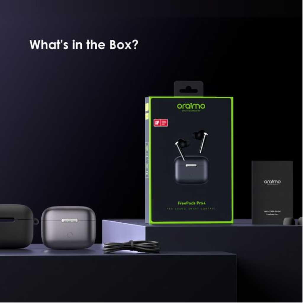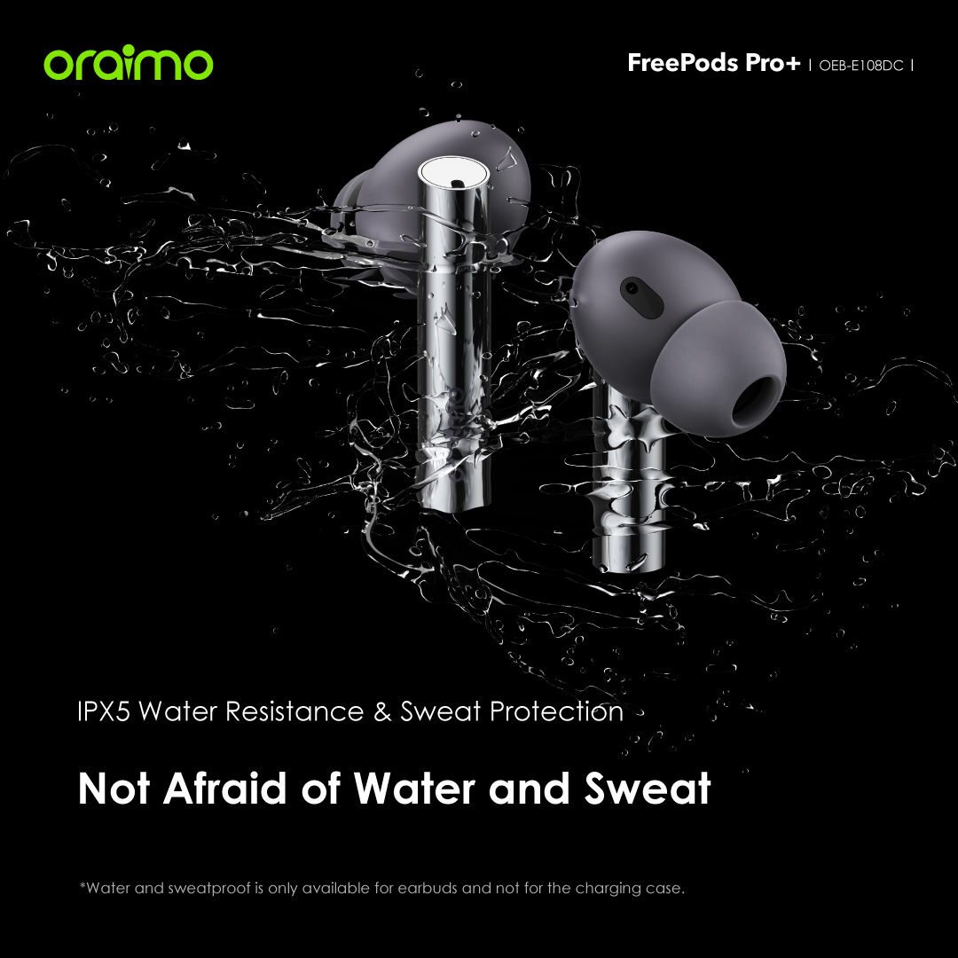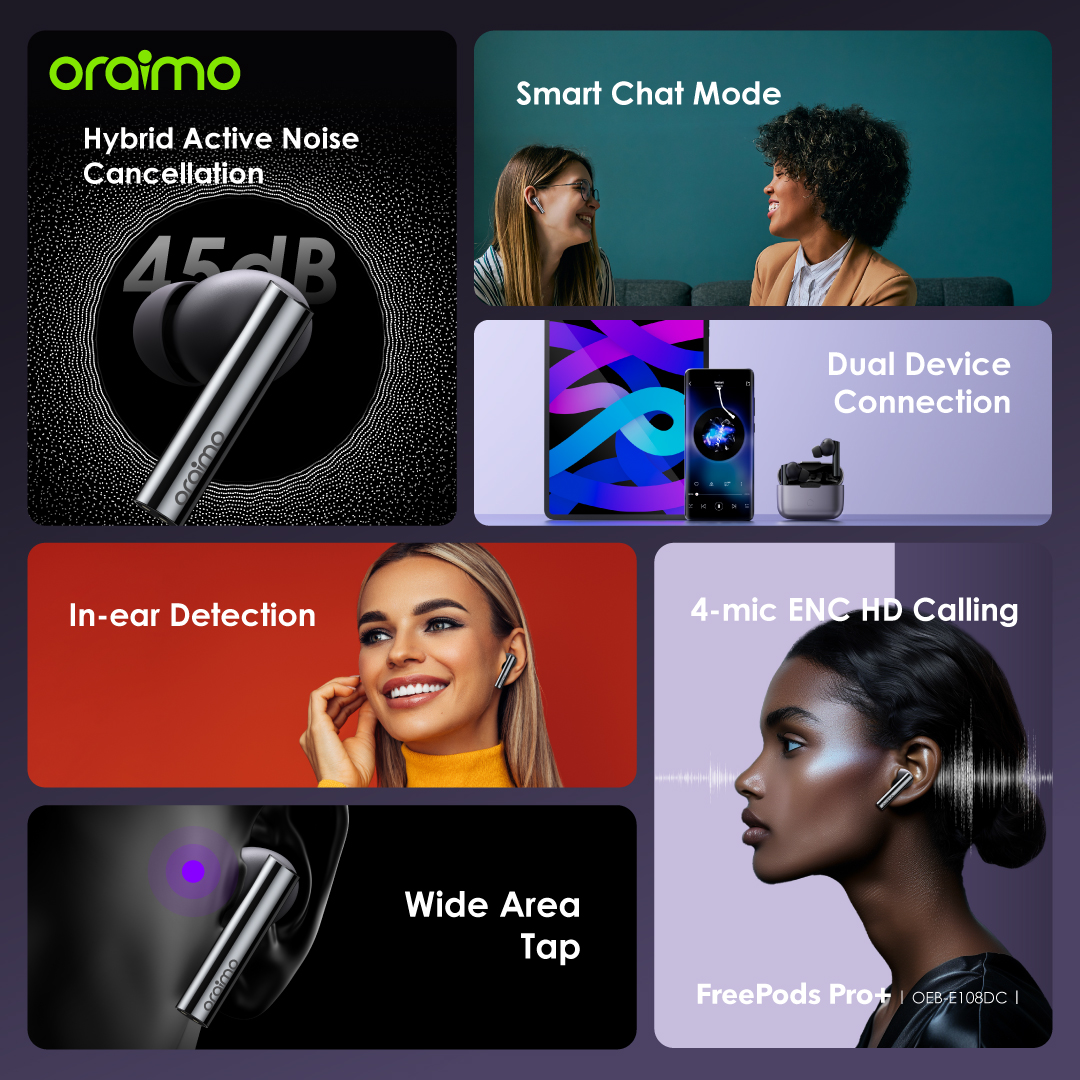 Product Parameters: Bluetooth Version: 5.4 Bluetooth Range: 10m Battery Capacity: 74mAh(Each Earbud), 510mAh(Case) Case Input: Type-C Protective Case: Yes *oraimo Lab test results Model: OEB-E108DC Product Features: 45dB Hybrid Active Noise Cancellation Pure Tranquility, Pleasant Listening FreePods Pro+ provides up to 45dB noise reduction, effortlessly eliminates distractions, allowing you to immerse yourself in crystal-clear audio. You can fine-tune the noise cancellation depth using the oraimo Sound app for the most comfortable audio experience. Smart Chat Mode Seamless Integration of Music and Speech FreePods Pro+ will automatically change the current mode into Transparency when it detects your voice. Ideal for multitaskers, engage effortlessly in discussions without ever hitting pause on your device. *Smart Chat Mode might be triggered by chewing, swallowing, coughing, and other unusual noises. Activate it on the oraimo Sound app. Wide Area Tap Prompt Responsiveness In Wide Range Control the audio with intuitive wide-area taps on your ears without any physical contact with the earbuds, allowing for effortless control of tracks and play mode. *Activate it on oraimo Sound app. Tap according to the location of the diagram. oraimo Sound App Customize Your Music Compatible with oraimo Sound app, users are able to enjoy various functions, such as customized EQ , personalized control settings, etc. 4-mic ENC HD Calling Clear Voice in Call The beamforming array and AI Deep Neural Network algorithm reduce the disruptive noise around the caller. Optimized air duct suppresses wind noise. Therefore, FreePods Pro+ is designed to offer a clear and pure voice in calls. In-ear Detection Smarter and Easier oraimo FreePods Pro+ comes with inbuilt sensitive sensors that detect when they are being used. Music playback automatically pauses when you take them off and resumes when you put them back on. Dual Device Connection Freely Switch Between Gaming and Phone Calls FreePods Pro+ can connect to 2 devices simultaneously, allowing you to play games on a tablet without missing calls from your phone. *Refer to the Welcome Guide to connect to another device. Low-latency Game Mode Audio and Video Instant Sync Featuring low-latency Game Mode and specially tuned gaming sound, the FreePods Pro+ allow you to emerge in your game with audio and video sync in seconds. Pop-up Notifications Google Fast Pairing Google Fast Pairing function supports automatic fast pairing with Pop-up notifications between FreePods Pro+ and your Google devices. *Compatible with Android 6.0 or above, the device must also support Google Play services. IPX5 Waterproof & Sweat Protection Not Afraid of Water and Sweat Featured with an IPX5 waterproof rating and nano coating, splashes and sweat won’t stop music playing. *Water and sweatproof is only available for earbuds and not for the charging case. What’s in the box? Comparison Between FreePods Pro and FreePods Pro+