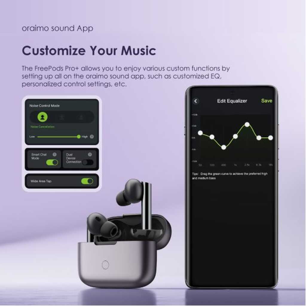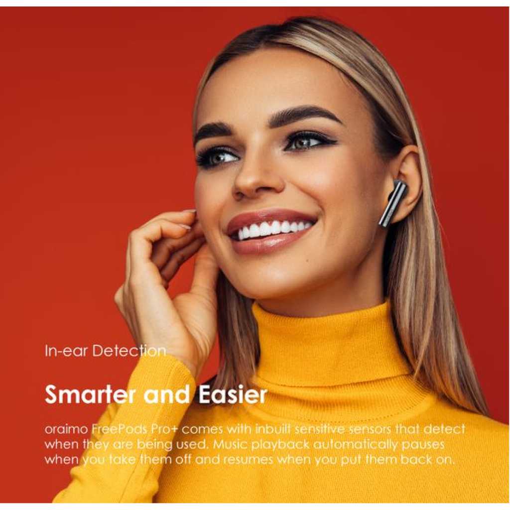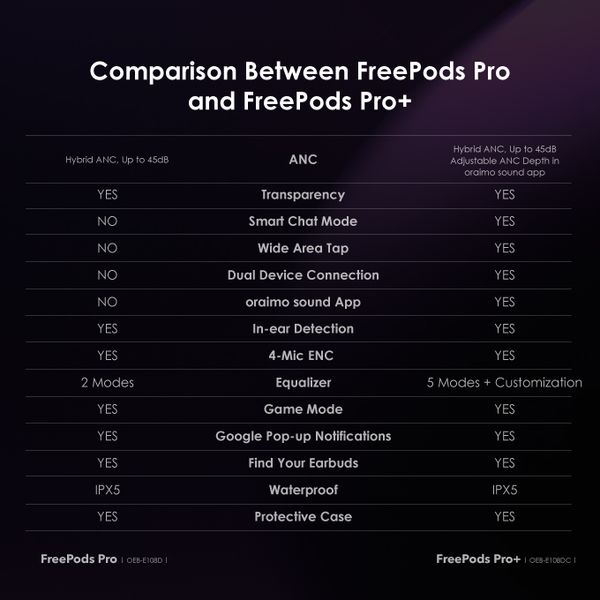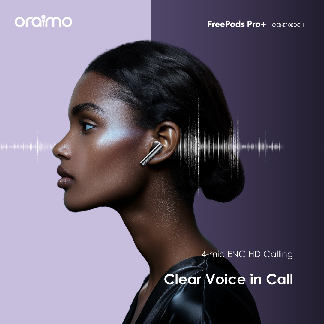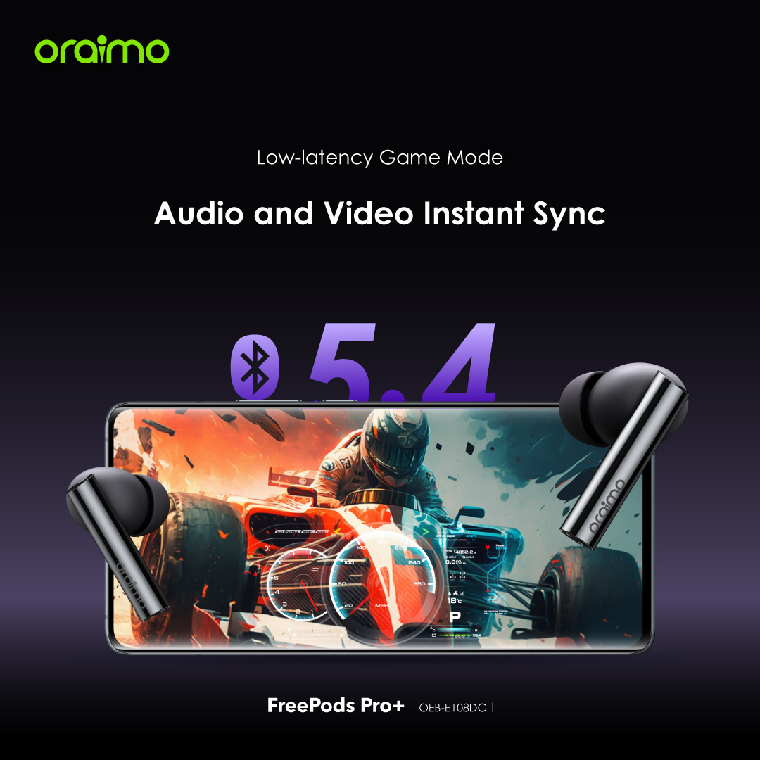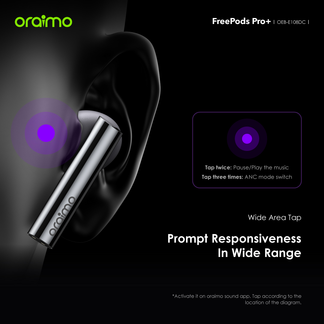 Product Parameters: Bluetooth Version: 5.4 Bluetooth Range: 10m Battery Capacity: 74mAh(Each Earbud), 510mAh(Case) Case Input: Type-C Protective Case: Yes *oraimo Lab test results Model: OEB-E108DC Product Features: 45dB Hybrid Active Noise Cancellation Pure Tranquility, Pleasant Listening FreePods Pro+ provides up to 45dB noise reduction, effortlessly eliminates distractions, allowing you to immerse yourself in crystal-clear audio. You can fine-tune the noise cancellation depth using the oraimo Sound app for the most comfortable audio experience. Smart Chat Mode Seamless Integration of Music and Speech FreePods Pro+ will automatically change the current mode into Transparency when it detects your voice. Ideal for multitaskers, engage effortlessly in discussions without ever hitting pause on your device. *Smart Chat Mode might be triggered by chewing, swallowing, coughing, and other unusual noises. Activate it on the oraimo Sound app. Wide Area Tap Prompt Responsiveness In Wide Range Control the audio with intuitive wide-area taps on your ears without any physical contact with the earbuds, allowing for effortless control of tracks and play mode. *Activate it on oraimo Sound app. Tap according to the location of the diagram. oraimo Sound App Customize Your Music Compatible with oraimo Sound app, users are able to enjoy various functions, such as customized EQ , personalized control settings, etc. 4-mic ENC HD Calling Clear Voice in Call The beamforming array and AI Deep Neural Network algorithm reduce the disruptive noise around the caller. Optimized air duct suppresses wind noise. Therefore, FreePods Pro+ is designed to offer a clear and pure voice in calls. In-ear Detection Smarter and Easier oraimo FreePods Pro+ comes with inbuilt sensitive sensors that detect when they are being used. Music playback automatically pauses when you take them off and resumes when you put them back on. Dual Device Connection Freely Switch Between Gaming and Phone Calls FreePods Pro+ can connect to 2 devices simultaneously, allowing you to play games on a tablet without missing calls from your phone. *Refer to the Welcome Guide to connect to another device. Low-latency Game Mode Audio and Video Instant Sync Featuring low-latency Game Mode and specially tuned gaming sound, the FreePods Pro+ allow you to emerge in your game with audio and video sync in seconds. Pop-up Notifications Google Fast Pairing Google Fast Pairing function supports automatic fast pairing with Pop-up notifications between FreePods Pro+ and your Google devices. *Compatible with Android 6.0 or above, the device must also support Google Play services. IPX5 Waterproof & Sweat Protection Not Afraid of Water and Sweat Featured with an IPX5 waterproof rating and nano coating, splashes and sweat won’t stop music playing. *Water and sweatproof is only available for earbuds and not for the charging case. What’s in the box? Comparison Between FreePods Pro and FreePods Pro+