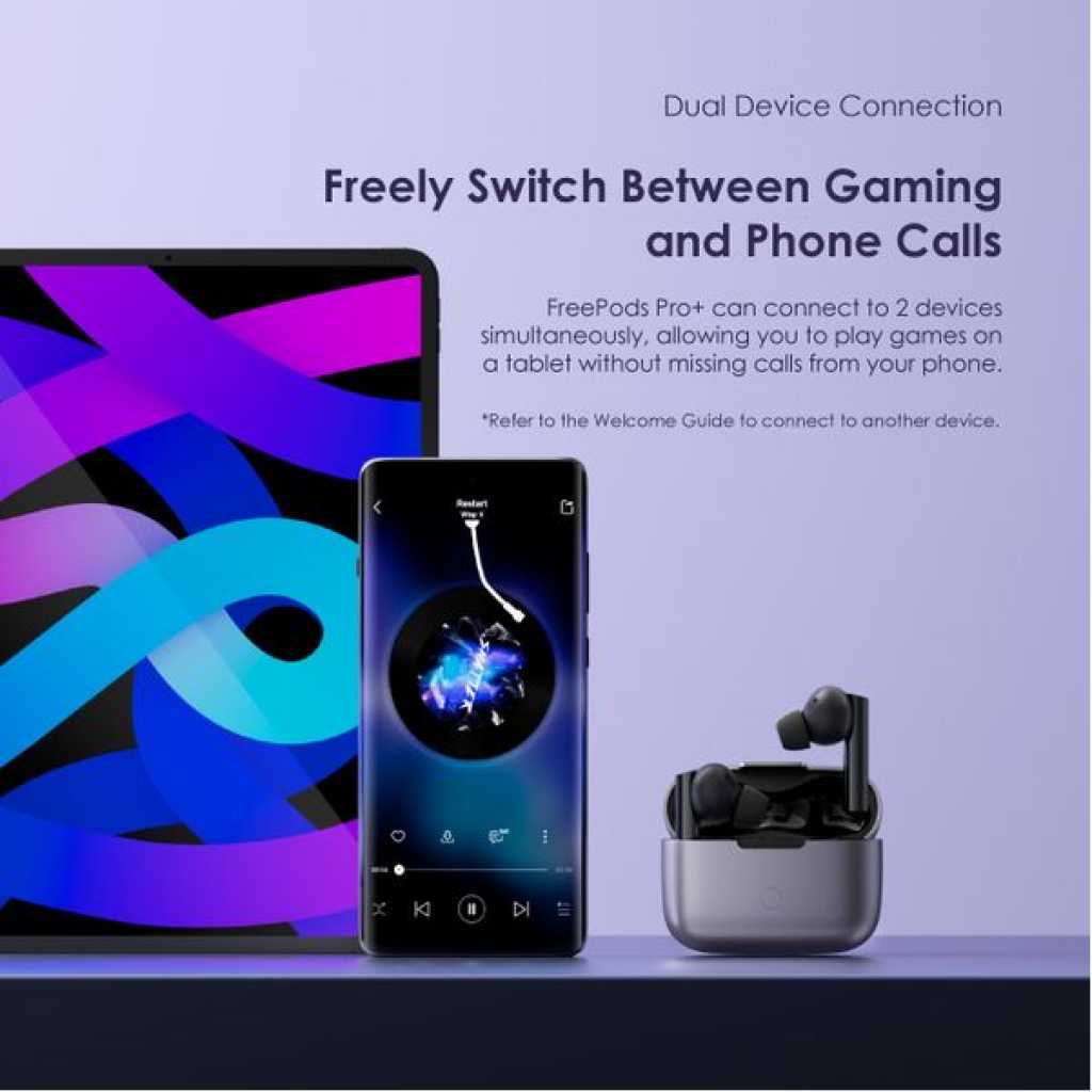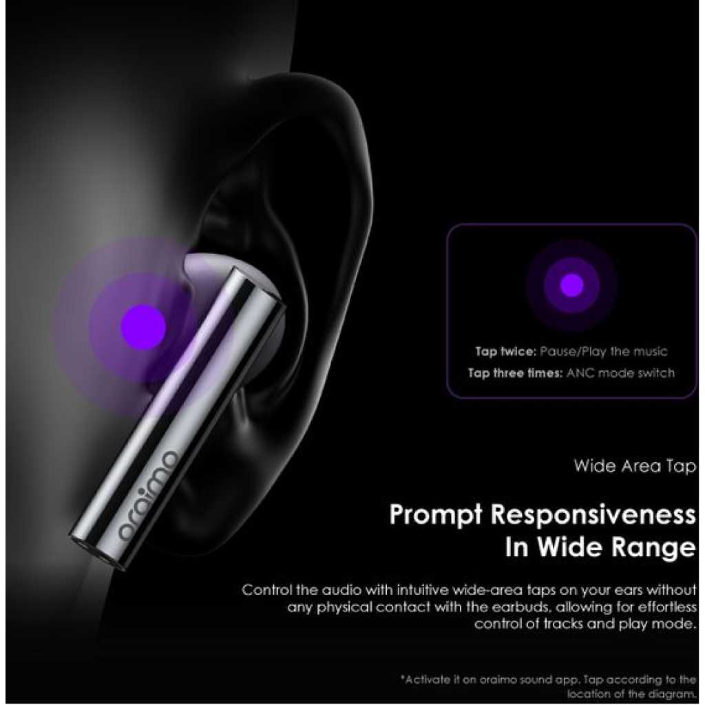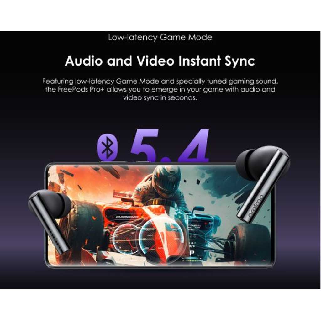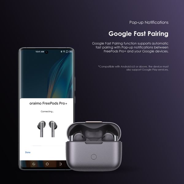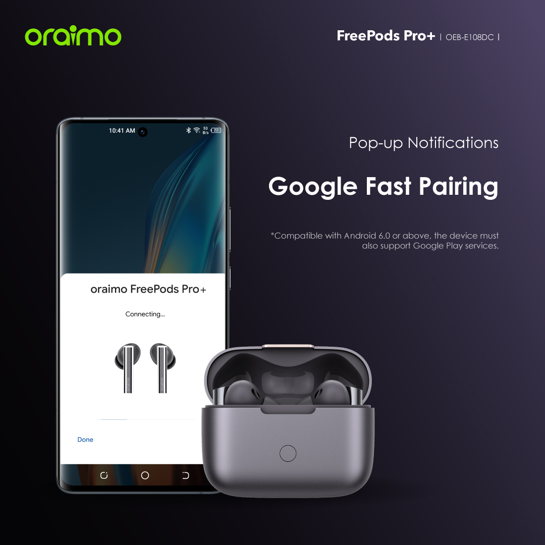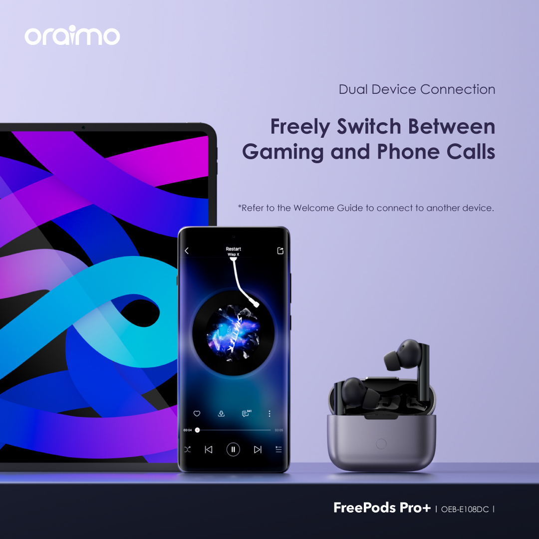 Product Parameters: Bluetooth Version: 5.4 Bluetooth Range: 10m Battery Capacity: 74mAh(Each Earbud), 510mAh(Case) Case Input: Type-C Protective Case: Yes *oraimo Lab test results Model: OEB-E108DC Product Features: 45dB Hybrid Active Noise Cancellation Pure Tranquility, Pleasant Listening FreePods Pro+ provides up to 45dB noise reduction, effortlessly eliminates distractions, allowing you to immerse yourself in crystal-clear audio. You can fine-tune the noise cancellation depth using the oraimo Sound app for the most comfortable audio experience. Smart Chat Mode Seamless Integration of Music and Speech FreePods Pro+ will automatically change the current mode into Transparency when it detects your voice. Ideal for multitaskers, engage effortlessly in discussions without ever hitting pause on your device. *Smart Chat Mode might be triggered by chewing, swallowing, coughing, and other unusual noises. Activate it on the oraimo Sound app. Wide Area Tap Prompt Responsiveness In Wide Range Control the audio with intuitive wide-area taps on your ears without any physical contact with the earbuds, allowing for effortless control of tracks and play mode. *Activate it on oraimo Sound app. Tap according to the location of the diagram. oraimo Sound App Customize Your Music Compatible with oraimo Sound app, users are able to enjoy various functions, such as customized EQ , personalized control settings, etc. 4-mic ENC HD Calling Clear Voice in Call The beamforming array and AI Deep Neural Network algorithm reduce the disruptive noise around the caller. Optimized air duct suppresses wind noise. Therefore, FreePods Pro+ is designed to offer a clear and pure voice in calls. In-ear Detection Smarter and Easier oraimo FreePods Pro+ comes with inbuilt sensitive sensors that detect when they are being used. Music playback automatically pauses when you take them off and resumes when you put them back on. Dual Device Connection Freely Switch Between Gaming and Phone Calls FreePods Pro+ can connect to 2 devices simultaneously, allowing you to play games on a tablet without missing calls from your phone. *Refer to the Welcome Guide to connect to another device. Low-latency Game Mode Audio and Video Instant Sync Featuring low-latency Game Mode and specially tuned gaming sound, the FreePods Pro+ allow you to emerge in your game with audio and video sync in seconds. Pop-up Notifications Google Fast Pairing Google Fast Pairing function supports automatic fast pairing with Pop-up notifications between FreePods Pro+ and your Google devices. *Compatible with Android 6.0 or above, the device must also support Google Play services. IPX5 Waterproof & Sweat Protection Not Afraid of Water and Sweat Featured with an IPX5 waterproof rating and nano coating, splashes and sweat won’t stop music playing. *Water and sweatproof is only available for earbuds and not for the charging case. What’s in the box? Comparison Between FreePods Pro and FreePods Pro+