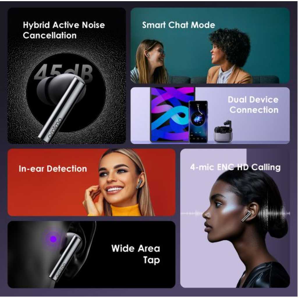 Key Features: Hybrid Active Noise Cancellation (ANC) up to 45dB Wide Area Tap functionality Smart Chat Mode Protective case included Bluetooth Version: 5.2 Bluetooth Range: 10m Battery Capacity: 74mAh (Each Earbud), 510mAh (Case) Type-C charging case IPX5 water-resistant 4-mic Environmental Noise Cancellation (ENC) for HD calling In-ear detection Find My Earphones feature Google Pop-up Notification support Low-latency Game Mode