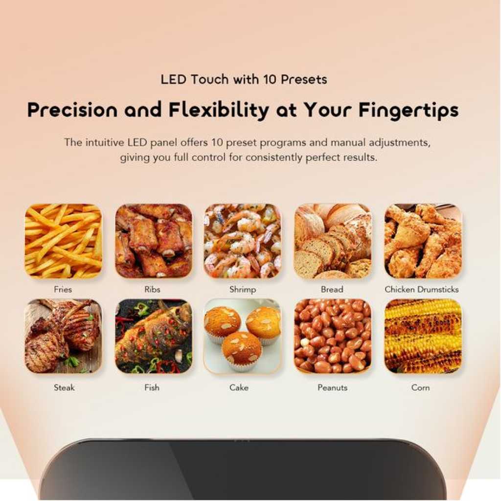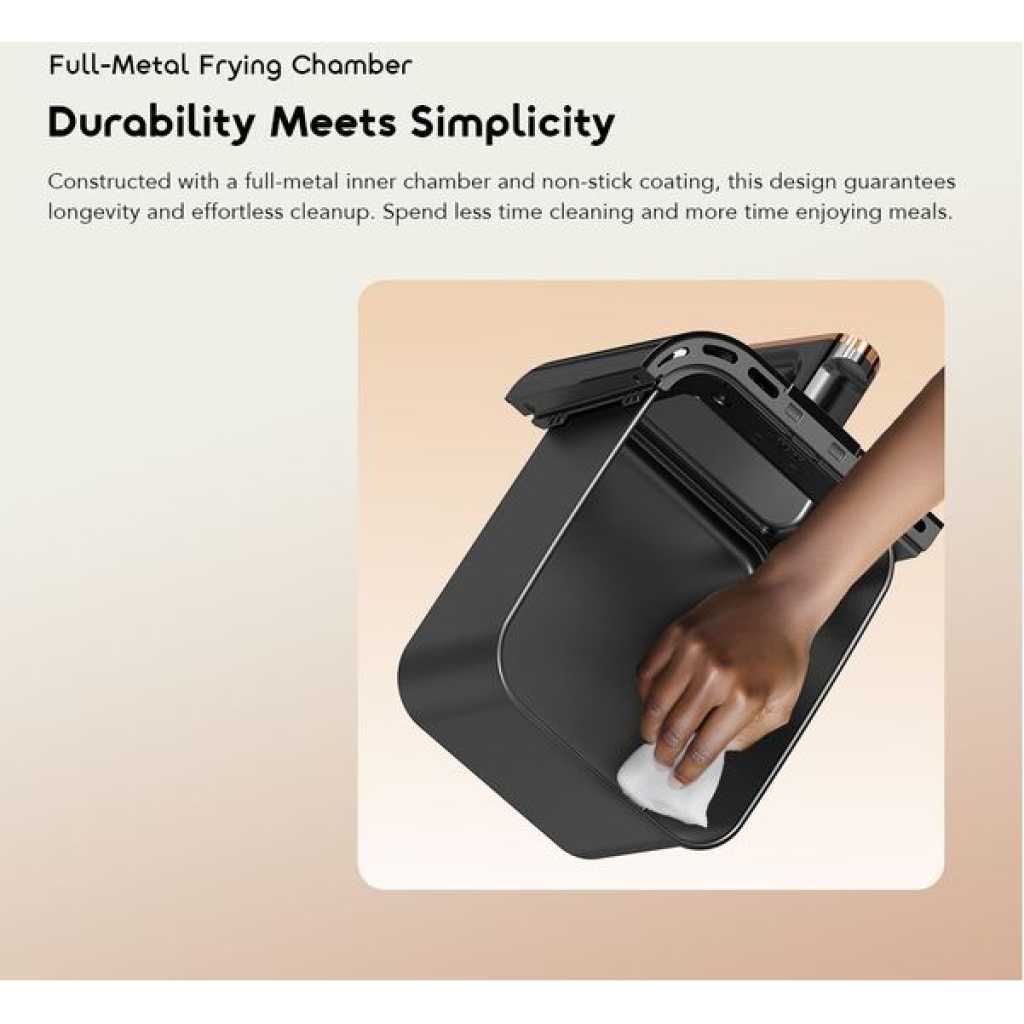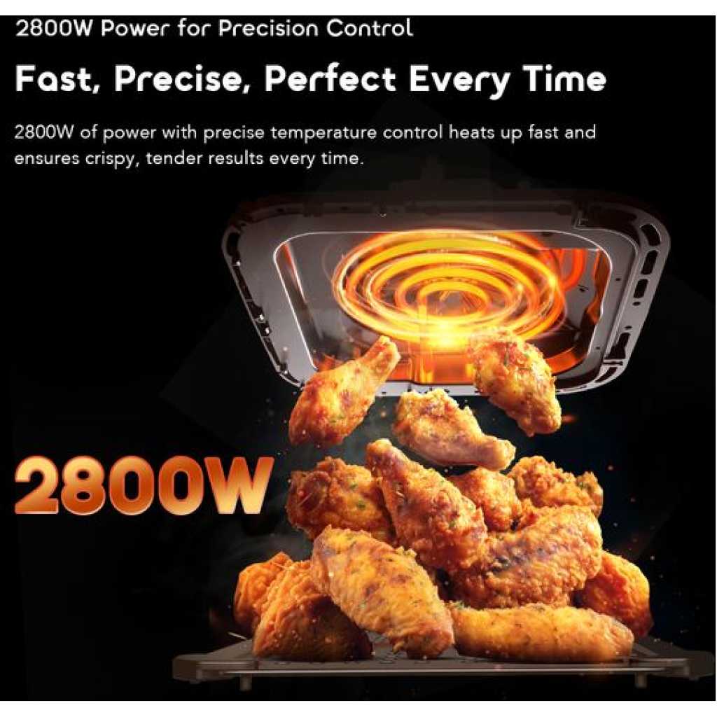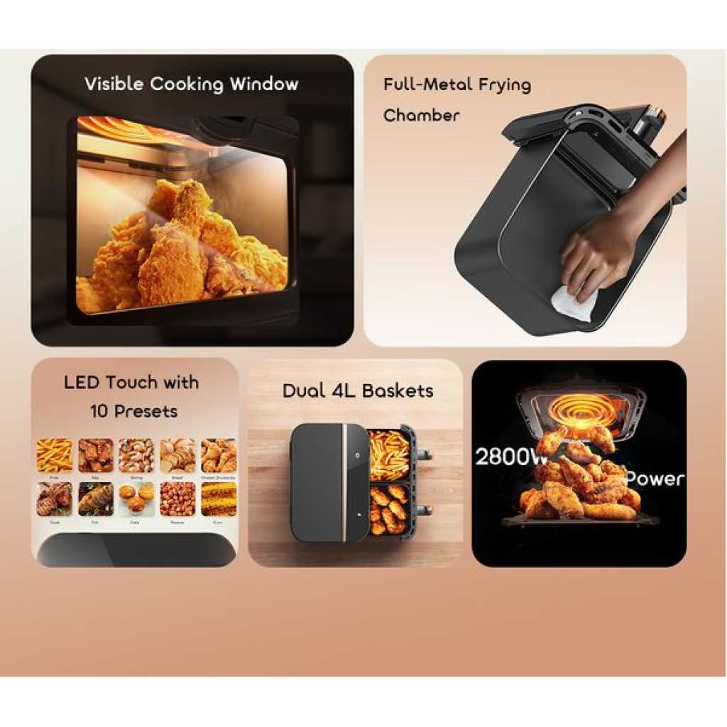 Key Features: Dual 4L Baskets: Cook two meals at once with independent temperature and time control. 2800W High Power: Rapid heating for crispy exteriors and tender interiors. Visible Cooking Windows: Monitor food without opening the baskets. LED Touch Panel with 10 Presets: Easy control with smart cooking programs. Full-Metal Frying Chamber: Durable construction with non-stick coating for easy cleaning. Safety Protection: Designed for reliable and secure cooking.
