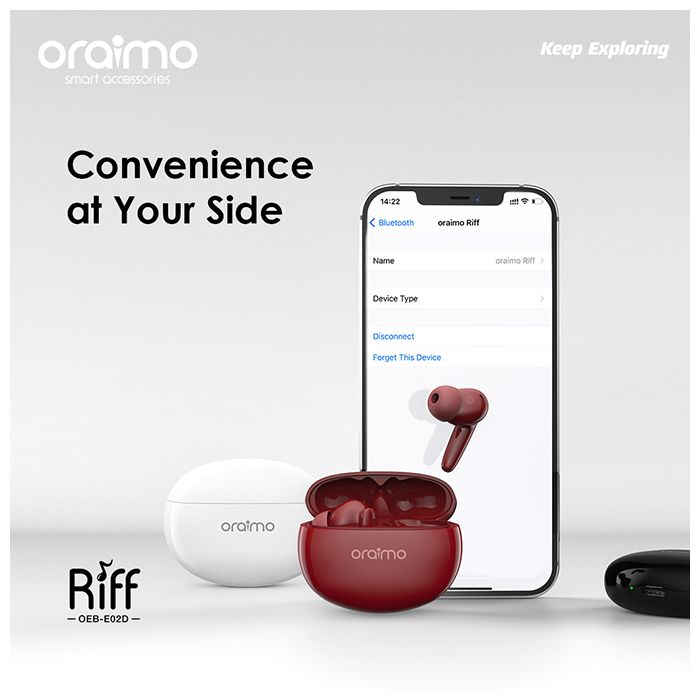Key Features: Oraimo Riff Smaller For Comfort TWS True Wireless Earbuds OEB-E02D – Red. Compact Design-Smaller For Comfort Dynamic Sound-Never Lose a Beat ENC 1-mic Technology-Hear the Other One Clearly Open and Connect-Convenience at Your Side IPX4 Splash & Sweat Protection-All-weather Protection