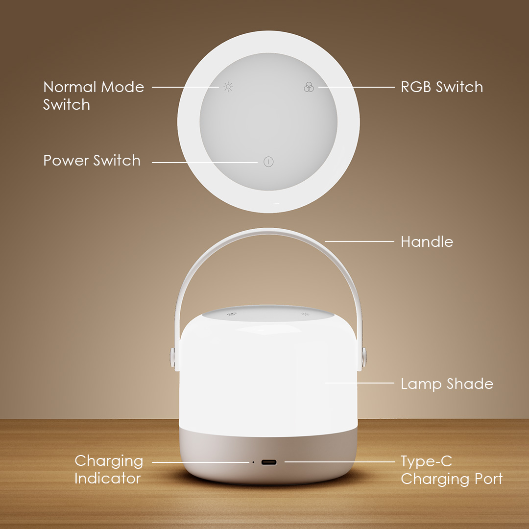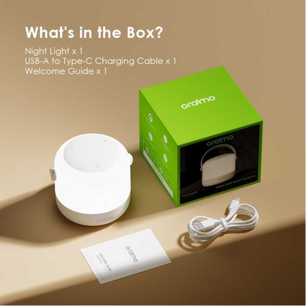Product Material: ABS+PC Rated Power : 4.5W Input: 5V/1A Iuminous Flux: ≥80LM Color Rendering Index (CRI): ≥80RA Battery Capacity: 2000mAh Charge Time: 3.5~4.5h Working Time: 4~5h(at the brightest status); ≥120h(at the darkest status) Net Weight: 246g Model: ONL-501A Product Features: 8 RGB Colors + 1 Dynamic Modes Immerse Yourself in a Vibrant Night with Multiple Color Modes Infinite Brightness Control Light Control at Your Fingertips 3 Color Temperature Settings Effortlessly Meets All Your Lighting Needs Up to 120+ Hours of Working Time Your All-Night Companion Memory Function & Auto-Off Timer Customizable Settings for Your Perfect Night Portable Design Perfect for Indoor and Outdoor Use What’s In the Box? Night Light x 1 USB-A to Type-C Charging Cable x 1 Welcome Guide x 1 Product Material: ABS+PC Rated Power : 4.5W Input: 5V/1A Iuminous Flux: ≥80LM Color Rendering Index (CRI): ≥80RA Battery Capacity: 2000mAh Charge Time: 3.5~4.5h Working Time: 4~5h(at the brightest status); ≥120h(at the darkest status) Net Weight: 246g Model: ONL-501A Product Features: 8 RGB Colors + 1 Dynamic Modes Immerse Yourself in a Vibrant Night with Multiple Color Modes Infinite Brightness Control Light Control at Your Fingertips 3 Color Temperature Settings Effortlessly Meets All Your Lighting Needs Up to 120+ Hours of Working Time Your All-Night Companion Memory Function & Auto-Off Timer Customizable Settings for Your Perfect Night Portable Design Perfect for Indoor and Outdoor Use What’s In the Box? Night Light x 1 USB-A to Type-C Charging Cable x 1 Welcome Guide x 1