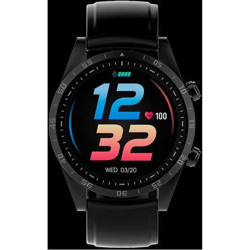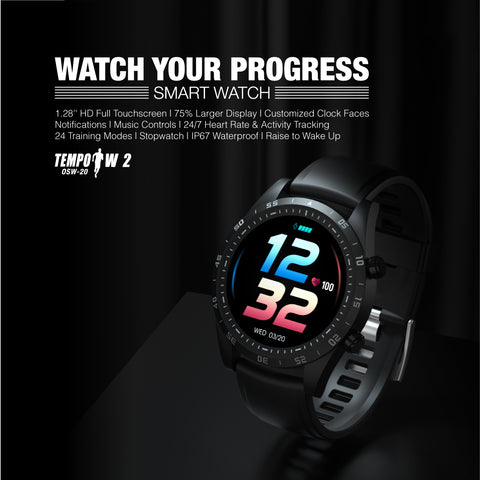 Oraimo Tempo-W2 IP67 Waterproof Smart Watch with 24 Training Modes & Up to 20 Hours Battery Life – Black. Product Features: Screen Size: 1.28″ G+F TFT Resolution 240*240 BT Version: V4.2 Battery Capacity: 180mAh Battery Type: Lithium polymer battery Standby Time: Up to 20 days Watch Size: 42*42*13mm Strap Size: 215mm Material: Zinc Alloy/PC/TPU Waterproof: IP67 Tempo-W2 Function: Full Touchscreen Pedometer Calorie Heart Rate Monitor Activity & Sleep Tracking Notifications Stopwatch Music Controls IP67 Waterproof 24 Training Modes Large & Full Touchscreen The big 1.28” screen allows you full access to control the watch smoothly with your fingertip. Real-Time Notifications Stay connected to what matters most with texts, calls, app alerts by simply raising your wrist. Activity & Sleep Tracking Monitors your heart rate, step, distance, calories, active minutes & time, and sleep quality to help understand your overall physical health. Boost Your Workouts Record accurate workout data in 24 different training modes and a stopwatch to measure the time. Premium Design HD color touchscreen, zinc alloy case, and a skin-friendly strap make the watch even more remarkable. IP67 Waterproof With IP67 waterproof, now you can wash hands, run in the rain and recover in the cold shower with this device on your wrist. Advanced Power-Saving Technology oraimo advanced Power-Saving technology enables you to see more using less power and enjoy an up to 3 weeks battery life.