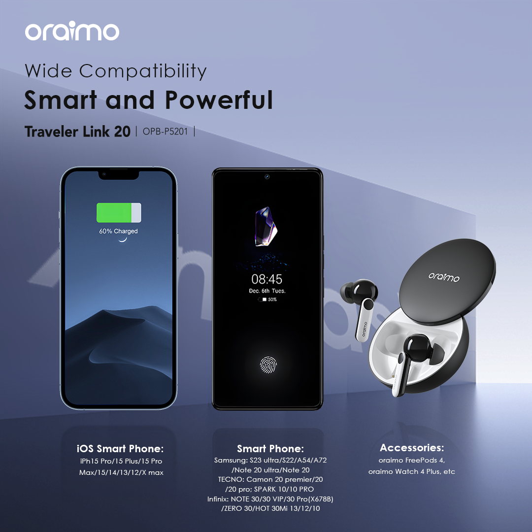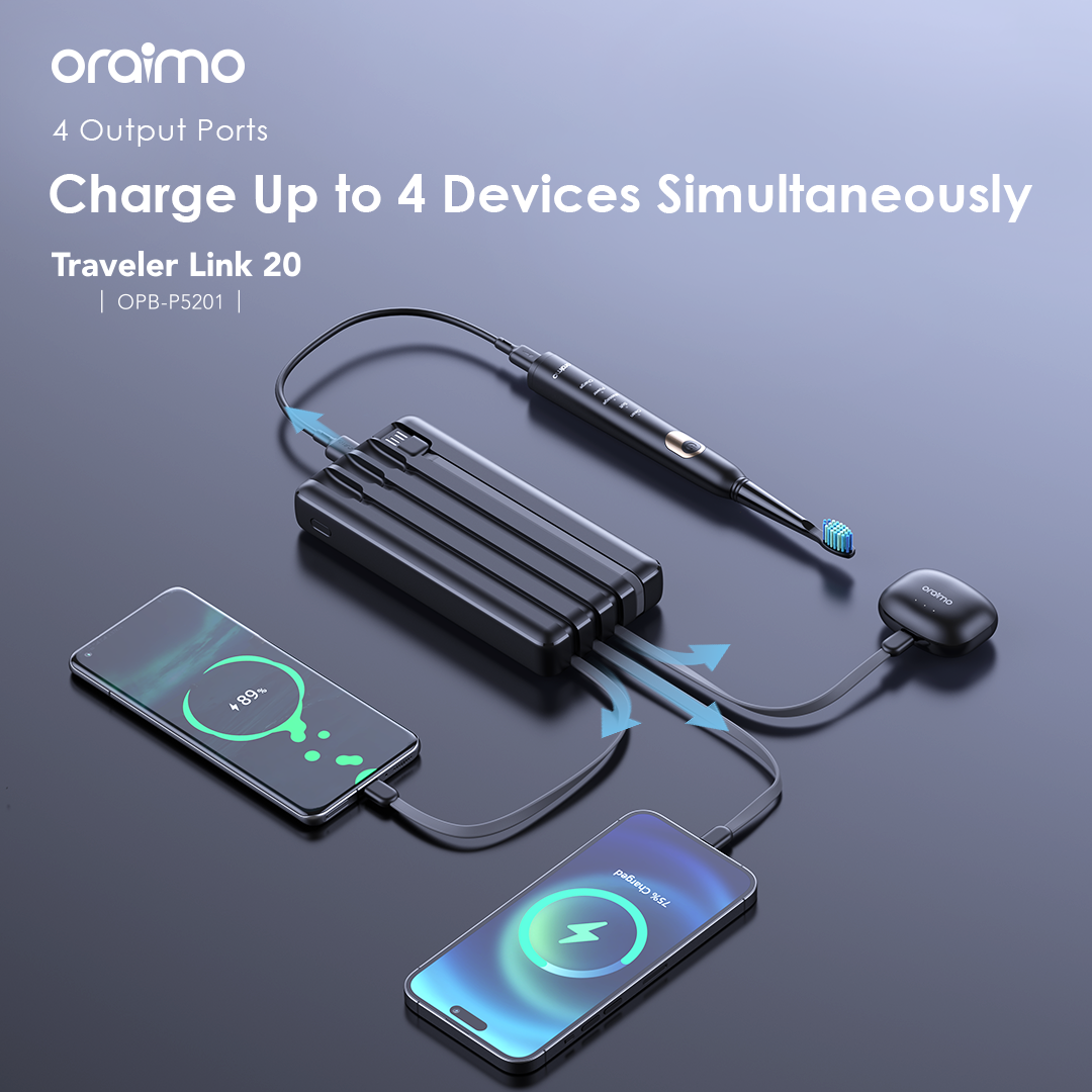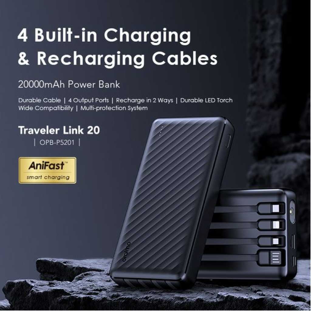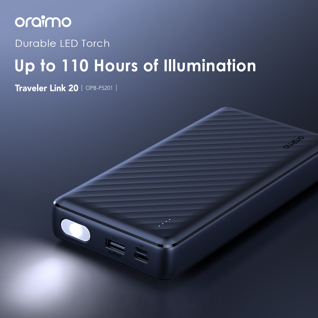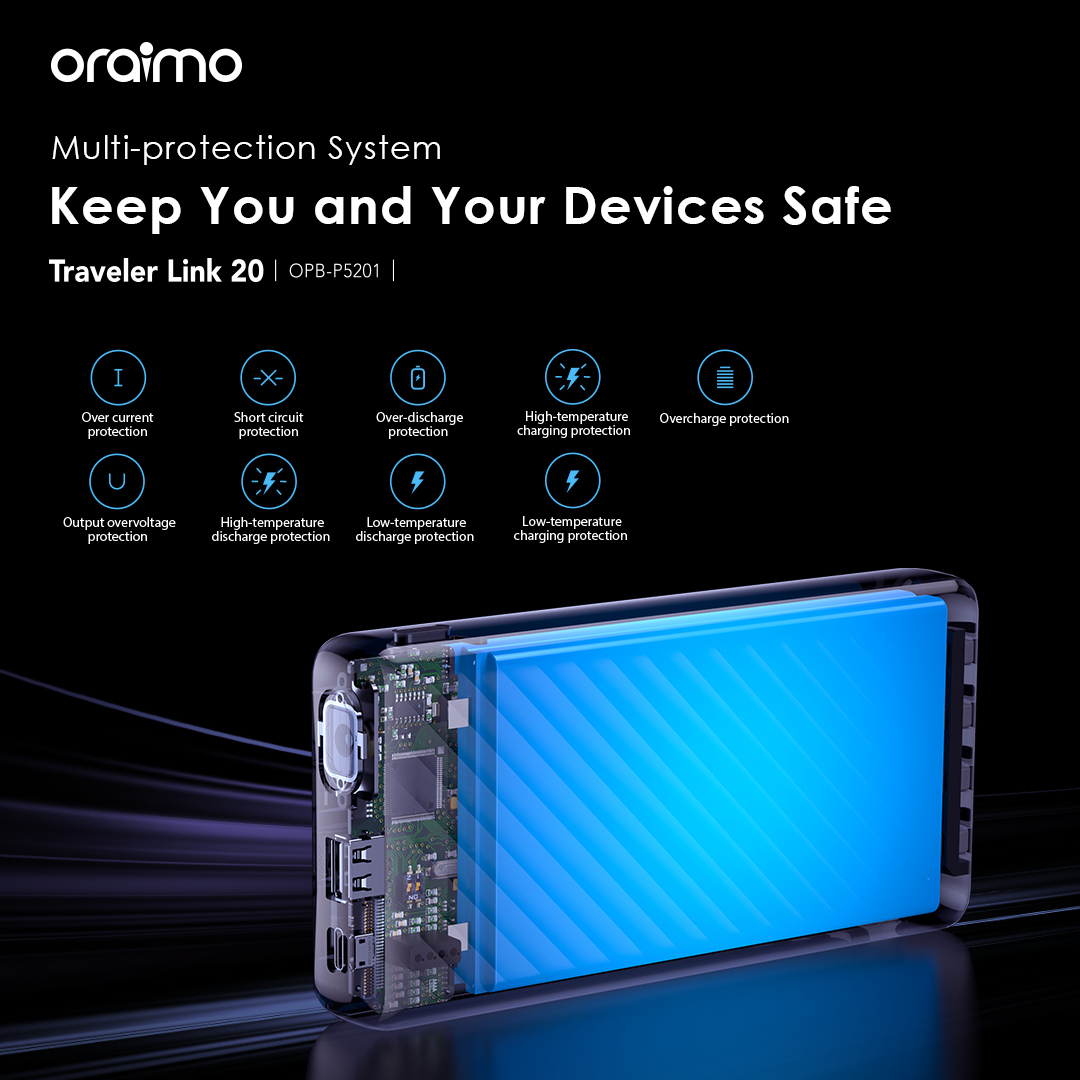 Capacity: 20000mAh (74 Wh) Input 1(Micro-USB Port): 5V/2A Input 2(Type-C Port): 5V/2A Input 3(USB-A Cable): 5V/2A Output 1(USB-A Port): 5V/2.4A Output 2(Micro-USB Cable): 5V/2.1A Output 3(Lightning Cable): 5V/2.1A Output 4(Type-C Cable): 5V/2.1A Total Output: 5V/2.4A (Max) Model: OPB-P5201 Product Features: 4 Built-in Charging & Recharging Cables Seamless Power Connectivity Traveler Link 20 comes with built-in Type-C, Micro-USB, and Lightning charging cables to meet your daily charging needs. What’s more, a USB-A cable is included for easy recharging. Durable Cable Built to Last The thickened wire protection and anti-winding process make the built-in charging cable more durable and rugged. Moreover, a higher charging conversion rate can be achieved thanks to pure copper conductor utilization. 4 Output Ports Charge Up to 4 Devices Simultaneously Traveler Link 20 is equipped with 3 built-in charging cables and 1 USB-A port, Traveler Link 20 can simultaneously deliver power to 4 devices at a speed of up to 12W. 3 Input Ports Recharge Your Power Bank Flexibly Traveler Link 20 can be recharged using a Type-C port, Micro-USB port, or a USB-A cable, providing multiple recharging options for convenience. 20000mAh Big Capacity Fully Charge Your Phone Up to 5 Times Featuring a high battery capacity, Traveler Link 20 can fully juice up an iPh XS almost 5 times. Endurance LED Torch Up to x Hours of Illumination Enjoy up to x hours of illumination to handle any unexpected emergency with ease. *Long press the main button for 3 seconds to open the LED torch. Wide Compatibility Smart and Powerful Equipped with oraimo’s exclusive chip, AniFast™ power bank can intelligently identify the fast-charging protocol of your device to deliver the speediest possible charge. Compatible Model: iOS Smart Phone: iPh15 Pro/15 Plus/15 Pro Max/15/14/13/12/X max Android Smart Phone: Samsung: S23 ultra/S22/A54/A72/Note 20ultra/Note 20 Tecno: Camon 20 premier/20/20 pro; SPARK 10/10 PRO Infinix: NOTE 30/30 VIP/30 Pro(X678B)/ZERO 30/HOT 30 Mi 13/12/10 Accessories: oraimo FreePods 4, oraimo Watch 2 Pro, etc Multi-protection System Keep You and Your Devices Safe Equipped a comprehensive safety feature, ensuring your devices will be shielded from harm, being charged swiftly and securely.