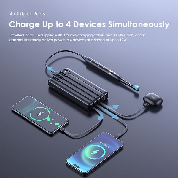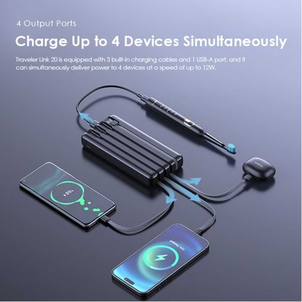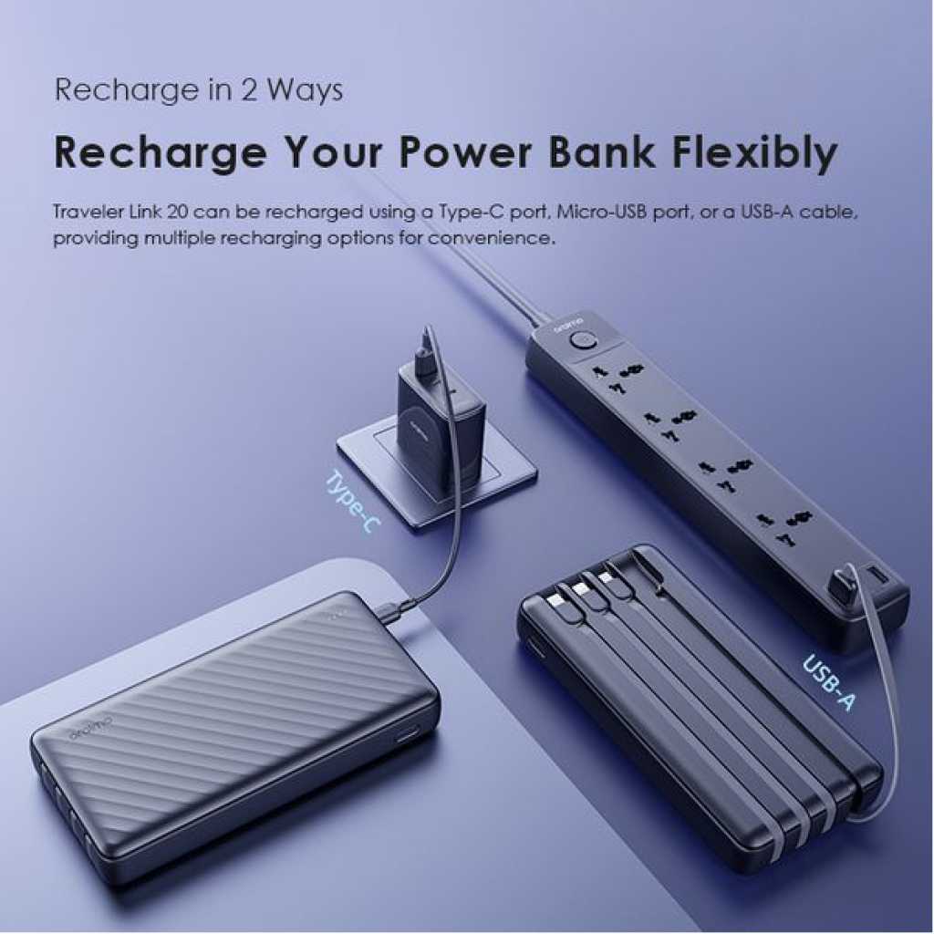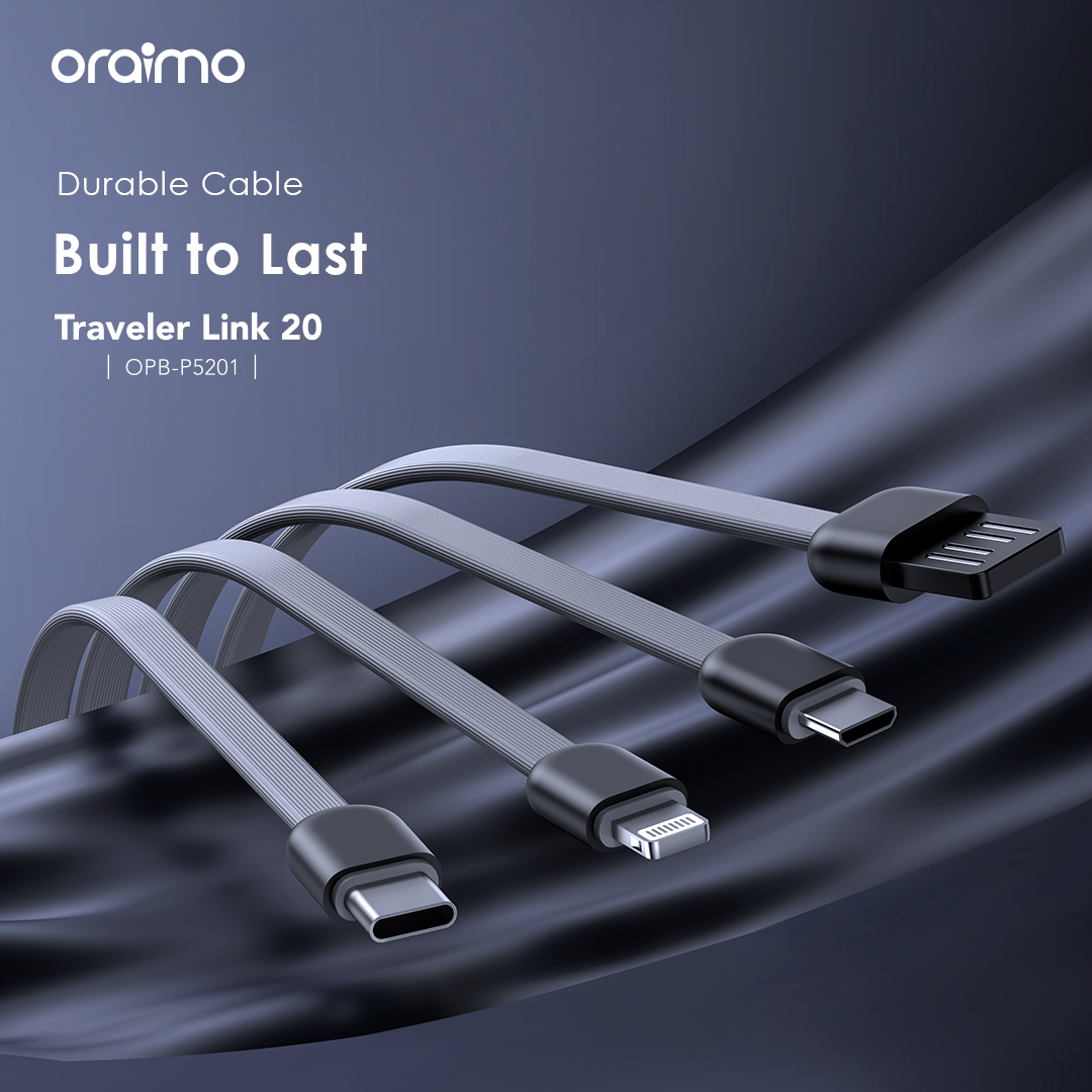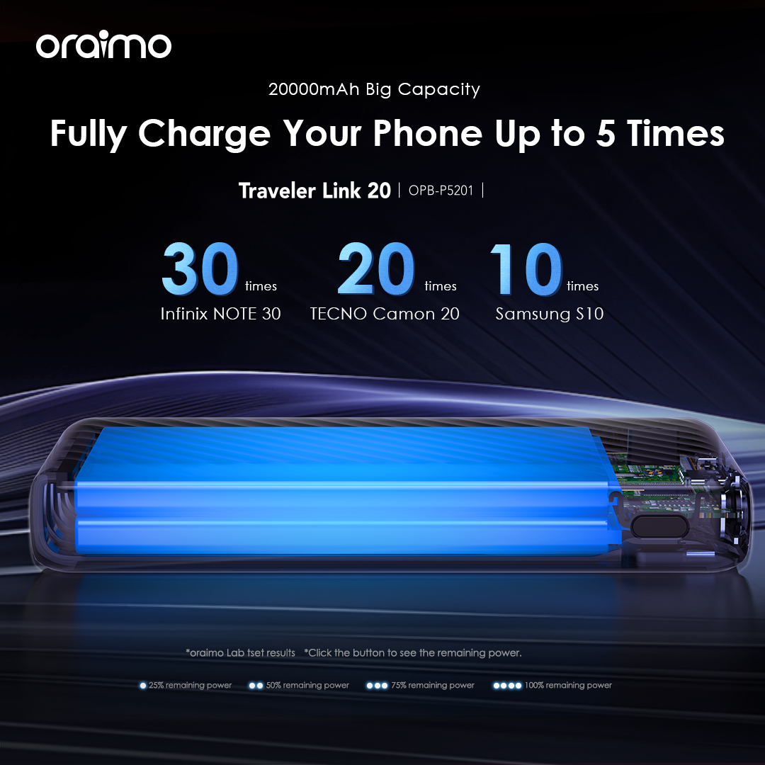 Capacity: 20000mAh (74 Wh) Input 1(Micro-USB Port): 5V/2A Input 2(Type-C Port): 5V/2A Input 3(USB-A Cable): 5V/2A Output 1(USB-A Port): 5V/2.4A Output 2(Micro-USB Cable): 5V/2.1A Output 3(Lightning Cable): 5V/2.1A Output 4(Type-C Cable): 5V/2.1A Total Output: 5V/2.4A (Max) Model: OPB-P5201 Product Features: 4 Built-in Charging & Recharging Cables Seamless Power Connectivity Traveler Link 20 comes with built-in Type-C, Micro-USB, and Lightning charging cables to meet your daily charging needs. What’s more, a USB-A cable is included for easy recharging. Durable Cable Built to Last The thickened wire protection and anti-winding process make the built-in charging cable more durable and rugged. Moreover, a higher charging conversion rate can be achieved thanks to pure copper conductor utilization. 4 Output Ports Charge Up to 4 Devices Simultaneously Traveler Link 20 is equipped with 3 built-in charging cables and 1 USB-A port, Traveler Link 20 can simultaneously deliver power to 4 devices at a speed of up to 12W. 3 Input Ports Recharge Your Power Bank Flexibly Traveler Link 20 can be recharged using a Type-C port, Micro-USB port, or a USB-A cable, providing multiple recharging options for convenience. 20000mAh Big Capacity Fully Charge Your Phone Up to 5 Times Featuring a high battery capacity, Traveler Link 20 can fully juice up an iPh XS almost 5 times. Endurance LED Torch Up to x Hours of Illumination Enjoy up to x hours of illumination to handle any unexpected emergency with ease. *Long press the main button for 3 seconds to open the LED torch. Wide Compatibility Smart and Powerful Equipped with oraimo’s exclusive chip, AniFast™ power bank can intelligently identify the fast-charging protocol of your device to deliver the speediest possible charge. Compatible Model: iOS Smart Phone: iPh15 Pro/15 Plus/15 Pro Max/15/14/13/12/X max Android Smart Phone: Samsung: S23 ultra/S22/A54/A72/Note 20ultra/Note 20 Tecno: Camon 20 premier/20/20 pro; SPARK 10/10 PRO Infinix: NOTE 30/30 VIP/30 Pro(X678B)/ZERO 30/HOT 30 Mi 13/12/10 Accessories: oraimo FreePods 4, oraimo Watch 2 Pro, etc Multi-protection System Keep You and Your Devices Safe Equipped a comprehensive safety feature, ensuring your devices will be shielded from harm, being charged swiftly and securely.