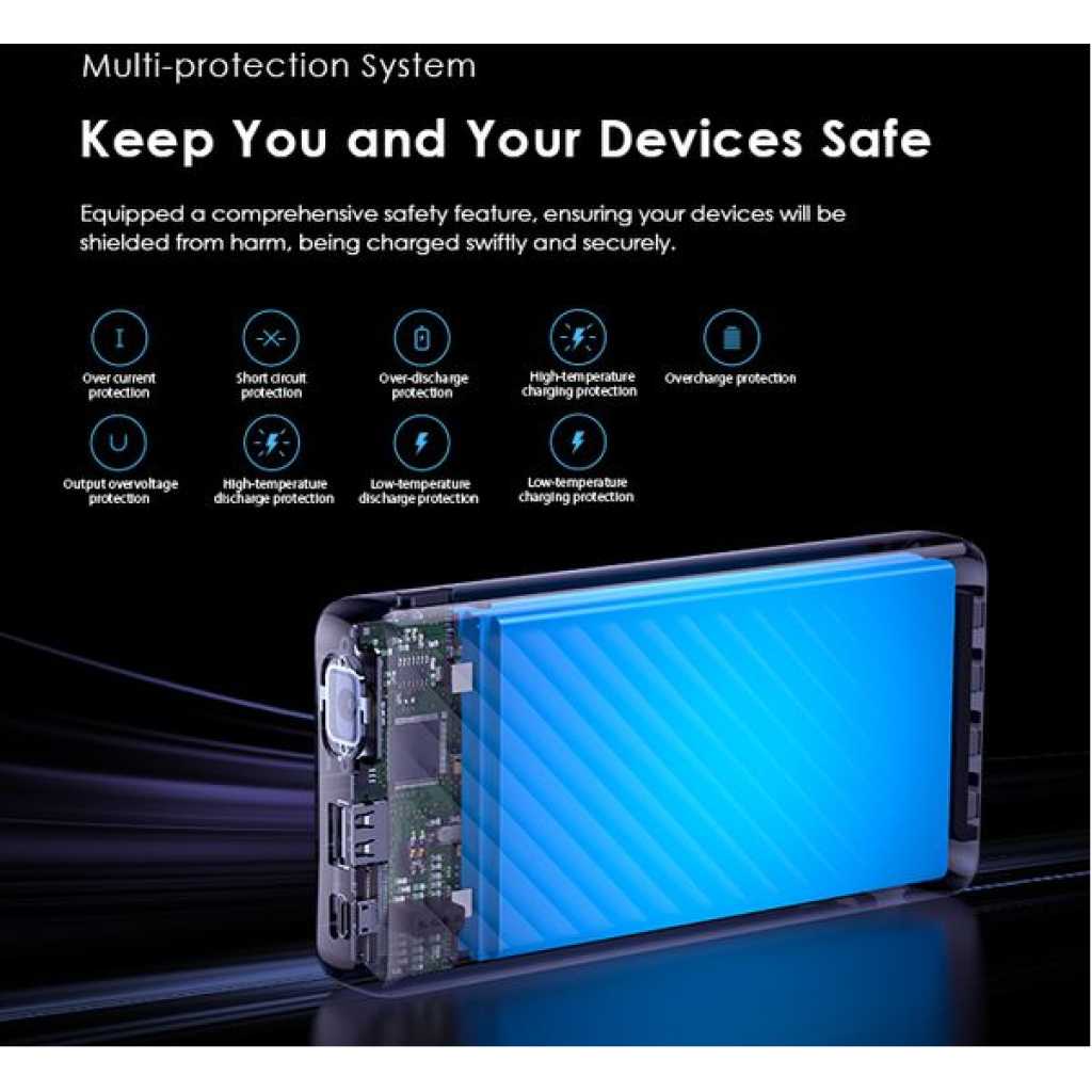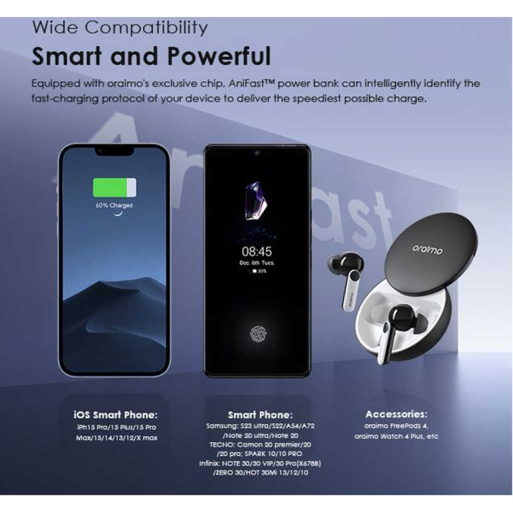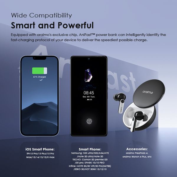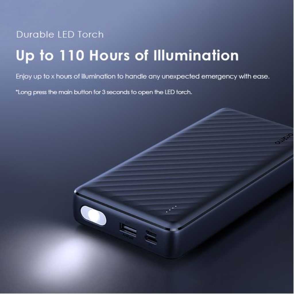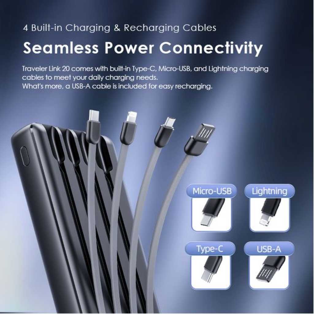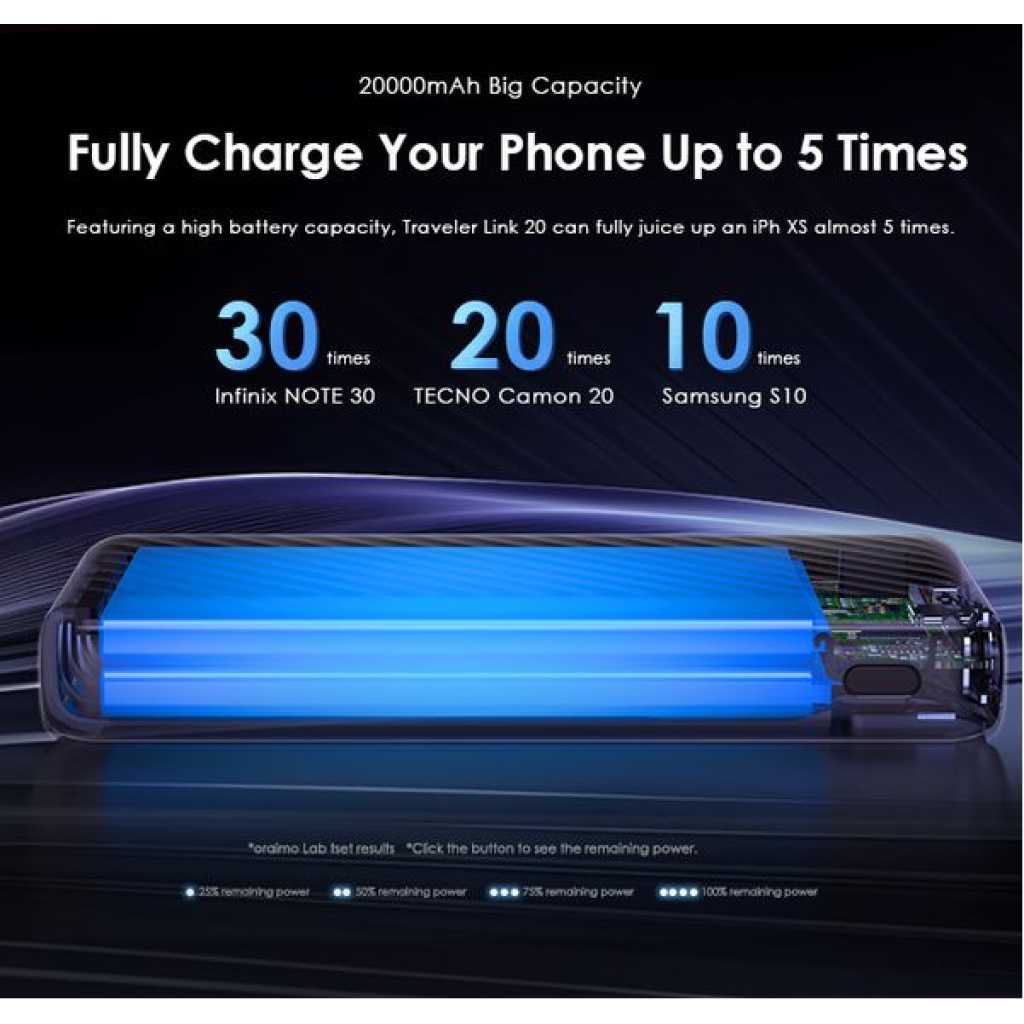 Capacity: 20000mAh (74 Wh) Input 1(Micro-USB Port): 5V/2A Input 2(Type-C Port): 5V/2A Input 3(USB-A Cable): 5V/2A Output 1(USB-A Port): 5V/2.4A Output 2(Micro-USB Cable): 5V/2.1A Output 3(Lightning Cable): 5V/2.1A Output 4(Type-C Cable): 5V/2.1A Total Output: 5V/2.4A (Max) Model: OPB-P5201 Product Features: 4 Built-in Charging & Recharging Cables Seamless Power Connectivity Traveler Link 20 comes with built-in Type-C, Micro-USB, and Lightning charging cables to meet your daily charging needs. What’s more, a USB-A cable is included for easy recharging. Durable Cable Built to Last The thickened wire protection and anti-winding process make the built-in charging cable more durable and rugged. Moreover, a higher charging conversion rate can be achieved thanks to pure copper conductor utilization. 4 Output Ports Charge Up to 4 Devices Simultaneously Traveler Link 20 is equipped with 3 built-in charging cables and 1 USB-A port, Traveler Link 20 can simultaneously deliver power to 4 devices at a speed of up to 12W. 3 Input Ports Recharge Your Power Bank Flexibly Traveler Link 20 can be recharged using a Type-C port, Micro-USB port, or a USB-A cable, providing multiple recharging options for convenience. 20000mAh Big Capacity Fully Charge Your Phone Up to 5 Times Featuring a high battery capacity, Traveler Link 20 can fully juice up an iPh XS almost 5 times. Endurance LED Torch Up to x Hours of Illumination Enjoy up to x hours of illumination to handle any unexpected emergency with ease. *Long press the main button for 3 seconds to open the LED torch. Wide Compatibility Smart and Powerful Equipped with oraimo’s exclusive chip, AniFast™ power bank can intelligently identify the fast-charging protocol of your device to deliver the speediest possible charge. Compatible Model: iOS Smart Phone: iPh15 Pro/15 Plus/15 Pro Max/15/14/13/12/X max Android Smart Phone: Samsung: S23 ultra/S22/A54/A72/Note 20ultra/Note 20 Tecno: Camon 20 premier/20/20 pro; SPARK 10/10 PRO Infinix: NOTE 30/30 VIP/30 Pro(X678B)/ZERO 30/HOT 30 Mi 13/12/10 Accessories: oraimo FreePods 4, oraimo Watch 2 Pro, etc Multi-protection System Keep You and Your Devices Safe Equipped a comprehensive safety feature, ensuring your devices will be shielded from harm, being charged swiftly and securely.