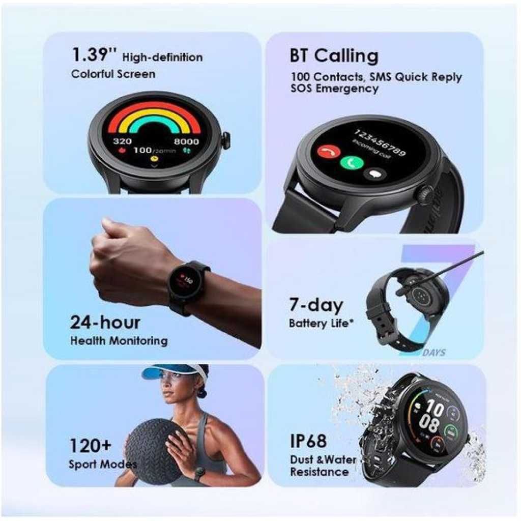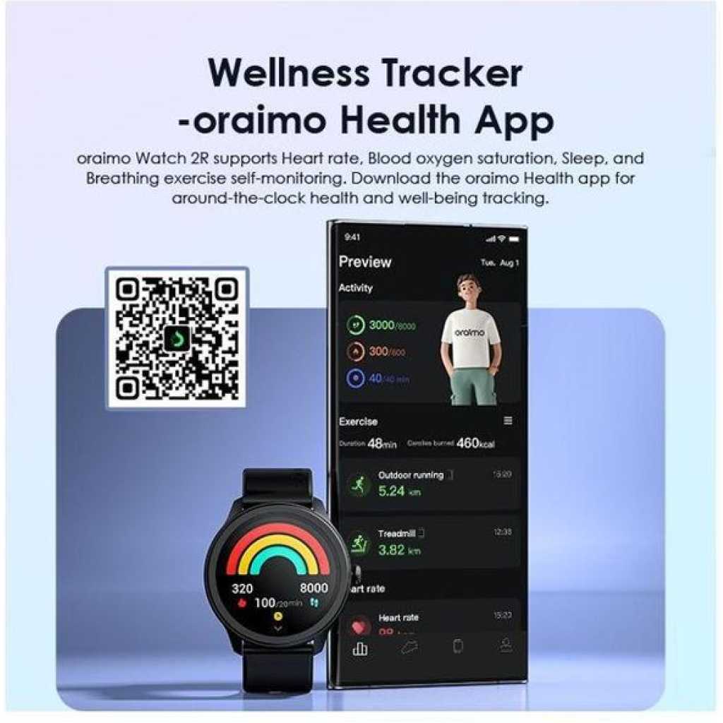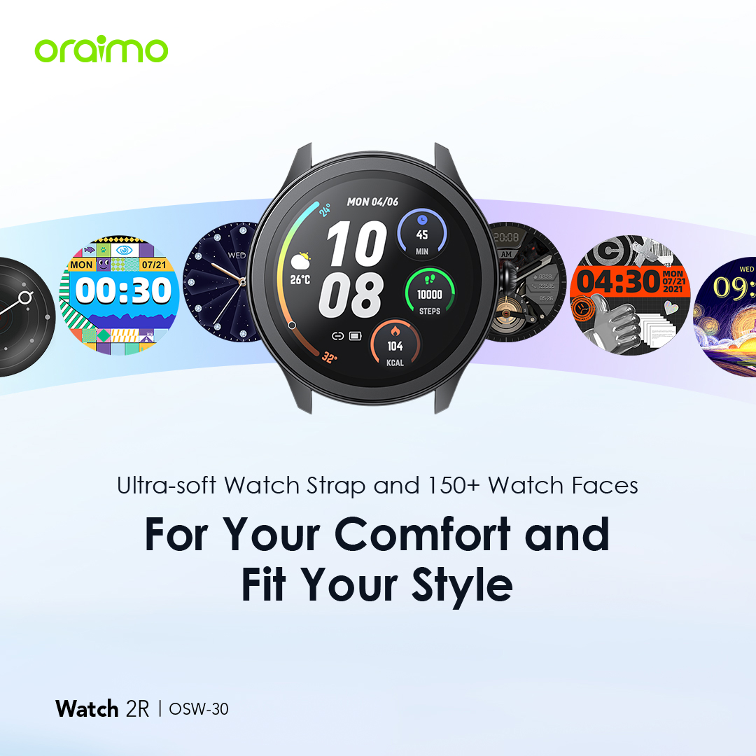 Product Parameters: Screen Size: 1.39″ TFT 360*360 BT Version: V5.2 Battery Capacity: 260 mAh Battery Type: Lithium polymer Charging Time:2h Standby Time: 7 days Waterproof: IP68 Watch Size: 46*46*11mm(without strap) Weight: 39.8 g(with strap) Material: ABS/PC/Silica Gel Model: OSW-30 *oraimo Lab test result Product Features: 1.39” High-definition Colorful Screen Clarity Like Never Before 1.39 TFT screen redefines clarity and delivers a brighter, more vivid viewing and smooth operating experience. * 1.39” (360*360 px) ; 500 nits brightness 120+ Sport Modes Customize Your Exercise Goals oraimo Watch 2R supports 120+ sports modes, meeting your diverse exercise needs. By monitoring your exercise status, you can adjust your goals more effectively. You can control music and media playing on your phone with your watch during training sessions as well. BT Calling Stay Connected on the Go Take, make, and reject calls directly from your wrist with ease anytime anywhere. The HD audio quality ensures that every conversation is clear and natural, making it feel like you’re talking face-to-face. The chip BT ensures fast, stable connectios and low power consumption. SMS Quick Reply and More Smart Communication at Simple Taps At one tap, a quick reply with a customized message will be sent when you hang up an incoming call. oraimo Watch 2R also enables quick callback and allows to add up to 100 common contacts. SOS Emergency Send Quick Alerts at Triple Clicks In case of emergency, you can quickly call an emergency contact by triple-clicking the side button. Reminders for Daily Health & Wellness Develop Healthy Habits Set up a health goal to help yourself form a good habit. For example, by setting a sedentary reminder, the watch will vibrate regularly to remind you to exercise after sitting for long periods. Useful Gadgets Your Sweet Personal Assistant Tap the dial to enjoy convenient functions such as remote control photography, setting alarm prompts, stopwatch timing, checking the weather, finding a phone, calculator, and more. 24-hour Health Monitoring Wellness Tracker—oraimo Health App oraimo Watch supports Heart rate, Blood oxygen saturation, Sleep, and Breathing exercise self-monitoring. Download the oraimo Health app for around-the-clock health and well-being tracking. IP68 Dust & Water Resistance Explore the Outdoors Without Limits An IP68 rating allows this watch to withstand rain and dust. Well-performing in various scenarios such as on the beach, desert, and in water sports, the watch is the ultimate accessory for a fitness enthusiast or an adventurous alike. * IP=Ingress Protection 6=Dust Tight 8=Survives being submerged in water 7-day Battery Life Long Lasting Watch for Everyday Use oraimo Watch 2R with long battery life ensures that you can relax and enjoy your adventure as your heart desires. The battery can hold up to 7 days on a full charge and 24 hours on a 10-minute charge. Ultra-soft Watch Strap and 150+ Watch Faces For Your Comfort and Fit Your Style The watch is equipped with a 22mm ultra-soft and detachable silicone strap. Besides, the oraimo Health app offers more than 150 types of watch faces, which can also be customized to display a unique photo from your album.