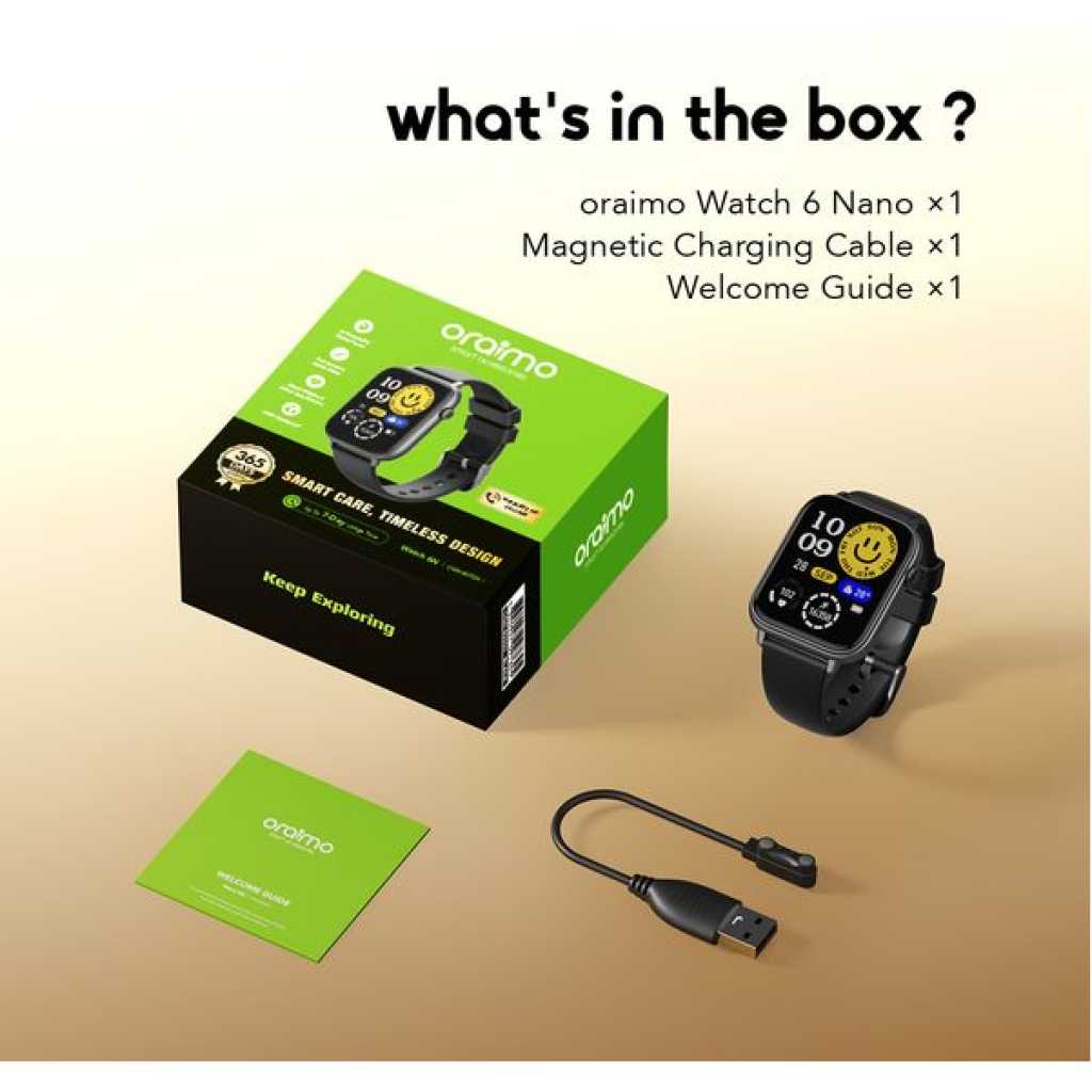 Material:ABS /PC,44.6*37.1*10.6mm Display:1.83” TFT 240*284 Battery Capacity:300mAh Charging : DC 5V 100mA,3H Major Function : Meter Step/ Bluetooth Call/ Heartrate Monitor/ Blood Oxygen Waterproof: IP68 APP: oraimo Health Product Features: 1.83″ TFT Full Touch Color Screen Vivid Display, Immersive Experience Enjoy a stunning 1.83” TFT full-touch color screen that delivers exceptional clarity and vibrant visuals, bringing every detail to life. Stylish Design Chic Look, Trendy Wear Crafted with an elegant design and smooth finish, Watch 6N seamlessly blends fashion with functionality, making it the perfect accessory for any occasion. AI-Generated Watch Faces Smart Style, Endless Choices Explore AI-driven watch faces and over 120 stunning designs on the oraimo health app, giving you endless possibilities to match your mood and style. Anti-Scratch Panda Glass Durable Clarity, Everyday Protection The anti-scratch Panda Glass ensures long-lasting durability, keeping your screen pristine and clear even during daily use. Heart Rate & Blood Oxygen Monitor Your Wellness, Always Monitored Stay informed about your health with advanced sensors that track your heart rate, blood oxygen, stress, and sleep — empowering you to live a healthier life with ease. IP68 Waterproof Built to Perform, Ready for Life Whether it’s rain, sweat, or splashes, Watch 6N’s IP68 waterproof design keeps up with your active lifestyle, ensuring reliable performance in any condition. Up to 7-Day Usage Time & 28-Day Standby Power That Lasts, Anytime You Need Enjoy up to 7 days of active usage on a single charge and an impressive 28-day standby time. Whether you’re working, working out, or taking it easy, Watch 6N stays ready to keep up with your lifestyle. 100+ Sport Modes Track More, Achieve More With over 100 sport modes, Watch 6N helps you monitor your workouts across a wide range of activities, empowering you to stay fit and active. Whta’s In the Box? oraimo Watch 6 N x1 Magnetic Charging Cable x1 Welcome Guide x1