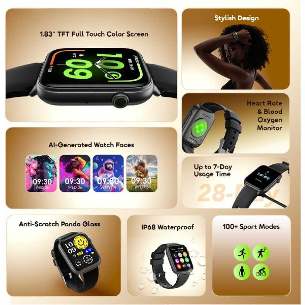 Key Features: 1.83″ Full-Touch Display: Bright, colorful visuals with smooth responsiveness. Elegant Modern Design: Sleek build that complements both casual and formal looks. AI Watch Faces: Choose from 120+ customizable designs via app. Health Monitoring: Tracks heart rate, blood oxygen, stress, and sleep. IP68 Waterproof: Reliable protection against splashes, sweat, and rain. Up to 7-Day Battery Life: Plus up to 28-day standby time. 100+ Sport Modes: Supports diverse workouts and activities. Scratch-Resistant Glass: Durable Panda Glass for everyday protection.