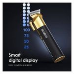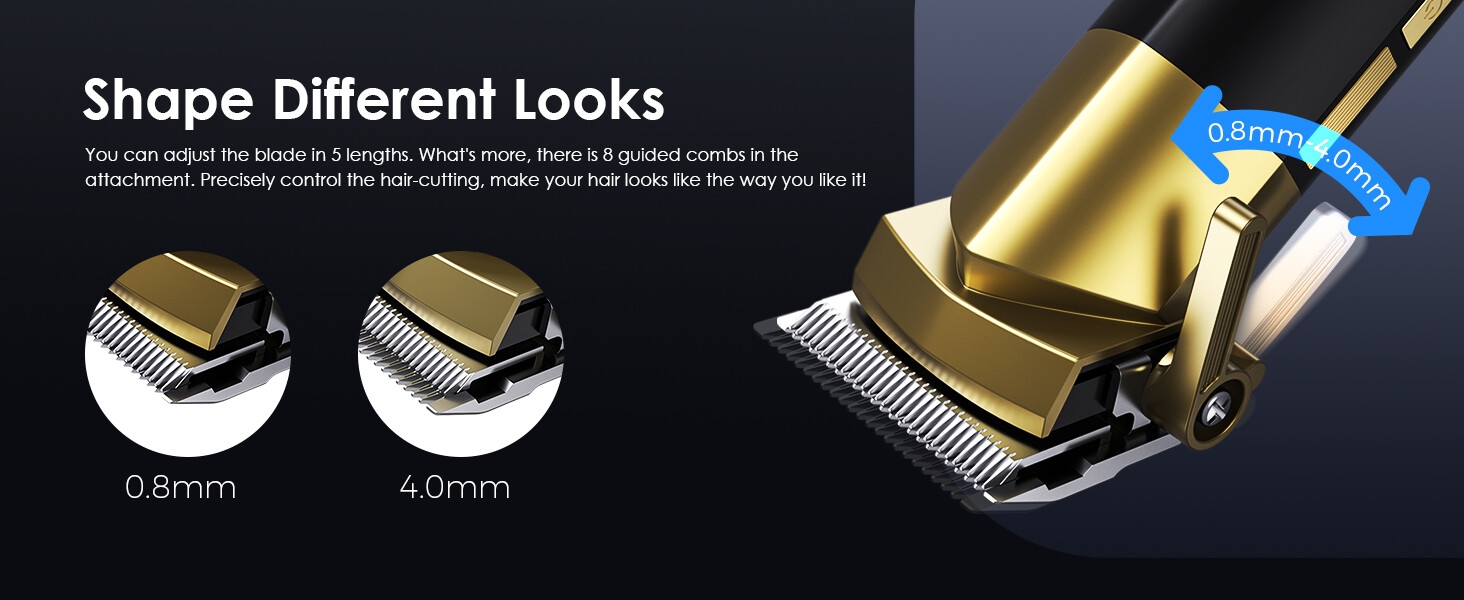 Product Description The smart trimmer’s self-sharpening blades deliver precise cuts, and the trimmer’s cordless use, smart digital display and 240-minute run time deliver stylish, professional and precise cuts. The blades are made of stainless steel, and it will be automatically sharpened during using, which helps the blades staying sharp for a long time. Besides, the blades can cut hair in an instant due to its sharpness. The blades are also sensitive to skin and designed to avoid injury. You can adjust the blade in 5 lengths. What’s more, there is 8 guided combs in the attachment. Precisely use it easily with different size of guide combs to make various of hair styles. The clipper comes with the LED indicator screen to indicate the remaining battery, charging situation and running situation. This smart clipper provides long battery life, Our smart clipper comes with a Type-C Charging Cable. You can use the cordless trimmer shaving time for 240 minutes after 1.5 Hour of charge time. Previous page Next page