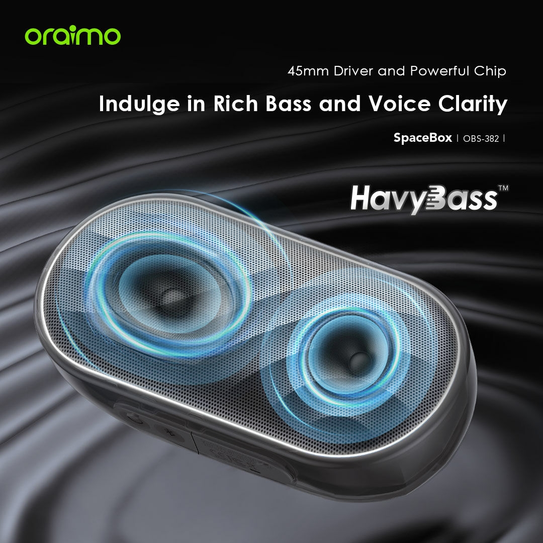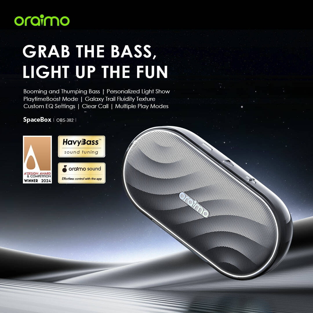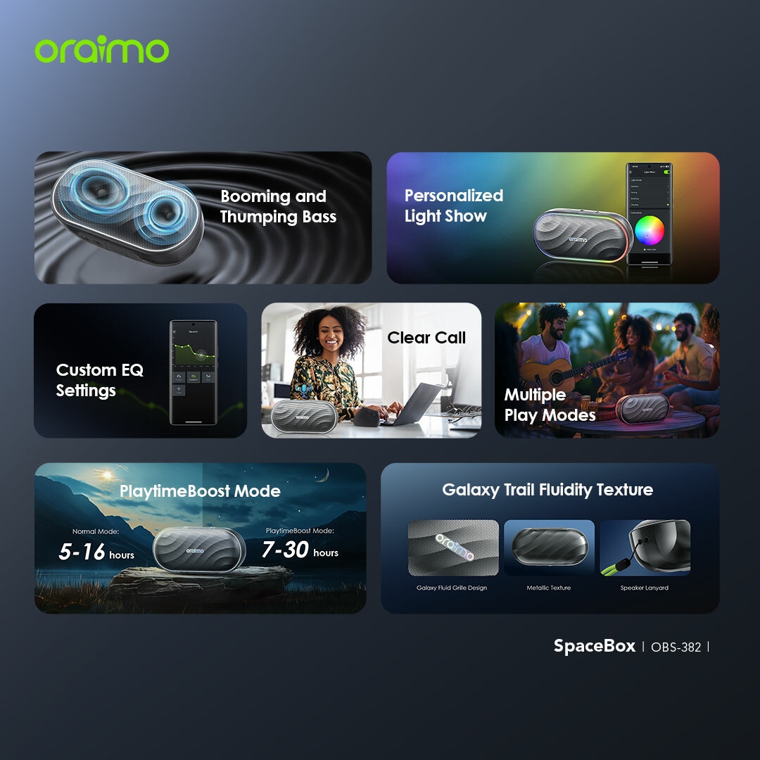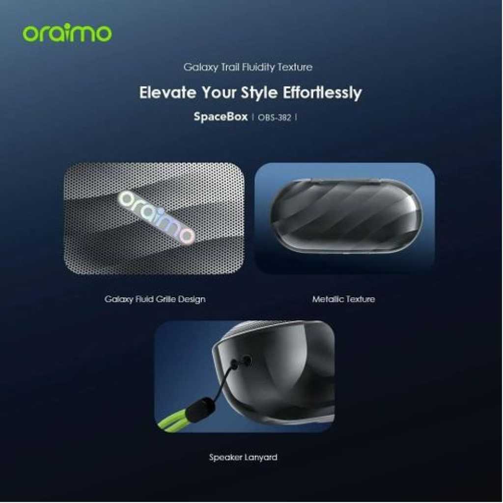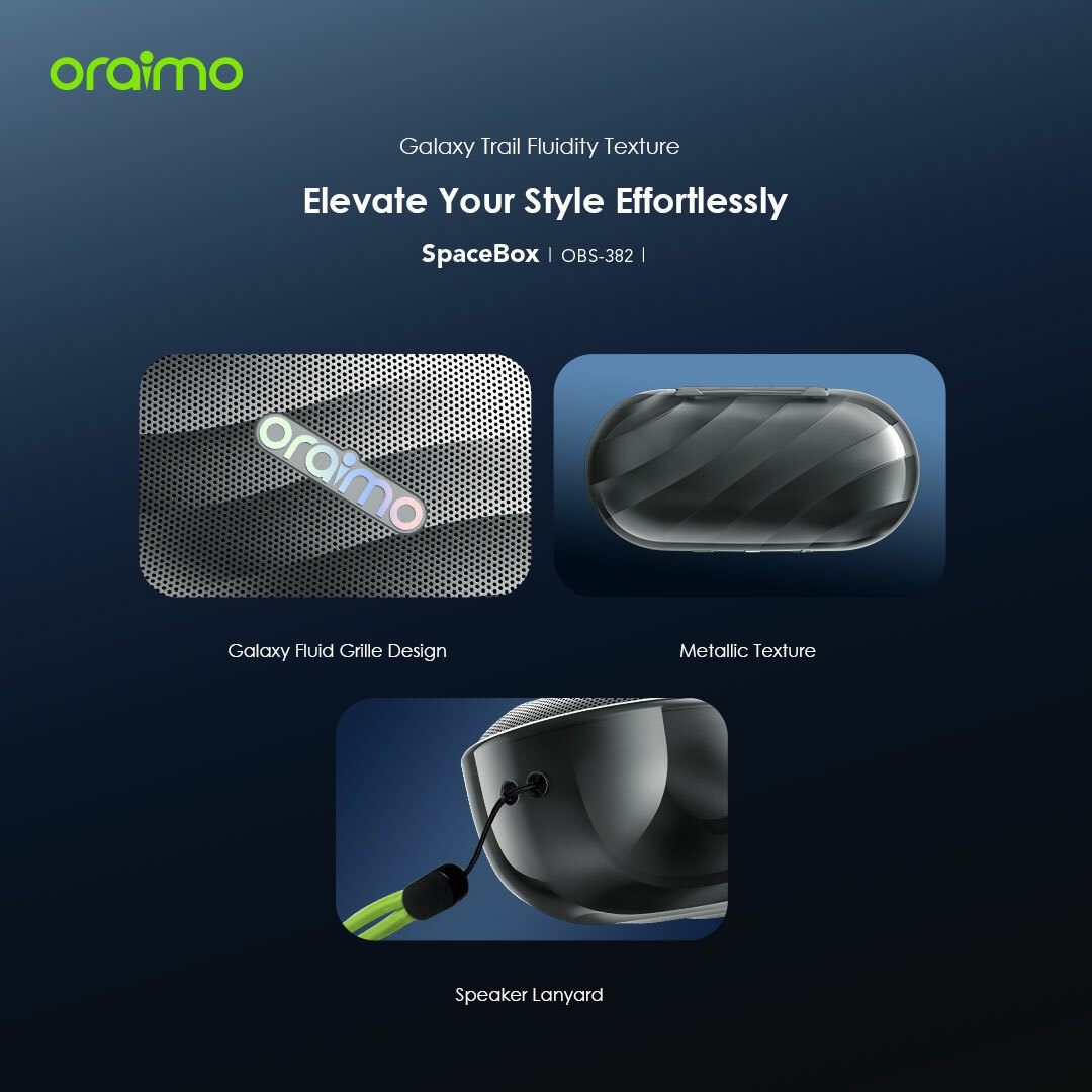 Product Parameters: Size: 146*72*50mm Weight: 280g Bluetooth version:V5.4 Battery Capacity:1800mAh/3.7V Frequency Response: 80Hz-20KHz Playtime: 5H(Max vol),16H(Med vol) Audio Output: 8W Transmission distance: 10m Material: Plastic&Metal Color:Space Grey Charging Input: Type-C Play Mode: BT, TF card, FM radio Model: OBS-382 Product Features: Booming and Thumping Bass Indulge in Rich Bass and Voice Clarity The oraimo SpaceBox delivers powerful oraimo Pro Sound with impactful bass in a compact design, featuring professional acoustic engineering and exclusive HavyBass™ technology. Personalized Light Show Customizable Lighting To Match Your Mood The built-in light ring naturally synchronizes to the music’s rhythm with innovative beat recognition algorithm, creating the perfect ambiance. Download the oraimo sound App to customize light themes and colors. PlaytimeBoost Mode Keep The Music Playing All Day Long Enjoy up to 5-16 hours of uninterrupted playtime supported by low-energy chipset and 1800mAh battery. Boost to 7-30 hours with PlaytimeBoost Mode in the oraimo App. Normal Mode: 5-16 hours PlaytimeBoost Mode: 7-30 hours *oraimo Lab test results. Actual performance varies on volume, content, and light theme. Custom EQ Settings Create Your Own Unique Sound Profile Select from preset EQ settings—Standard, HavyBass™, and Vocal—or customize your bass, mids, and treble with oraimo sound app. Galaxy Trail Fluidity Texture Elevate Your Style Effortlessly The sleek, eco-friendly metallic finish, inspired by the infinite flow of star trails, adds elegance to any setting. Easily hold with one hand or carry with the included lanyard. Crystal-Clear Call by Built-in Mic Take Clear Calls Without Noise Featuring a noise-canceling microphone that ensures crystal-clear calls by filtering out background noise and eliminating echoes, even during your favorite tracks. Built-In FM Radio Stay Connected with Your Favorite Stations With SpaceBox’s built-in FM radio, easily tune into your favorite stations for music, news, and talk shows anywhere, no internet needed. Multiple Play Modes Easy Pairing, Various Playing Bluetooth 5.4 Memory Card Support Enhanced FM Radio What’s in the Box?