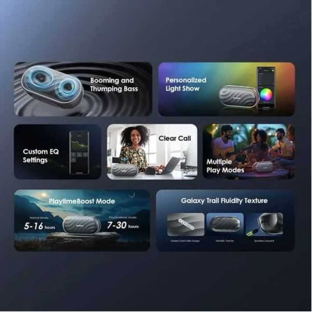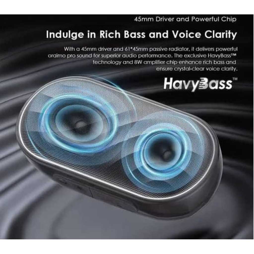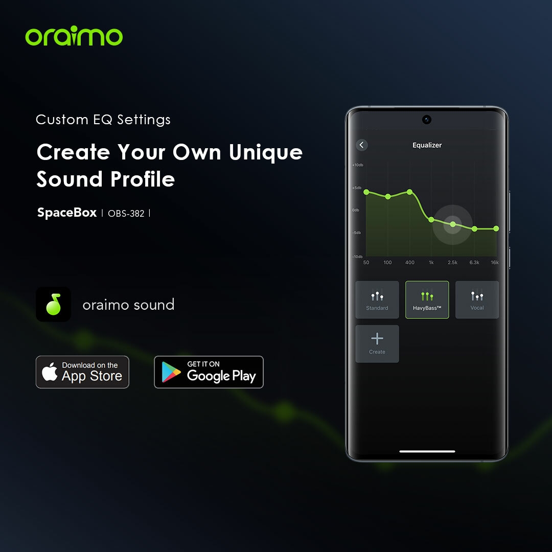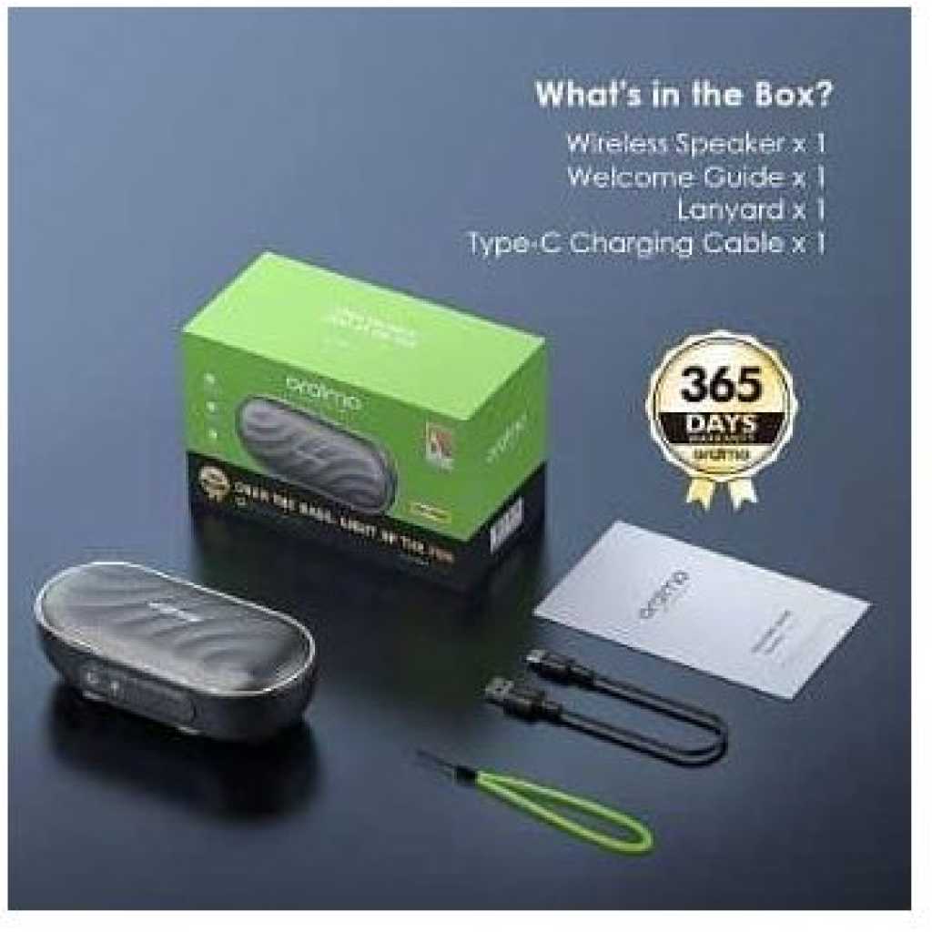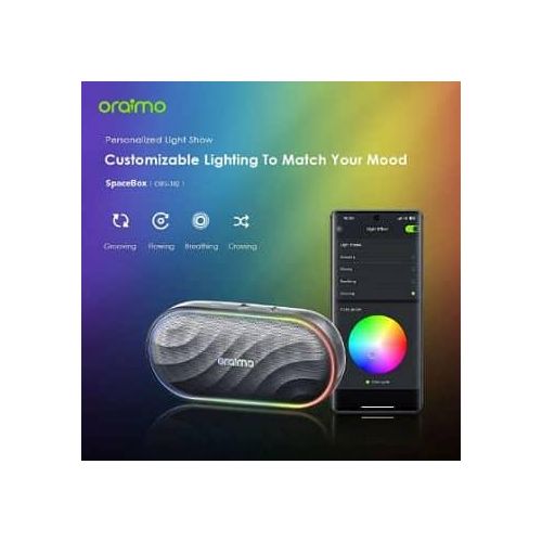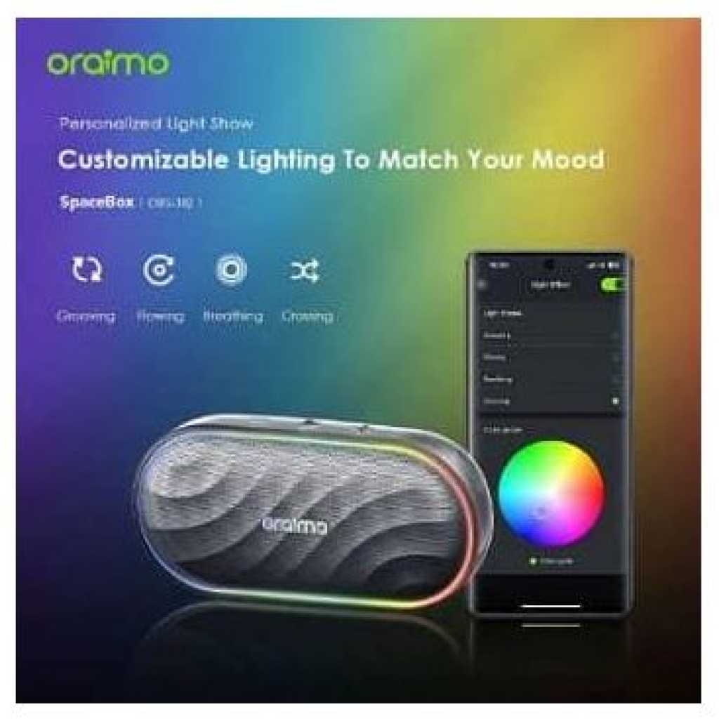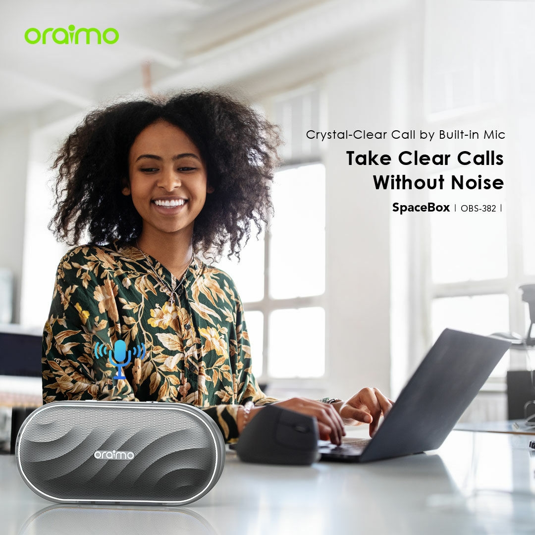 Product Parameters: Size: 146*72*50mm Weight: 280g Bluetooth version:V5.4 Battery Capacity:1800mAh/3.7V Frequency Response: 80Hz-20KHz Playtime: 5H(Max vol),16H(Med vol) Audio Output: 8W Transmission distance: 10m Material: Plastic&Metal Color:Space Grey Charging Input: Type-C Play Mode: BT, TF card, FM radio Model: OBS-382 Product Features: Booming and Thumping Bass Indulge in Rich Bass and Voice Clarity The oraimo SpaceBox delivers powerful oraimo Pro Sound with impactful bass in a compact design, featuring professional acoustic engineering and exclusive HavyBass™ technology. Personalized Light Show Customizable Lighting To Match Your Mood The built-in light ring naturally synchronizes to the music’s rhythm with innovative beat recognition algorithm, creating the perfect ambiance. Download the oraimo sound App to customize light themes and colors. PlaytimeBoost Mode Keep The Music Playing All Day Long Enjoy up to 5-16 hours of uninterrupted playtime supported by low-energy chipset and 1800mAh battery. Boost to 7-30 hours with PlaytimeBoost Mode in the oraimo App. Normal Mode: 5-16 hours PlaytimeBoost Mode: 7-30 hours *oraimo Lab test results. Actual performance varies on volume, content, and light theme. Custom EQ Settings Create Your Own Unique Sound Profile Select from preset EQ settings—Standard, HavyBass™, and Vocal—or customize your bass, mids, and treble with oraimo sound app. Galaxy Trail Fluidity Texture Elevate Your Style Effortlessly The sleek, eco-friendly metallic finish, inspired by the infinite flow of star trails, adds elegance to any setting. Easily hold with one hand or carry with the included lanyard. Crystal-Clear Call by Built-in Mic Take Clear Calls Without Noise Featuring a noise-canceling microphone that ensures crystal-clear calls by filtering out background noise and eliminating echoes, even during your favorite tracks. Built-In FM Radio Stay Connected with Your Favorite Stations With SpaceBox’s built-in FM radio, easily tune into your favorite stations for music, news, and talk shows anywhere, no internet needed. Multiple Play Modes Easy Pairing, Various Playing Bluetooth 5.4 Memory Card Support Enhanced FM Radio What’s in the Box?